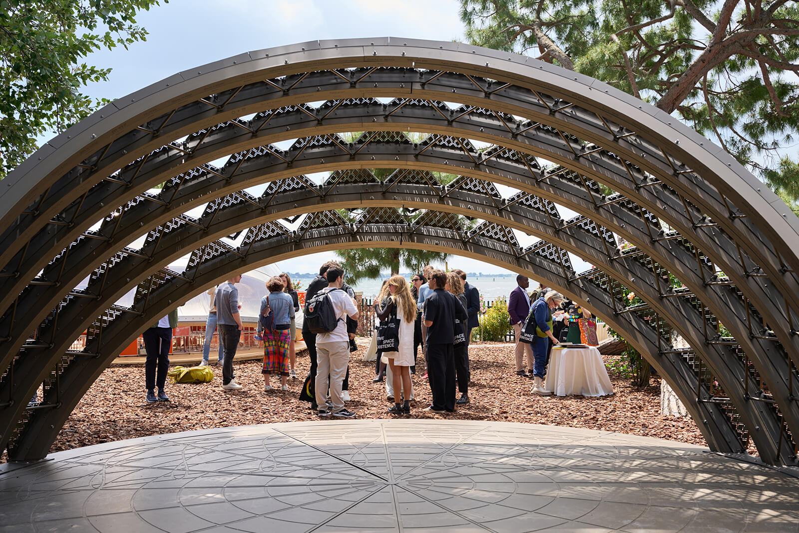 In unEarthed / Second Nature / PolliNATION, a collaboration between Virginia Tech and Cloud 9 Architecture showcases how architecture can support pollinators to restore biodiversity in the lagoon. An ephemeral observatory in the gardens is paired with an organic presentation in Palazzo Bembo, where a whole room is overtaken by live specimens set within a brightly coloured grid structure, creating a scene composed of lush greenery. These parallels serve to link the various sites, encouraging dialogue and a natural pathway that sees visitors move from one area of Venice to another.