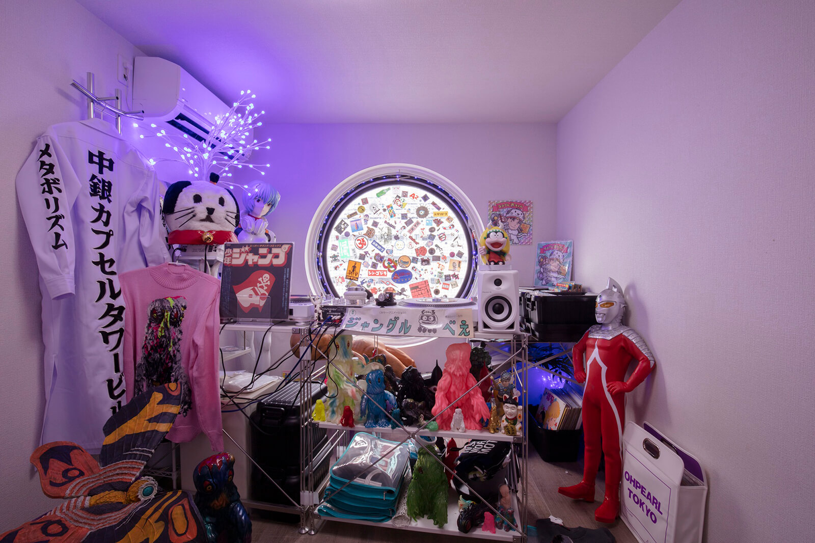 Following its separation from the Nakagin Tower’s service core, Capsule A1305 has taken on the properties of an objet d’art when seen from the street. Kotsioris described the capsule as a “pure white modernist object”, whose outline becomes legible through the “splash of pop colour” imparted by the gallery’s coral pink walls (the original colour of one of the tower’s stairwells). According to him, this arrangement mimics the tower’s meandering service core, making visitors feel like they’re “trapped in the stairway” in an abstract sense. But instead of the capsules surrounding the stairway, the stairway wraps around the capsule. Such an inversion of the bond between the capsule and its anchoring structure is only possible because the capsule is a de facto, independent modular unit. And on viewing the capsule up close, it becomes clear that this autonomy supports an additional function. Mirroring how it was designed as a customisable blank slate for a future user, Capsule A1305 too became an empty canvas on which the curators could paint a picture of a past occupant.