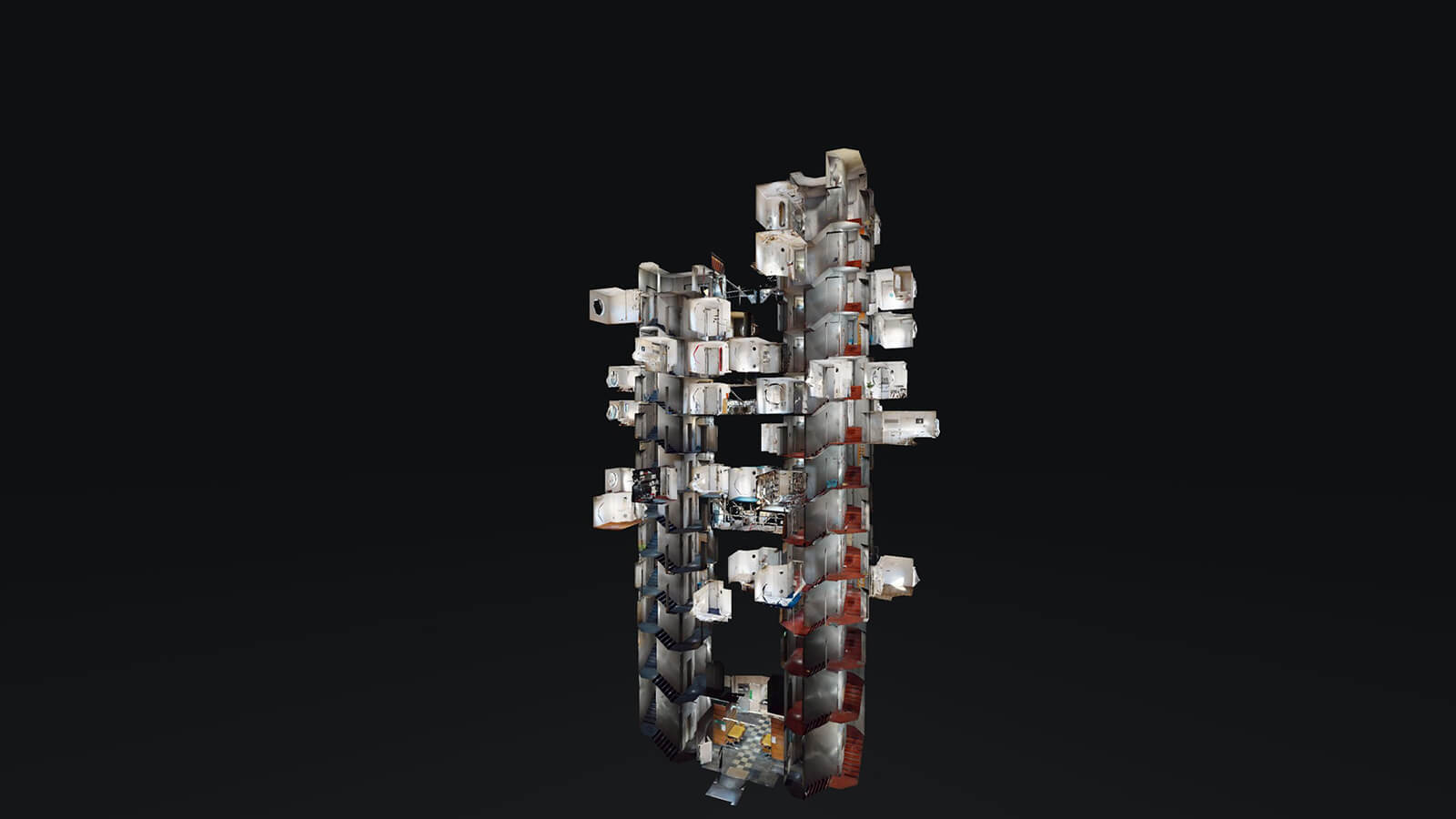 But we know that’s not what actually happened. Days before the building’s demolition, a group of former residents salvaged capsules that were still in good condition (some have found new homes in cultural institutions across the world). They partnered with Yuta Tokunaga, a specialist in 360-degree architectural documentation, to create a digital model of the tower’s interior using photogrammetry. The model is on view in the exhibition as an interactive 3D map, allowing museum visitors to wander through the Nakagin Tower’s lobby, explore its dimly lit stairways, inspect the faded paint on its walls and even gaze out at the Tokyo skyline through a capsule’s porthole window, rendering perhaps a more accurate view through digital fragments.