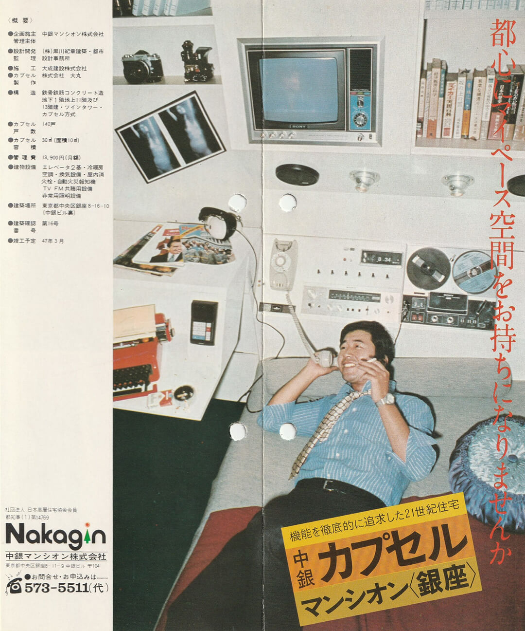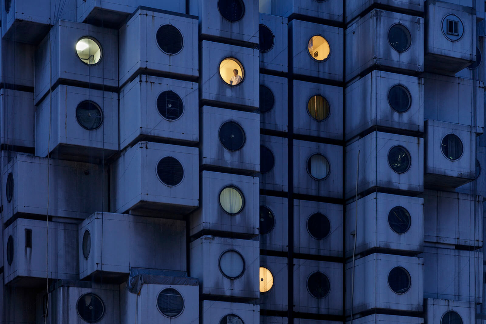 An icon of the Metabolist movement, the Nakagin Tower’s pixel-block silhouette once marked the southern gateway to Ginza—an upscale commercial district in Tokyo. Commissioned by the Nakagin real estate company, the tower was built to provide pied-à-terre accommodations for commuting businessmen, and it was designed by a team of architects led by Kisho Kurokawa. Kurokawa was the youngest founding member of the Metabolists, a group of Japanese architects and theorists which included the likes of Kiyonori Kikutake, Fumihiko Maki, Masato Otaka and Noboru Kawazoe. They released a rousing manifesto in 1960 declaring that “human society is a vital process” and that “design and technology should be a denotation of human vitality”. At the time, Japan’s fast-moving cities were expanding rapidly to support increased urban migration amid land shortages and a postwar economic boom.