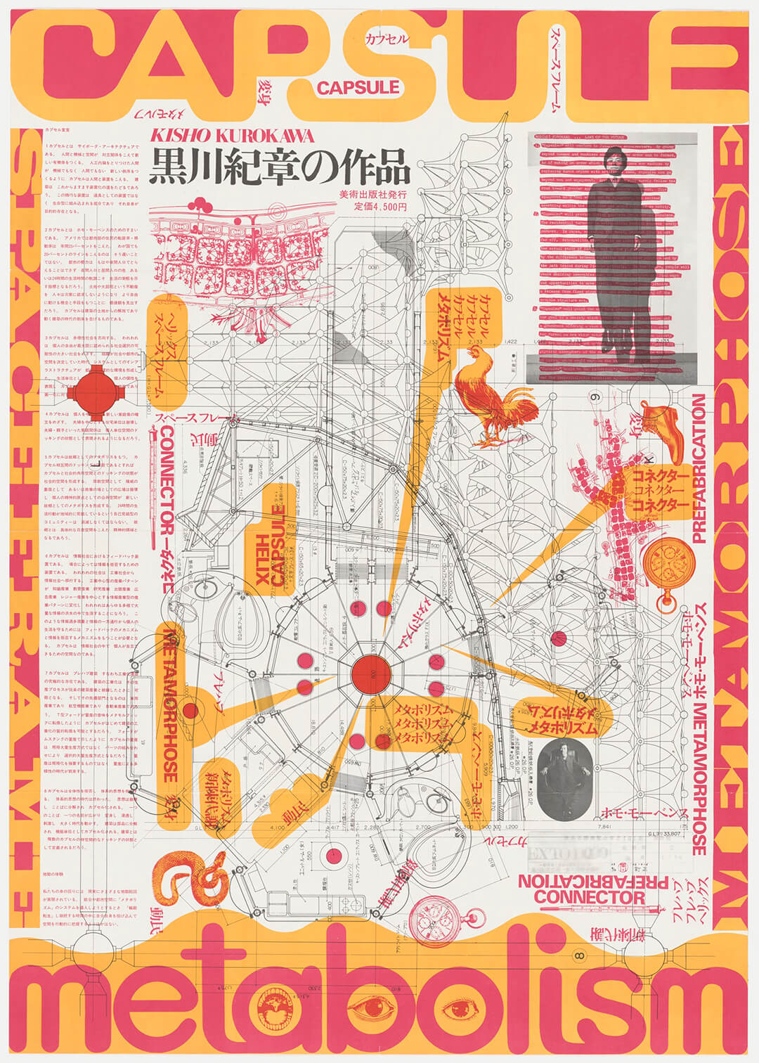 The opening segment of the exhibition delves into how Kurokawa’s version of ‘capsule architecture’ married this Modernist notion with the thematic biomimicry and impermanence of Metabolism. In the exhibition gallery, a bright orange room divider hosts a fold-out poster featuring Kurokawa’s seminal Capsule Declaration (1960) text, alongside drawings for the ‘Capsule House’ Theme Pavilion at Expo ‘70 in Osaka. Kurokawa envisioned capsules as ‘independent shelters’ for individual users that were prefabricated and docked into larger structural systems. This kind of architecture could transform and expand infinitely, with its autonomous fragments coalescing into a larger whole, like cells combining to form tissues and muscle fibres. In Kurokawa’s own words, capsule architecture was “a group form which expressed the individuum”.