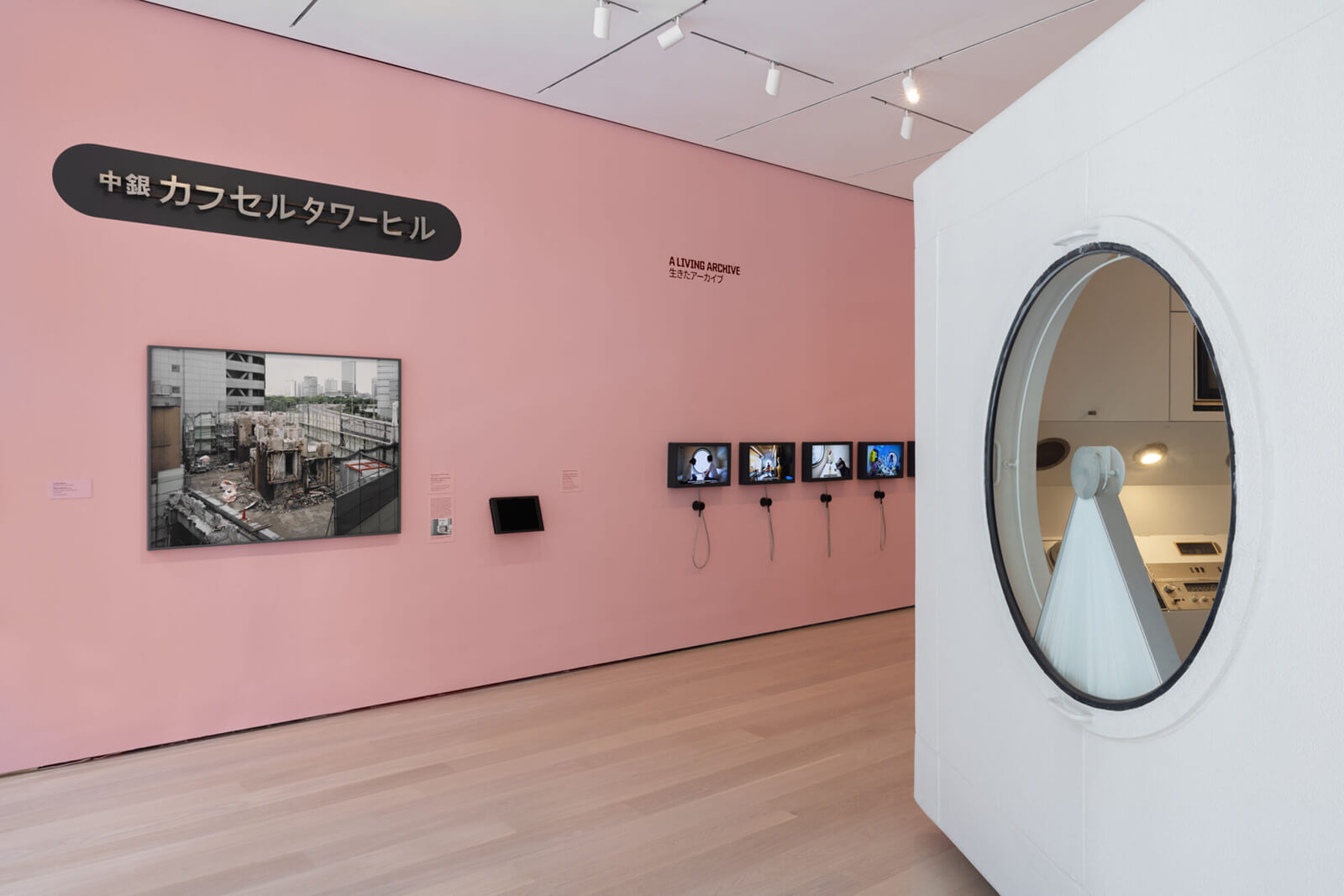 To depict the relationship between the tower’s design and the lived experiences etched into its structure (as well as derived from it), the curators split the architecture exhibition into two segments. The first covers the tower’s design and construction process, illuminating how the design team—which included architects Nobuo Abe, Aiko Mogi, Koji Shimosawa, Kenjiro Ueda and engineer Gengo Matsui—dreamt up the kinds of lives the building’s future tenants would lead. Their design prescribed a particular way of life for the tower’s users. Kurokawa, like many Japanese architects of his generation, had imbued his architecture with prescriptive (and sometimes inflexible) design features, taking from earlier modernists, including the writings of Le Corbusier. Historian and critic Mark Wigley once summarised modern architecture’s prescriptive tendencies when he wrote that Le Corbusier’s Vers une architecture (Toward an Architecture) (1923)—a foundational modernist treatise—turns “a description of what is happening in modern life into a prescription of what should happen in architecture”.