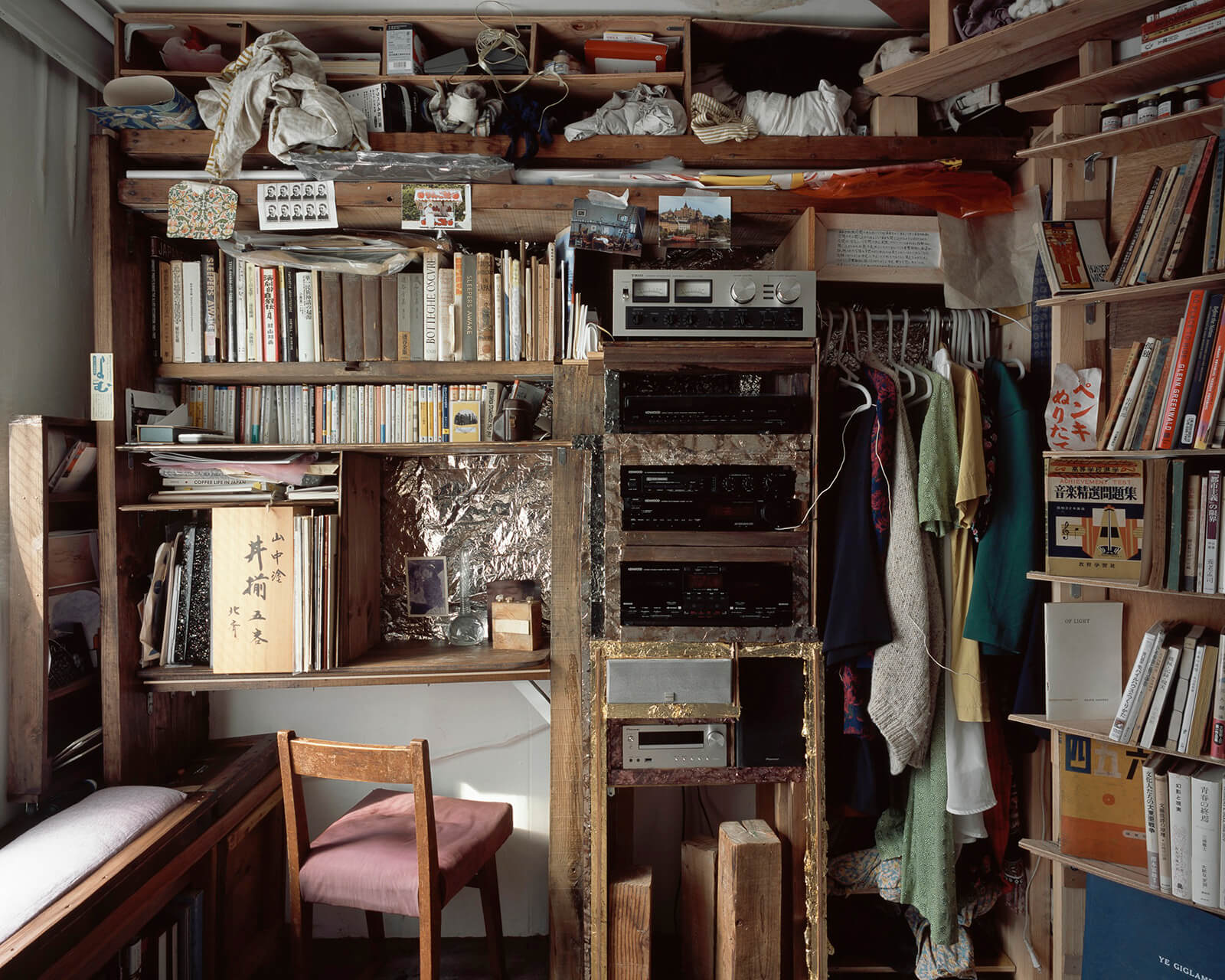 If the exhibition’s first section covers the Nakagin Tower’s birth and infancy, the following segment commemorates its adulthood, death and afterlife. Posters, memorabilia and video interviews with residents tell the stories of the building’s diverse inhabitants: a DJ, a former chamber of commerce manager, a designer, a filmmaker and a writer. All of them found versions of home and community within the capsules. Some used the living units as offices, and a few of the tower’s ‘pink’ capsules were also used by sex workers to conduct business. Echoes of these lived experiences linger in photographs from Noritaka Minami’s series titled 1972, which depicts the tower’s final years and culminates in images of its demise. These images render a portrait of a building that meant many different things to many different people. But can they authentically convey the many lived experiences that emerged from the Nakagin Tower’s architecture?