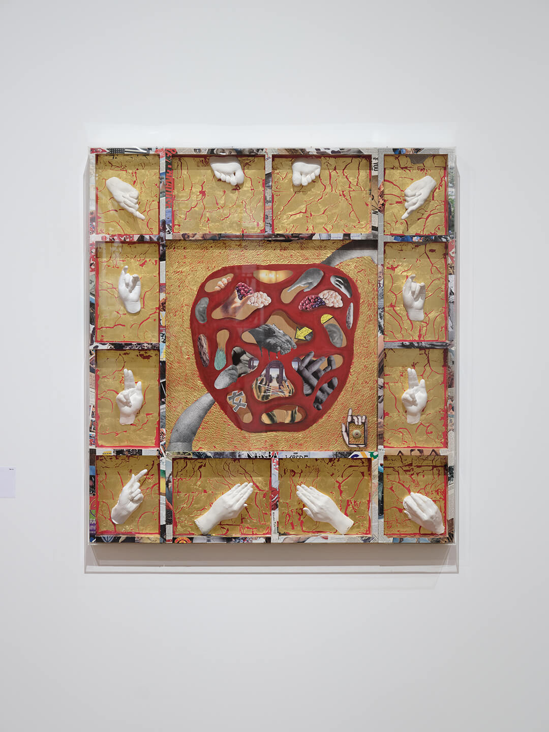 Against a backdrop of gold and red, a profusion of gestures. Plaster casts of hands point, hold objects and make sign language handforms. Each is positioned in a separate cube, together framing a central chamber in which more hands – this time collaged – reach into and through a porous, heart-like form. On the borders of the wooden structure, layers of print: advertisements, the artist’s name, the word NAKBA. Text and images, bodies and symbols. This is Tabe Mitsuko’s Sign Language (1996/2010), a multimedia work that explores modalities of communication in search of a radical, more-than-verbal language. Tabe (1933 – 2024) was a multimedia artist and key member of the Japanese avant-garde. A year after her passing, her artistic vision, anchored in social consciousness, serves as the foundation of For a Placard at the National Museum of Art, Osaka.