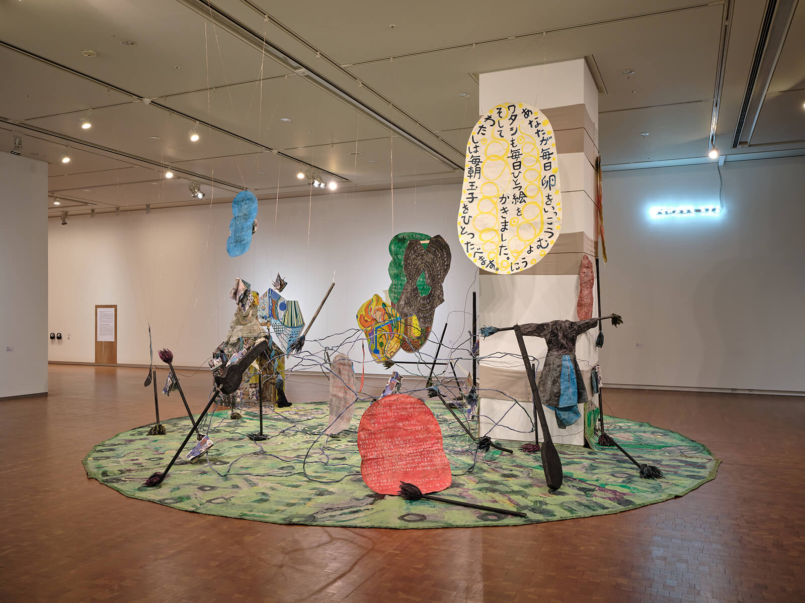 Given the profound tangibility of its titular form, materiality is predictably centred in For a Placard. As with Tanizawa’s work, Ushijima Tomoko’s Hitori Demo Tai: Even One Person Can Be a Team, also developed for the exhibition, presents a dreamscape in washi paper and konnyaku paste: oversized brooms, candles and brushes suspended alongside panels of text, a paper house and aluminium polyhedra. In contrast with Tanizawa’s more obviously polyvocal work, Ushijima’s piece seems to present a more solitary intervention: a domestic scene occupied by the titular single individual. And yet, the artist’s choice of materials – which were produced locally for bomb making during World War II – suggests a similar attention to the politics of paper, not just as surface but also as a tool.