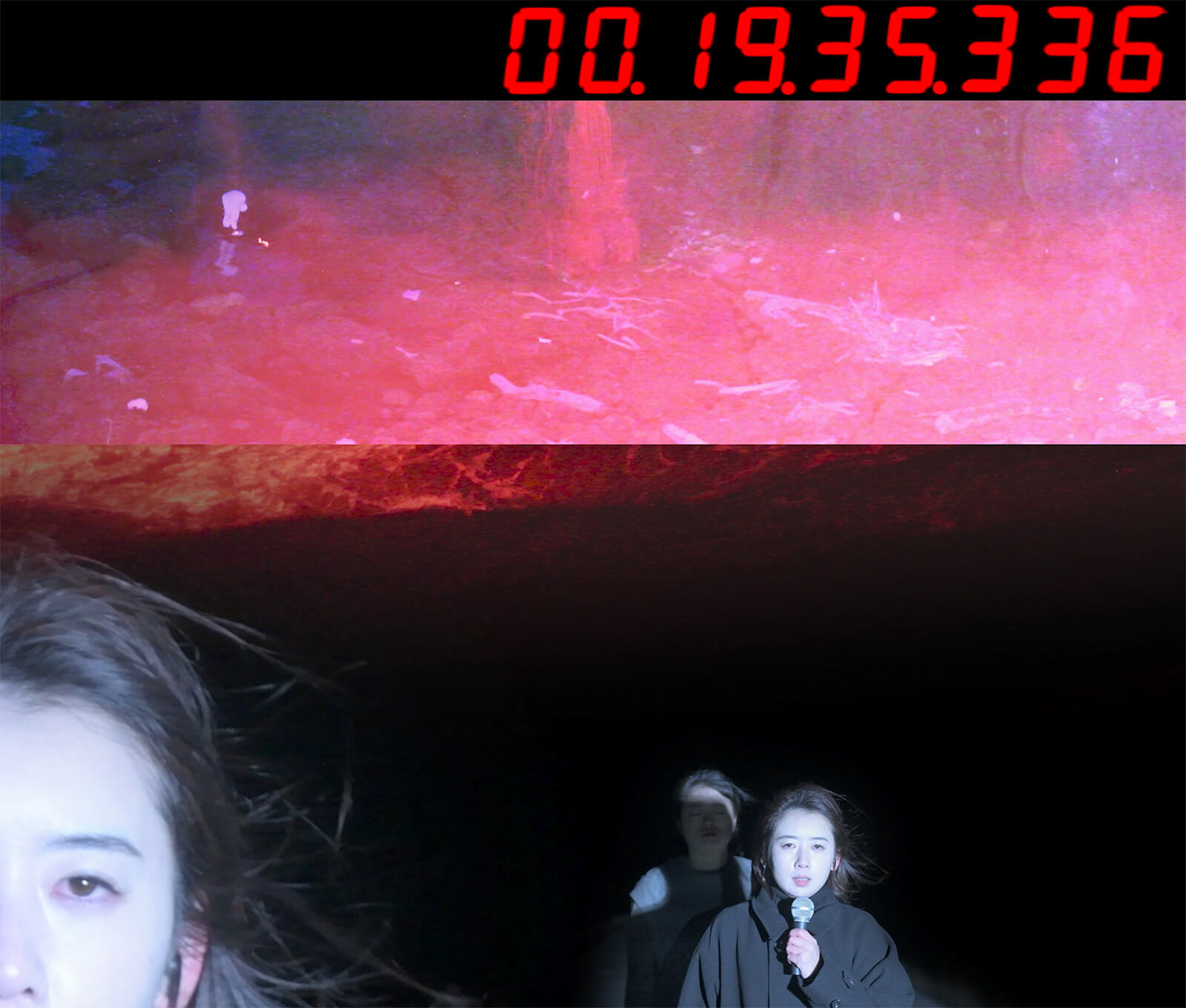 In a semi-partitioned space across from Tanizawa’s miniature placards is a work that retains their narrative thrust but inverts their scale – Shiga Lieko’s video installation When the Wind Blows. Shiga’s work is concerned with inequities of place, made manifest in the aftermath of natural disasters. Considering material and human losses in the Tohoku region after the 2011 earthquake, the single-channel work addresses the political foundations of regional suffering. In a pitch-black night, starkly illuminated figures walk towards the camera. In the lead is a woman with a microphone who narrates the region’s history of resource extraction and top-down reconstruction. Visibly battered by the elements, the strange procession serves as a visual and sonic reflection of Tohoku’s marginalisation, extending the temporal limits of disaster to include everyday forms of exploitation.