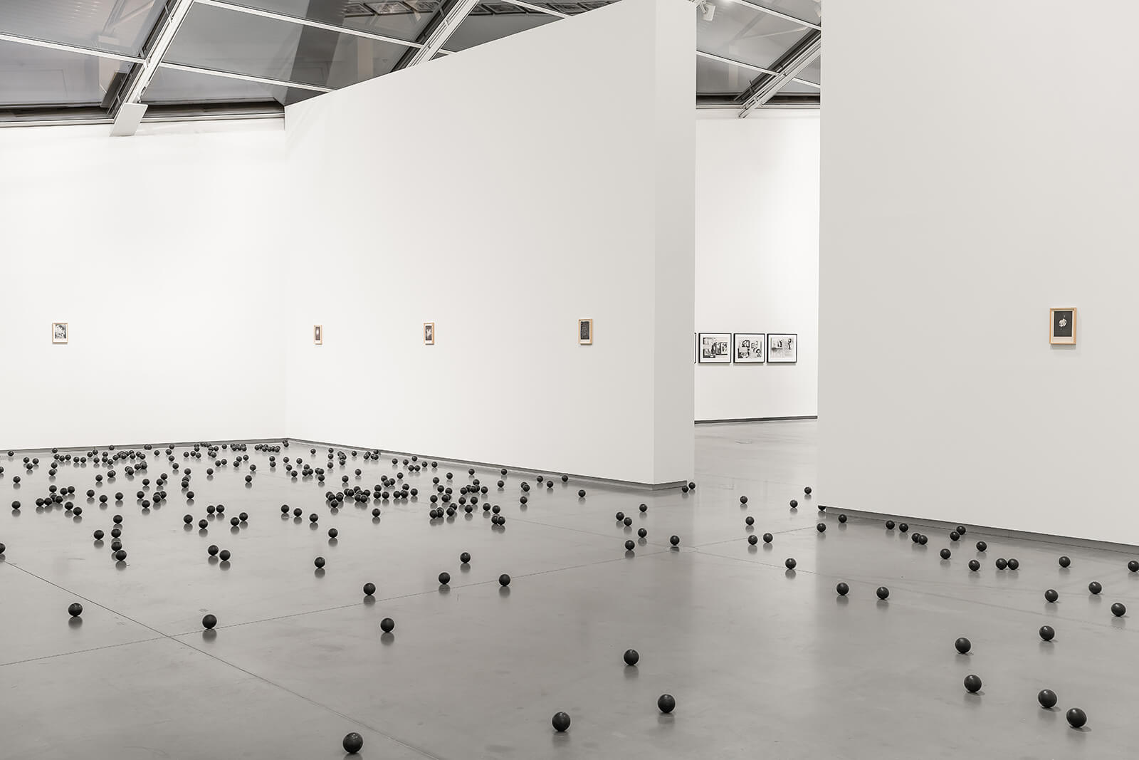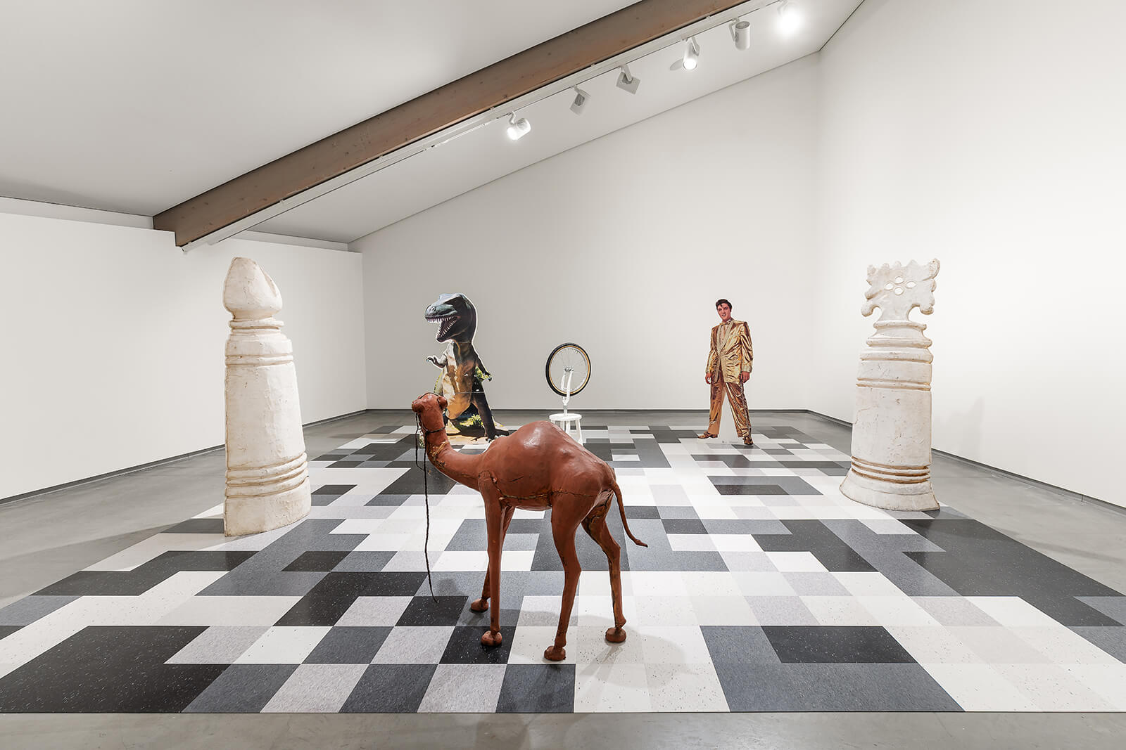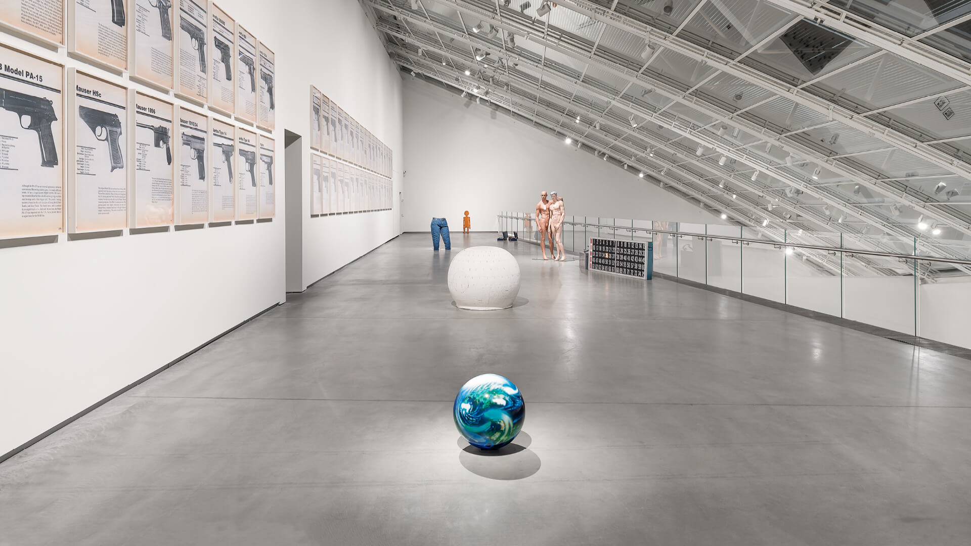 On the museum’s upper level, the exhibition touches more directly on Bacher’s deadpan dissection of American identity and power with nothing more than found objects. Many of these readymades—such as a pair of absurdly large Levi’s jeans, stuffed with polystyrene, or the enormous plush Big Boy (1992), a therapeutic doll for children who suffered abuse—feel like artefacts from a collapsed civilisation, but they also refuse to be monumental or mournful. FIREARMS (2019)—Bacher’s final work, completed just one day before her passing—consists of 58 framed pigment prints depicting guns sourced from a found technical manual, each accompanied by detailed specifications such as model, origin and dimensions. Appropriating neutral, factual material, Bacher reveals how weapons operate as symbols of power, fetish and commodification, particularly within the context of American gun culture. It’s also a culminating reflection on the uneasy intersection of beauty and brutality that runs throughout her practice.