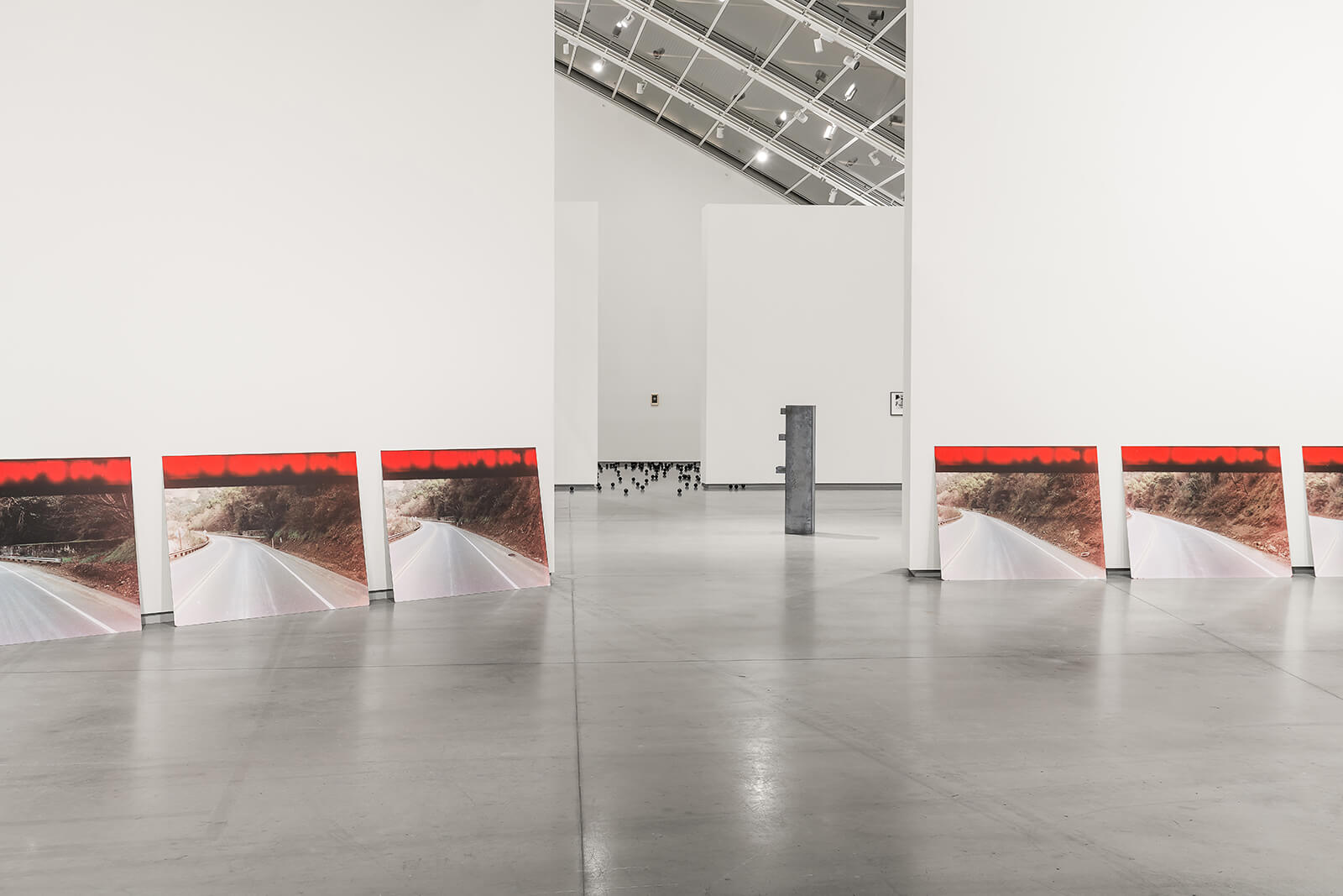 The exhibition’s dramaturgy must have been a challenge, considering Bacher’s legacy as an exacting exhibition-maker, and the curator’s deep engagement with the late artist’s thinking is evident. The first gallery sets the tone in hushed, ambiguous registers. The series of large-scale prints, The Road (2007), is leaned against the wall and unspools across the space like a memory too large to hold: a hypnotic work that pairs a relentless forward-driving motion with intermittent glimpses of roadside banalities, creating a kind of narrative stasis through perpetual motion. On the opposite wall hangs Smoke (1976), the artist’s only known self-portrait. Or quasi-portrait. The black-and-white collaged strips of photographs show a woman standing, sitting, smoking or drinking a glass of milk. It’s a performative gesture of self-inscription that feels both casual and impenetrable, a refusal to cohere into identity even as she offers her own image.