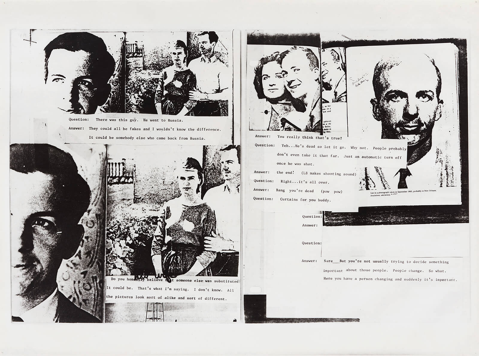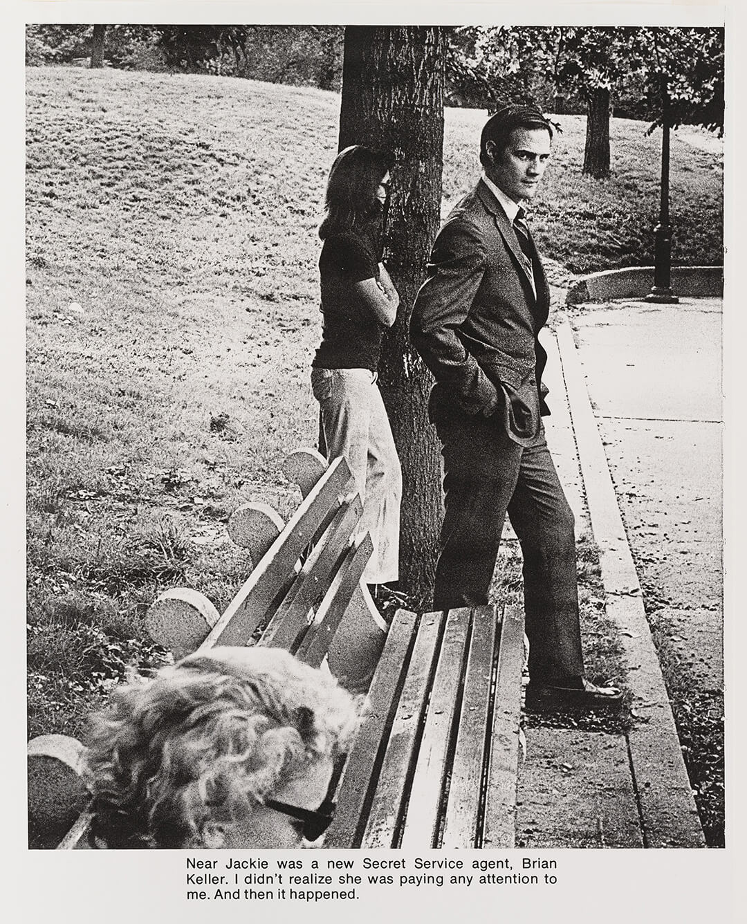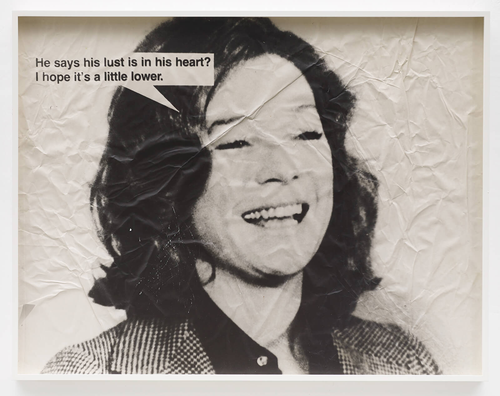 Nearby, Jackie & Me (1989) reproduces images and captions sourced from celebrity paparazzo Ron Galella, reconstructing his obsessive attempts to photograph Jacqueline Kennedy Onassis. Galella frames the chase as flirtation, imagining that Jackie, ever composed and elusive, is not fleeing his lens but playfully engaging with him. “The most desirable woman in the world wanted to be chased by me,” he declares. Bacher presents the material without comment, allowing the viewer to sit in the discomfort of his delusion. In doing so, the work becomes a quiet indictment—not just of one man’s projection, but of the entire apparatus of the invasive gaze. But also of something more insidious: the absolute unreliability of meaning produced when text and image are paired. So easily persuasive, manipulative to the point it cannot be unseen. And yet hardly reflective of fact.