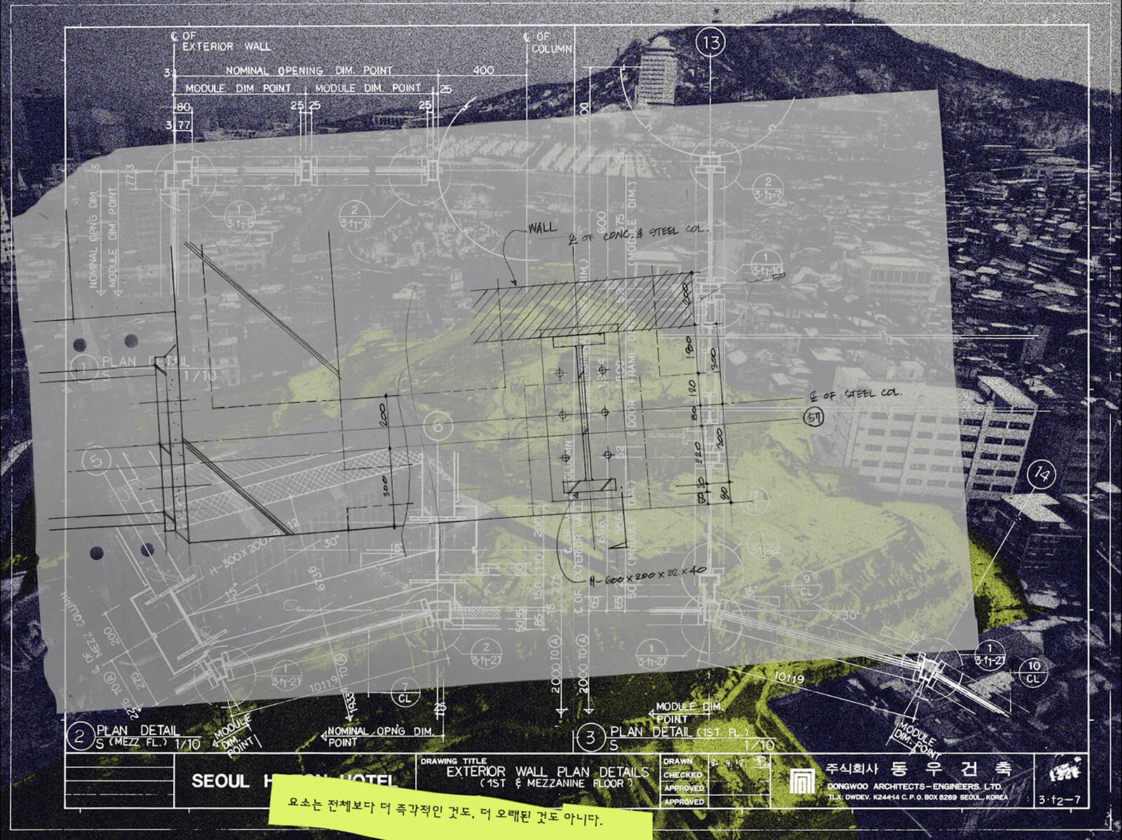 The Hilton was inaugurated in 1983, during a transitional decade in South Korean history – a time of vertical expansion, fervent internationalisation and an embrace of private capital. Both witness and embodiment of this moment, the hotel’s construction was part of a national strategy to promote tourism: it would go on to play host to large-scale events including the IMF-World Bank Annual Meetings, the ‘86 Asian Games and the ‘88 Seoul Olympics. Fittingly, the project was helmed by Kimm Jong Soung, a pioneering architect trained under Ludwig Mies van der Rohe and realised collaboratively by the Daewoo group and Hilton International, making it international in both intent and execution.