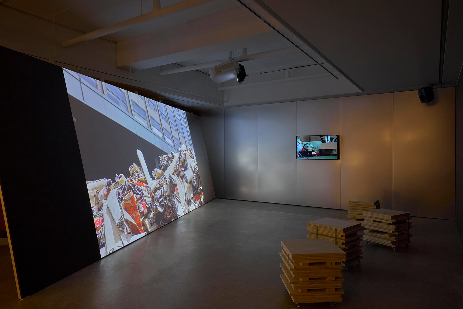 In this effort, The Autobiography of Hilton Seoul’s approach is both documentary and creative. The first section of the exhibition leads with the visual, the dark opening chamber lit by artist Jung Jihyun’s luminous, large-format photographs of the half-destroyed Hilton, the opulence of its proportions at odds with the piles of debris that fill it. In the far corner, a screen brings the viewer into the moment behind Jung’s images, displaying scenes from the Hilton’s demolition recorded by the artist group TechCapsule. Dotted throughout the exhibition space, Suh Ziu's mixed media sculptures transform reclaimed materials into experimental forms.
