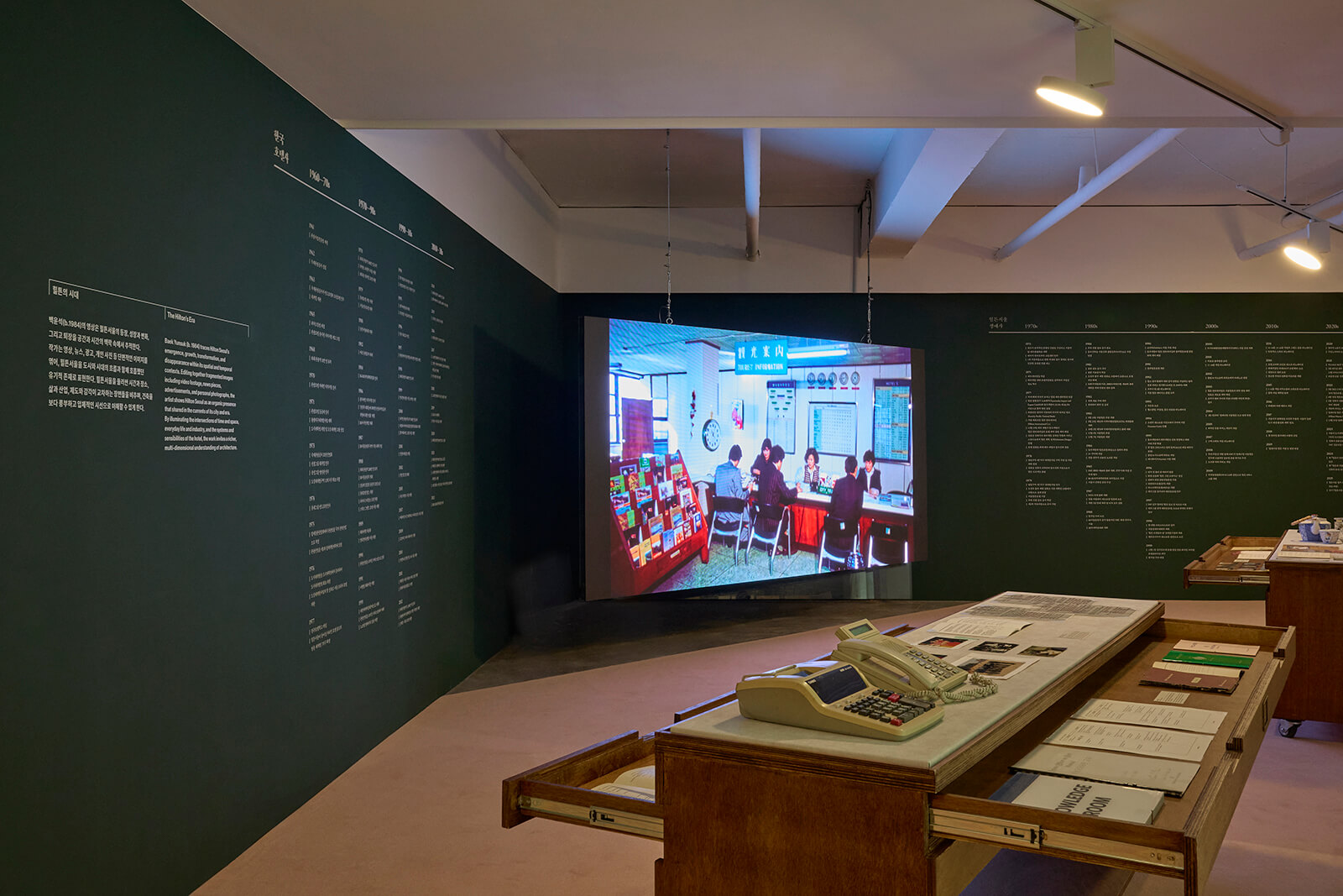 Alongside the material foundations of the hotel are the more humble, yet deeply resonant, materials of its everyday functioning: correspondence, blueprints, photographs. Platforms suspended throughout the space present typed letters between Kimm and his American counterparts. Renderings for visitors to pore over are laid out on a set of long tables. Repurposed hotel furniture presents materials from the back of the house: uniform manuals, menu cards and room keys, interspersed with photographs of employees at sports days and training programmes. Staged alongside and in conversation with these materials are further artistic commissions: Noh Songhee’s Noitilomed, a video work that layers dozens of letters, architectural drawings and photographs to create a rhythmic record of the Hilton’s construction; Baek Yunsuk’s City Portrait, an archival montage of ribbon cuttings and diplomatic missions that captures an optimistic era of internationalism.
