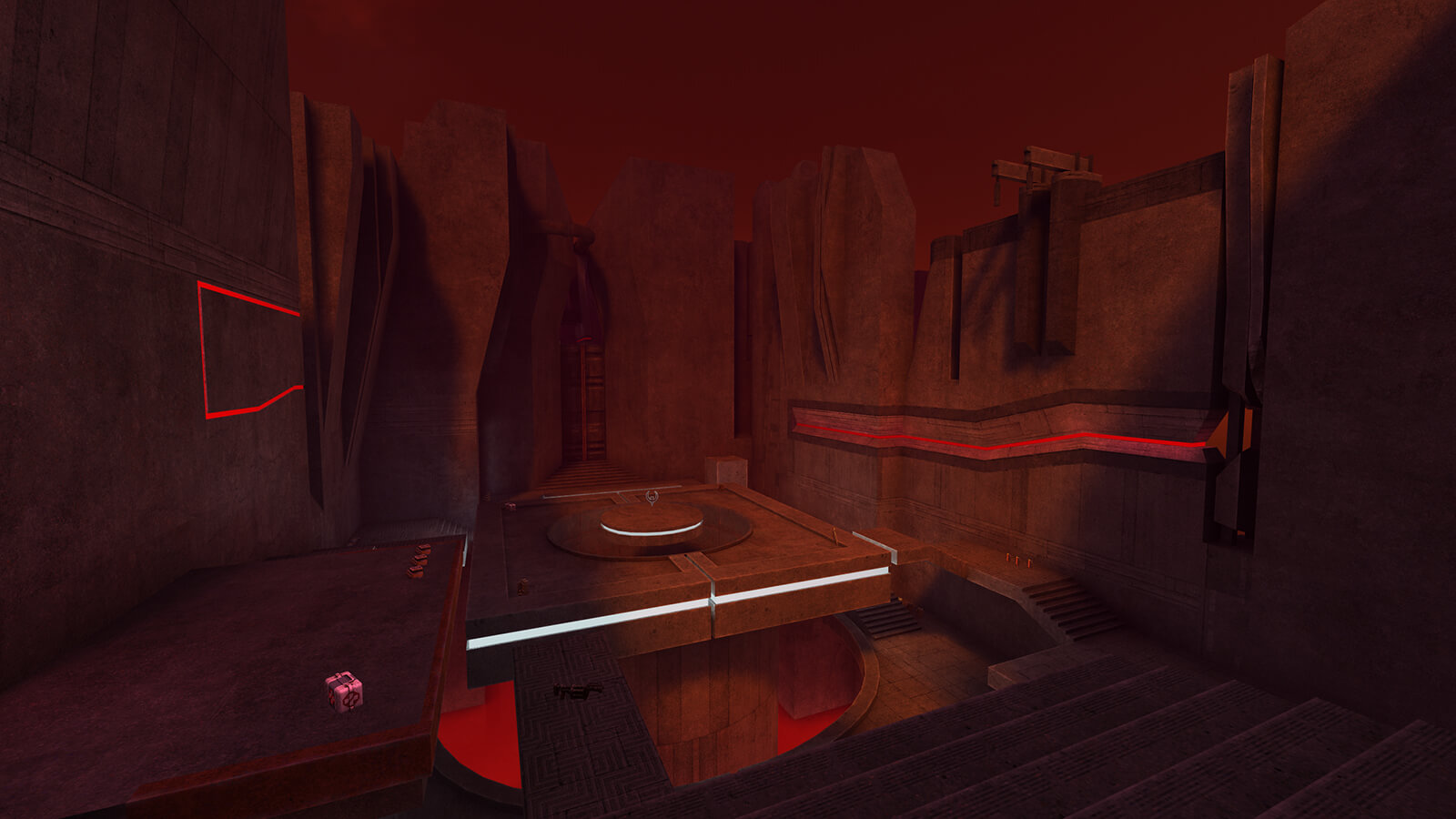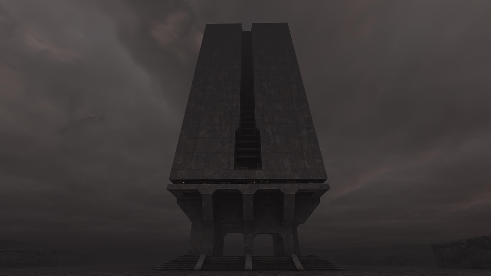 Level designers exploit the rigid, monumental qualities associated with Brutalist architecture and its authoritarian overtones, creating layers of disorientation, paranoia and oppression for the players. For instance, the hub map4, Ruinous Stone—designed by Hale, featuring a secret area designed by Fleming—shelters a deep, dark cavity of flesh within the ground, which leads to a contrasting series of well-lit spaces that serve as the entry point for all the community-designed maps. The map features a massive monolith that creates the impression of constant surveillance and imposes a lack of free will, offering only one way out of the situation. The digital architecture demands action and reaction, becoming a persistent condition across all the maps of QBJ III. Qualities of Brutalism that often put it under scrutiny—its rigidity, hostility and indifference to comfort—here begin to operate legibly under these conditions, directing the course of action.