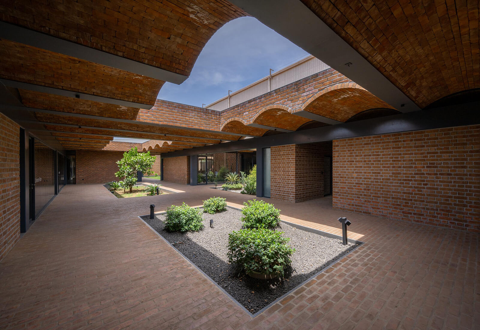 Among the shortlist, the design of a warehouse and offices in Mexico by ATELIER ARS uses brick as a means to situate it within a 'landscape of fire', referring to the volcanic terrain of the site; the terracotta hues blending into each other. The distinctive sawtooth roof profile immediately allows the design to be discernible for its function as an industrial undertaking, especially when juxtaposed against an otherwise hefty footprint. The thread of contextuality with respect to cultural as well as natural landscapes is similarly echoed in the other project from Mexico, the Mezcal Production Palenque, conceived by Estudio ALA. Emphasising participatory principles along with the continuity of local building traditions, the Mexican architects note their use of brick as meant to foster a “grounded, human-centred industrial space”.