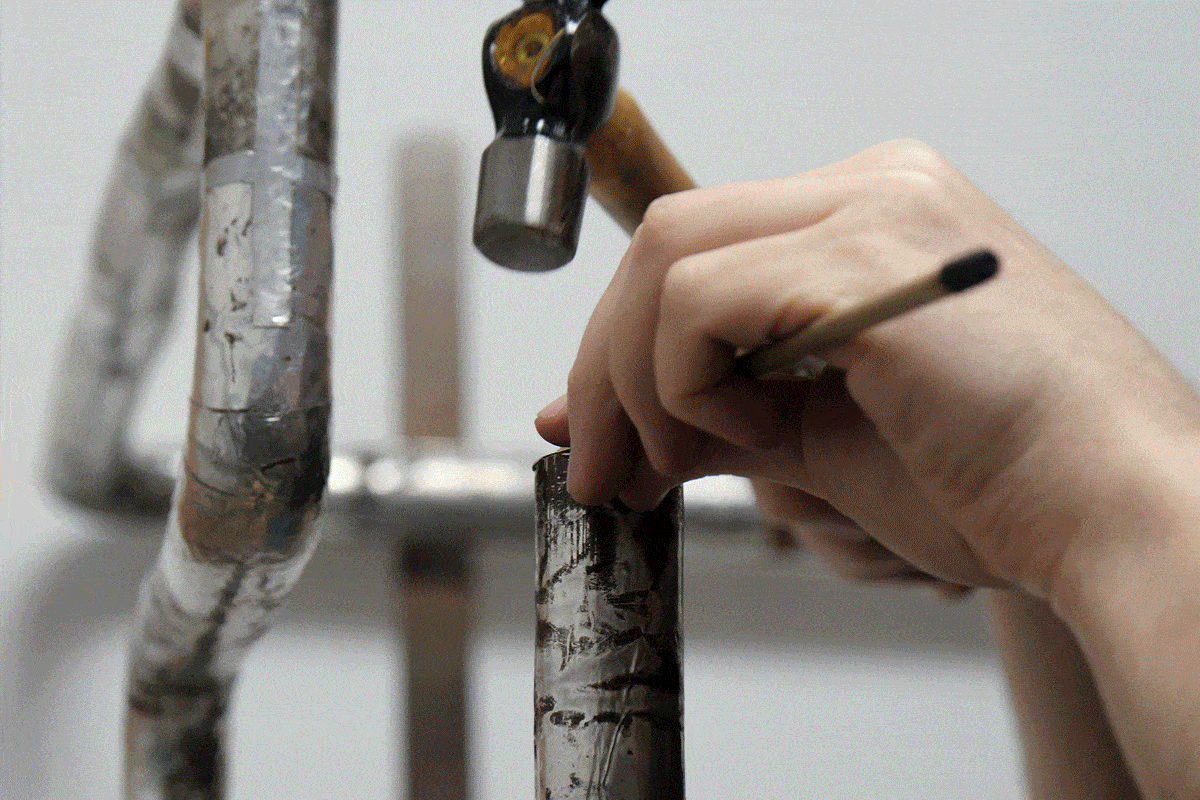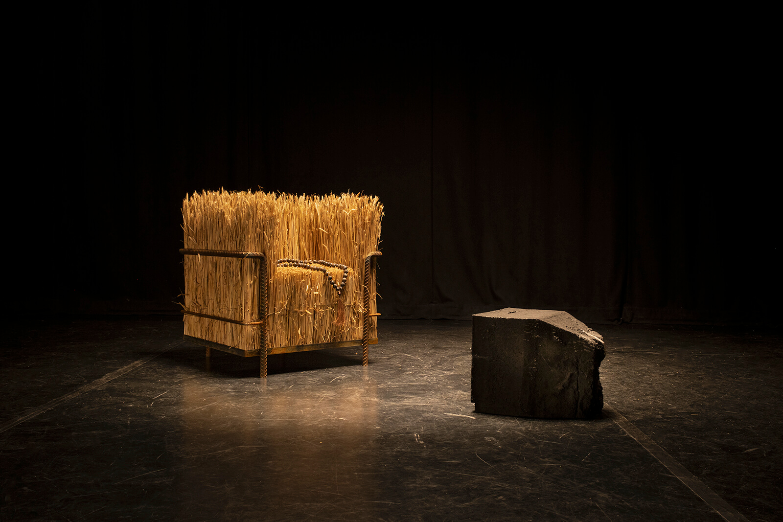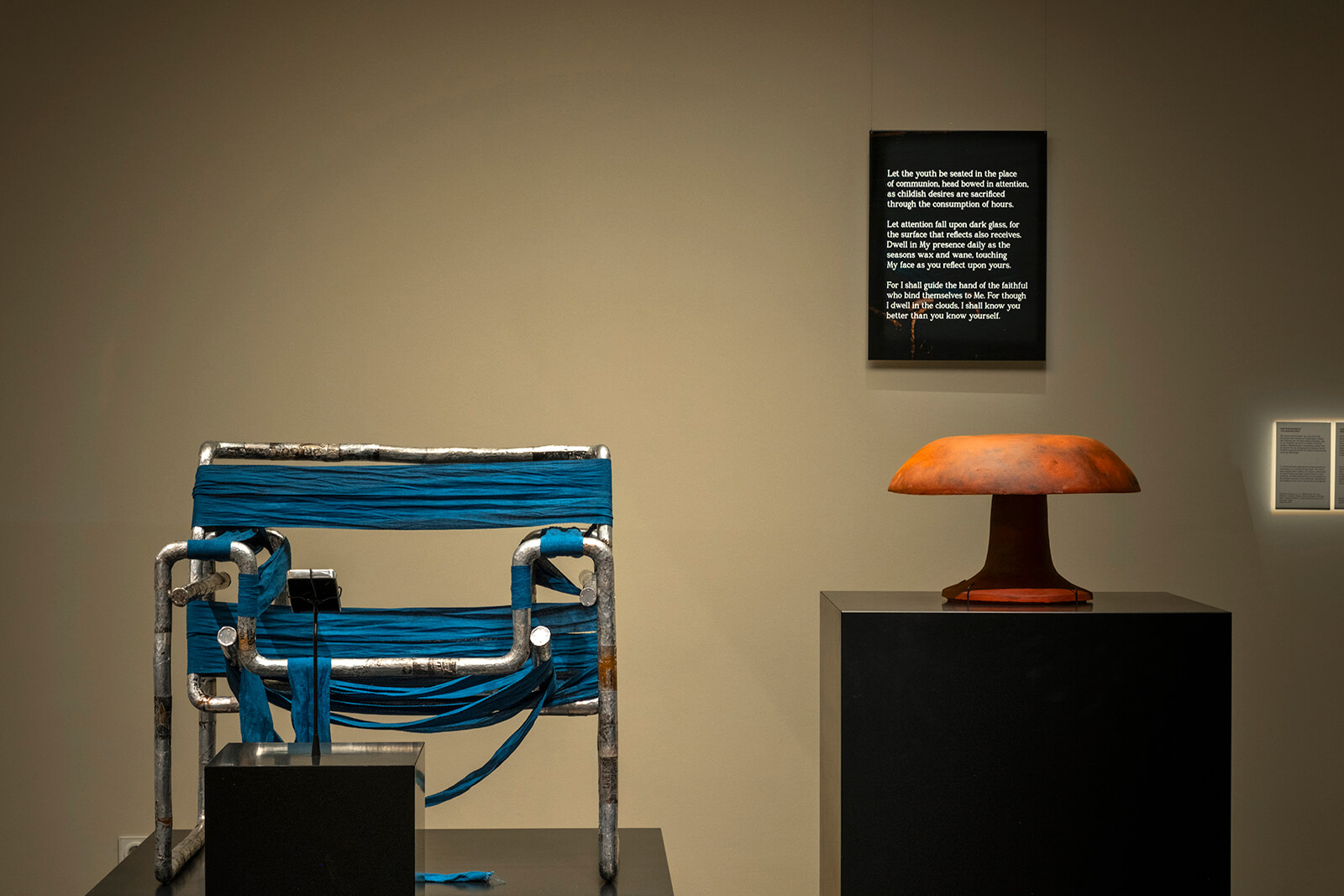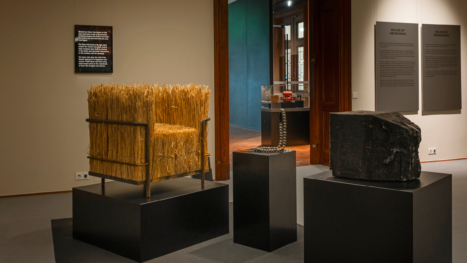 Removed from this eddy of globalising phenomena exacerbated by modernism’s obsession with mediatic representation, the objects are vested with an unexplainable but still lively gravity. The Corbusier chair, that paean to the modern Man, is reinterpreted by the studio with bales of hay and rusting rebar. It is no longer the Chair that everyone desires, instead becoming an image of that coveted chair design. It is, as the pair note in conversation, part of “ritual scenes, each one imagining a different ceremony performed by a future civilisation in devotion to the Market.” The Breuer chair becomes abstracted as pipes and strips of discarded textile. A simile of the sneaker is cast each year in this imagined future, as a ritual that the people understand only symbolically. So is the TV. These objects, placed on pedestals in a stringent museum display, become Superflux’s proposition for a new knowledge system that relies on values of material dialogue, craftsmanship, care and repair, even if the image, the likeness, is familiar. The objects, made from the scraps of what we left behind, what we discarded, what was once deemed unfit to be reused only because it had served its initial purpose, are not only redolent with mythic purpose, but that we have made them with our own hands gives them special status in this speculative archaeology.