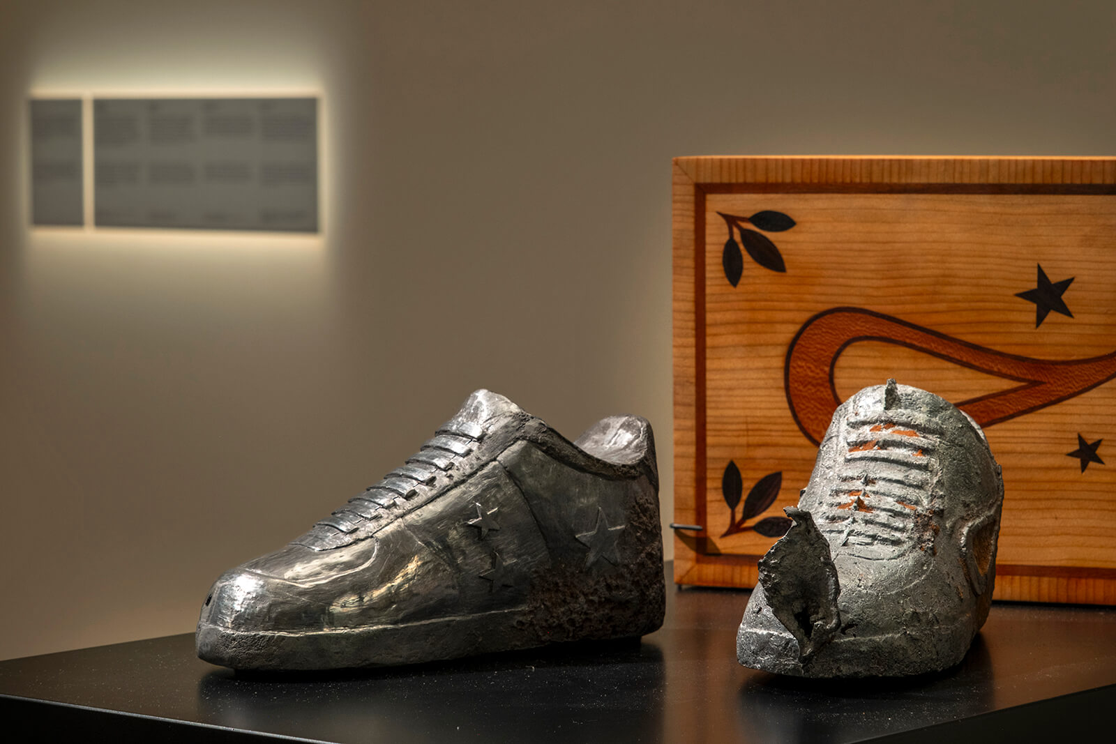 Recontextualising objects of consumer culture, from the omnipresent sneaker and smartphone to the aspirational Corbusier chair, as devotional objects for Relics of Abundance, the pair suggest what might shape our future myths. “This work is about humility. About seeing ourselves clearly by stepping outside ourselves,” they note. So, the Corbusier chair, once a signifier of taste and a certain class, the sneaker, a banner to a certain cultural cache, become mythologies, covertly signalling what has become of our market culture: the global supply chains, mechanical reproduction, the dizzying choices we are presented with, all in service of the new that never arrives.
