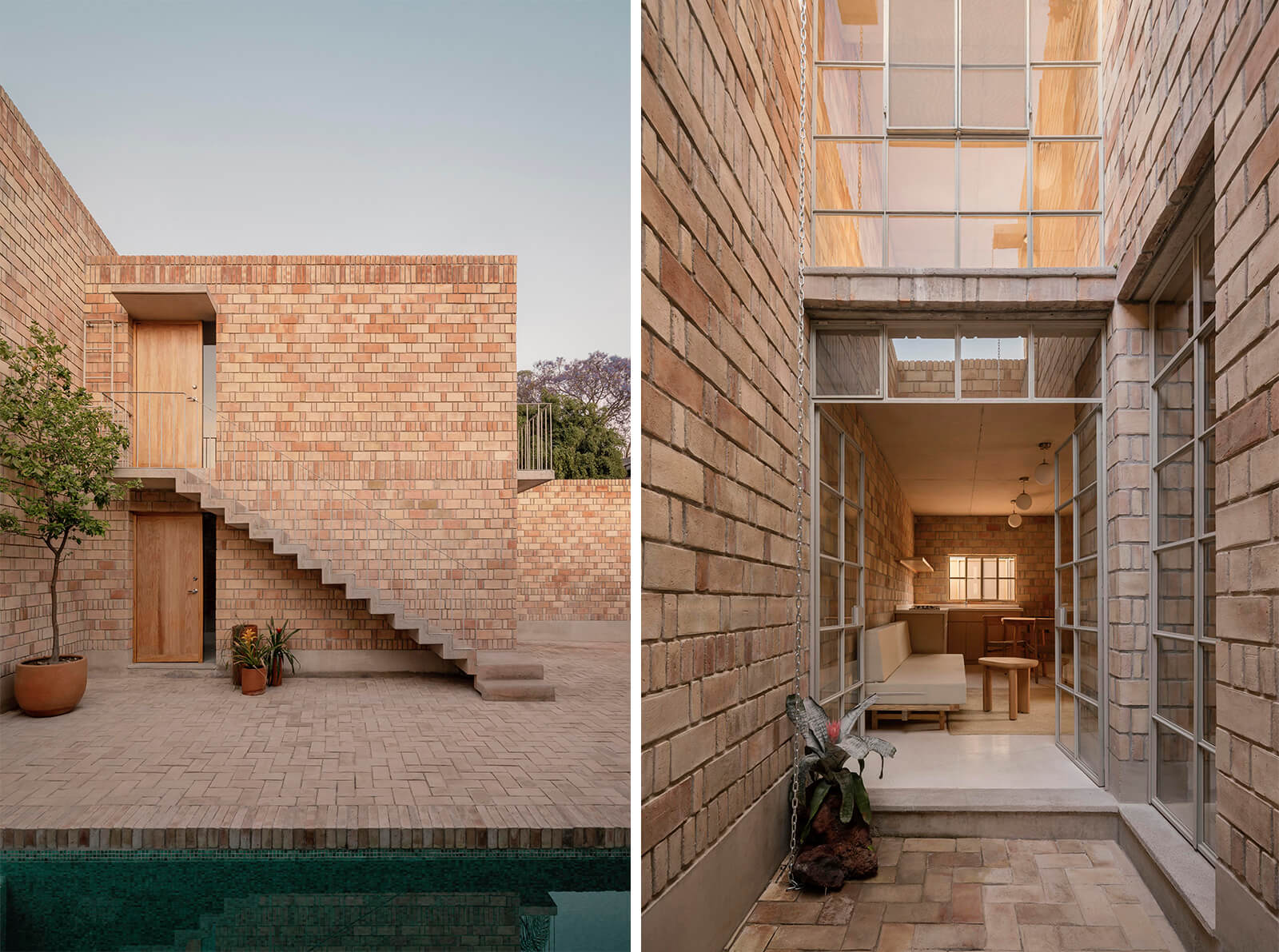 The same principle guides White Bricks House by Bloco Arquitetos, who highlight the artisanal process of construction by masons-craftsmen. The project stresses slow, crafted methods over fast-paced assembly. Further, the architects note that the use of bricks (which were designed specifically for the house) is meant to echo the material language of public buildings in Brasilia, hence symbolising a particular formalism. An almost similar language—articulated through form and material—emerges in Mountain House by Chris van Niekerk. Appearing as simple blocks amidst mountainous terrain in Cape Town, the residence attempts to camouflage itself through the use of monotonous materials—from the brickwork to the granite floors. The use of a singular colour affords the project a cohesive, clean profile that is not instantly recognisable as brick. Adding a sense of dynamism to this cohesive visual language, the project from Mexico, Los Guayabos by Rodriguez + De Mitri, is a play of solid and void. The solidity of the brick facade is complemented by expansive glass partitions, facilitating a sense of openness to the narrow site.