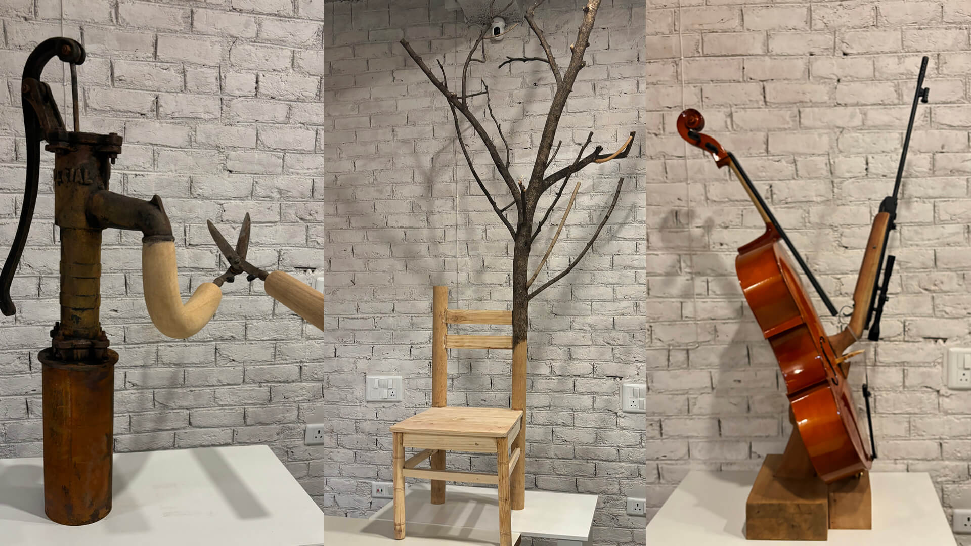This two-faced world, entangled in contradiction – is it possible to place it in a physical context? Through a union of conflicting items, All the Beauty in the World examines something of its daily paradoxes—examining, so to say, the difference between an object’s original intent and its eventual form—between the individual object as noun and the dual object as verb. When daily items are absolved of function, they gain in new unintended meaning what they lose in usefulness. A cricket bat extends into a rifle; a clothes iron supports an axe as a handle; a chair merges with a table and another emerges from the root of a tree. When things are provoked into accidental fusion, obsolescence, exaggeration and subversion are but expected. Does the axe on the iron herald domestic violence? Does a rifle turn the cricket bat into a blood sport? Is the bicycle pump as thoughtful a performer of the trumpet as a musician?