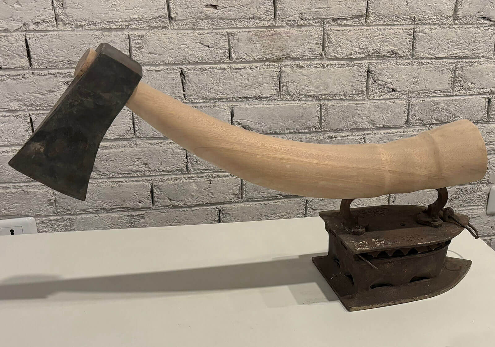 Art often explores the paradox of goodness and wonder undercut by a tone of violence, ever-present and ever-lurking—in family matters, in relationships and in public life. The paradox follows us everywhere. We give in so completely to contradictory moments of complete dereliction and utter beauty, sometimes in the space of the same day, in the shape of the same object. The iron with the axe handle is not an all too subtle allusion to domestic violence, but such fusions do create the blunt message—a message all the more obvious when the axe is monumental and menacing. But blunt directness is the advantage of not disguising the objects into rendered pieces of sculpture, and using them as they really are. I often wondered if I had resurrected the fused objects in bronze, would they have lost their impact, the element of surprise that comes with their identification as real? Muddied by the medium they were clothed in, would they lose something of their message, but become better works of art? I knew then, they had to be real, things held, seen and heard, each describing its own ritual, things of our own time and geography. They had to be part of our cultural habits.