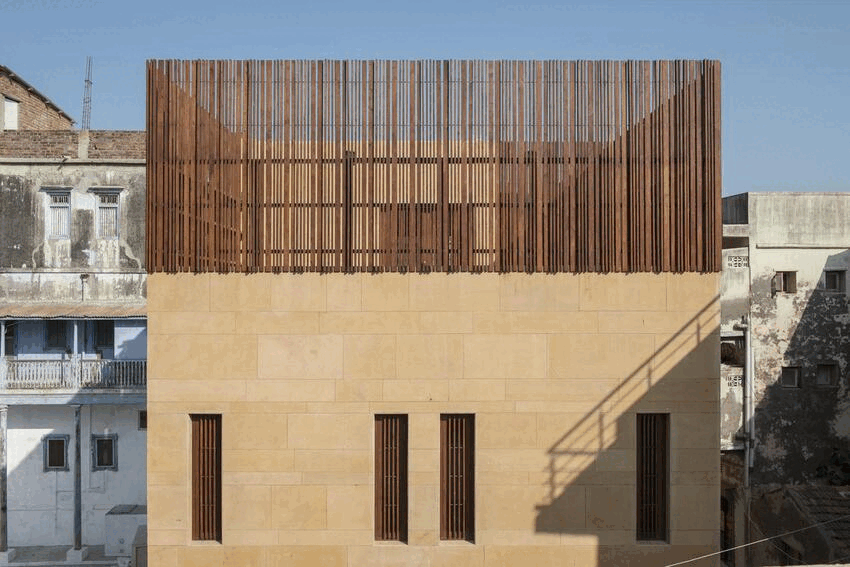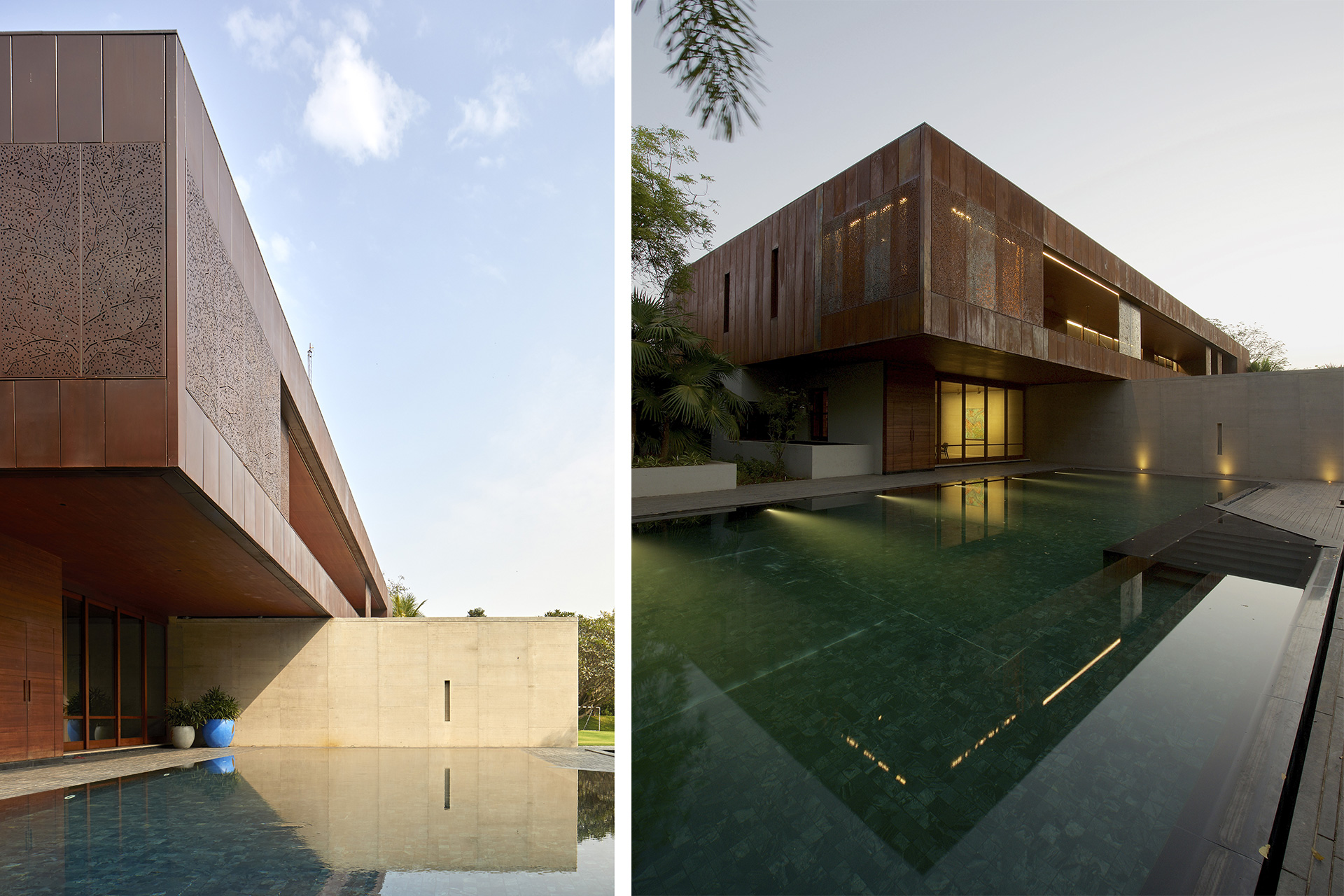 On the outskirts of Ahmedabad is Diya. A cacophony of materials that are carefully layered, the architectural skins are equal parts functional as they are experiential. Panjabi explained, "The Corten box is an attempt to protect the inner shell from the searing heat of Ahmedabad, a ventilated facade. The jaalis make a reference to Sarkhej Rauza, and the sliding screens allow further control. This box sits lightly on rammed earth walls, which have a high thermal mass, and helps keep the inside spaces cool. Every tree that existed, has been retained and celebrated. Tactile, materials, textural presences and patina of age, this makes the home real." The mixed materiality is also an interesting study in facade design, and the overlapping layers offer numerous degrees of exterior and interior facades to work with.