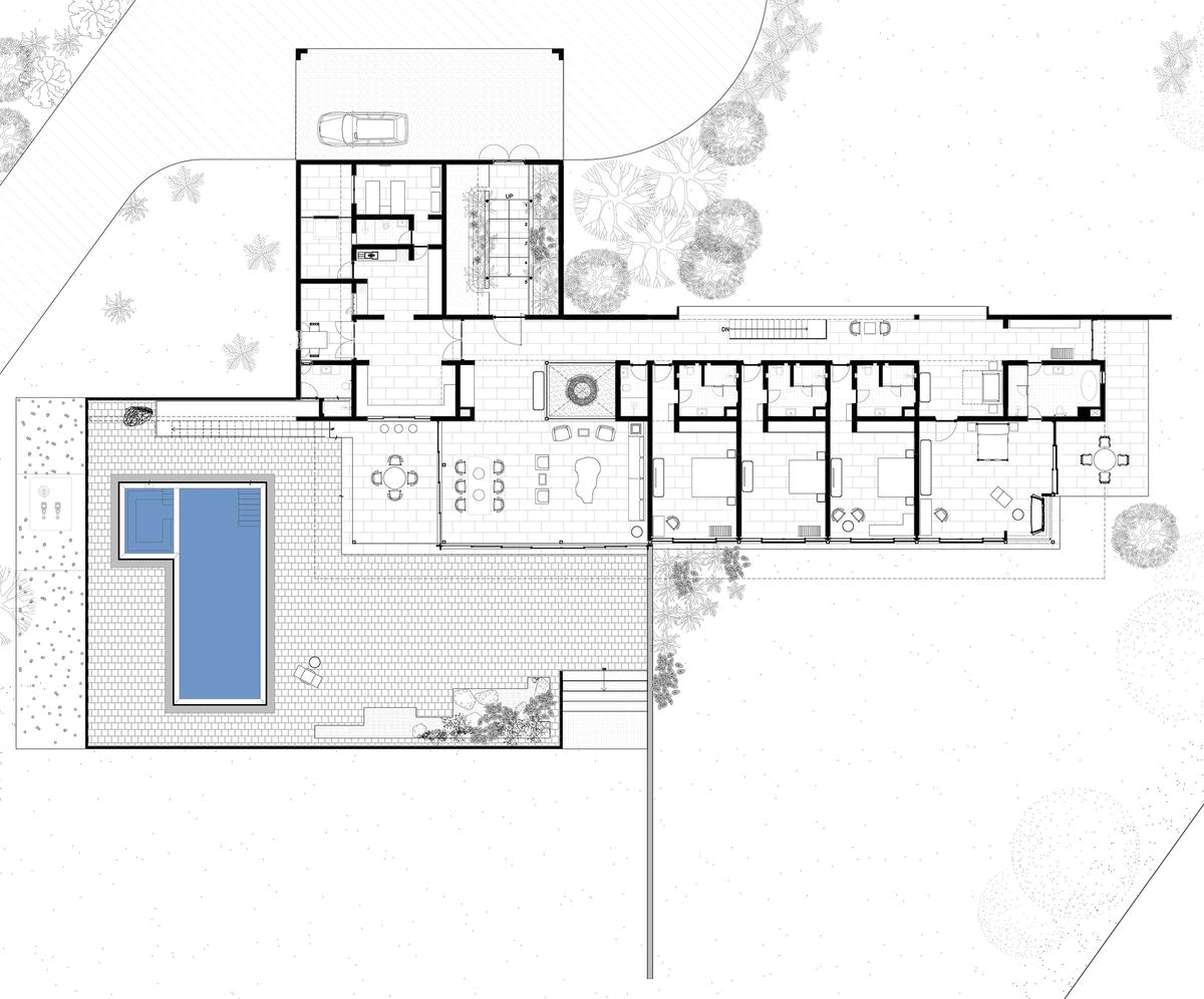 Moving from an architectural project that was bound by its existing architecture to an open plot with a far more open canvas. The House cast in Liquid Stone may sound like an exaggeration, however, it is true. The structure has an outward appearance akin to the basalt it sits on. This is on purpose and is constructed by mixing ground-up stone into the wall finishing. It is not painted nor is it a stone cladding but rather an element of concrete design that starts with the raw material itself. Both of these could potentially have the same visual effect but the investment is in creating a material language that is linked to aesthetics. Merchant narrated the moment the concept came, "I stood on site, in the pouring rain, and looked at the black wet basalt with some sprouting reeds and I knew the building had to be an extension of the rocky bluff." Panjabi added, “It all began from there, sometimes stories are just waiting to be unravelled, such potent ideas help join the dots, and make the picture complete.” This is an interesting project in its architectural language and planning, which can be linked to this notion of integrating an idea or concept through a speck of ground stone.