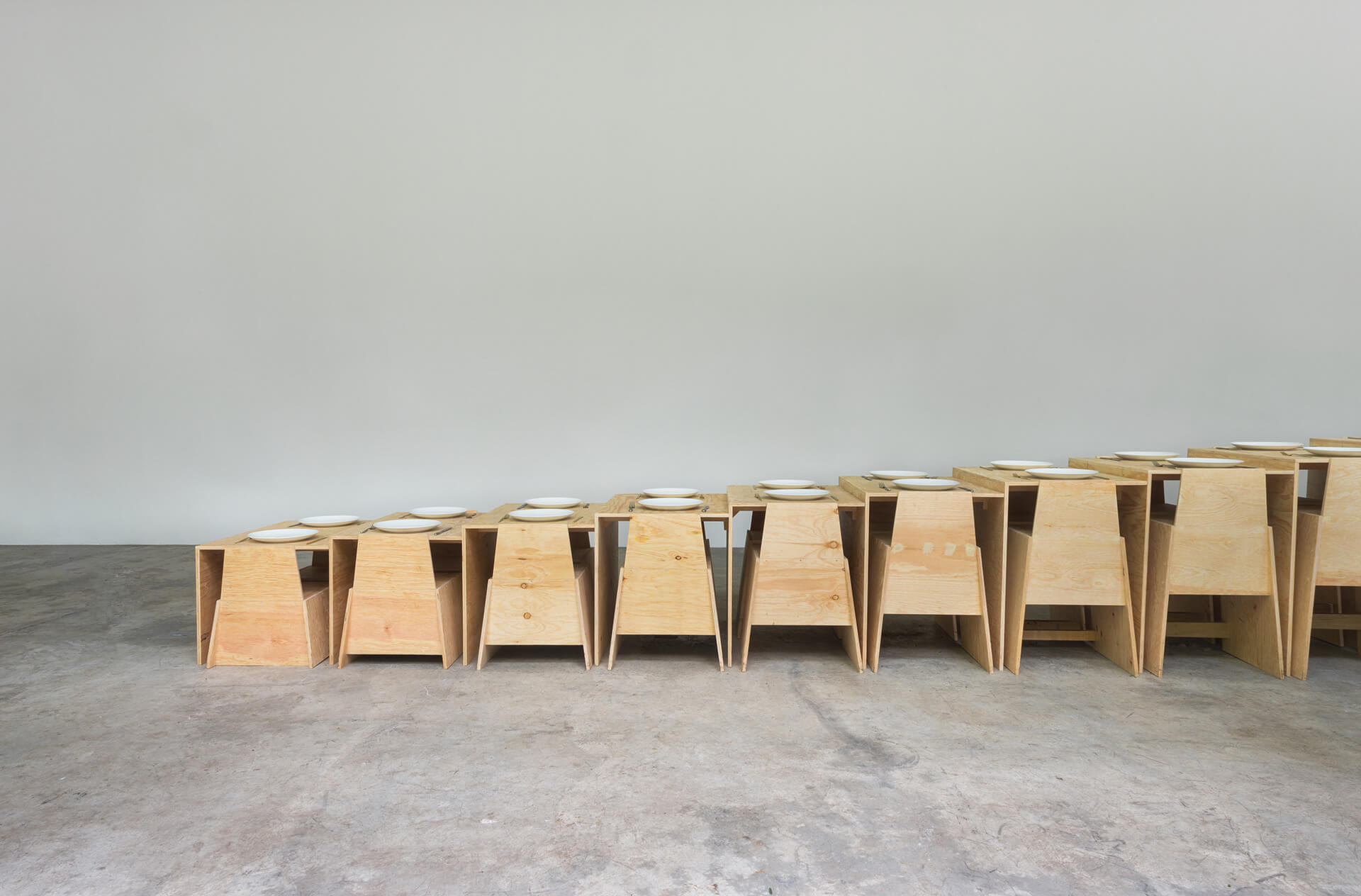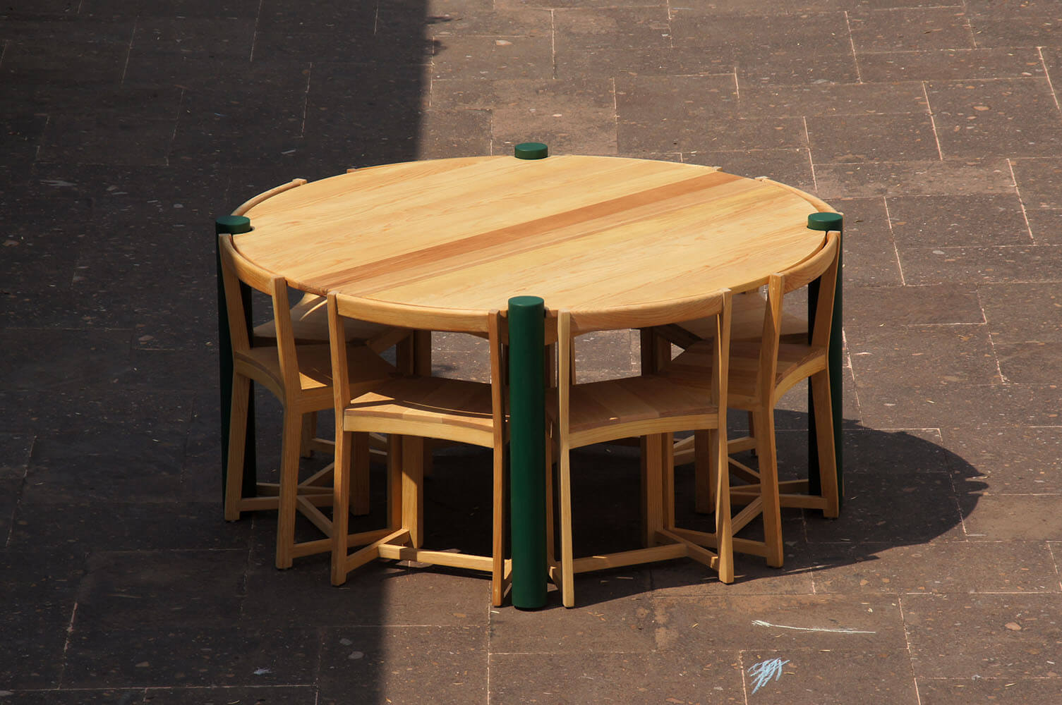 The wooden Steps Table tests limits of the commonly accepted height of a table in its playfully unique and sloping design. A cascade of plates, cutlery and glasses extend to the ground while people sitting at the highest end seem to float! The modular Folding Chair, as the name suggests, can be folded into a square and hung on a wall. When unfolded, these remind one of colourful Plasticine Monopoly houses.