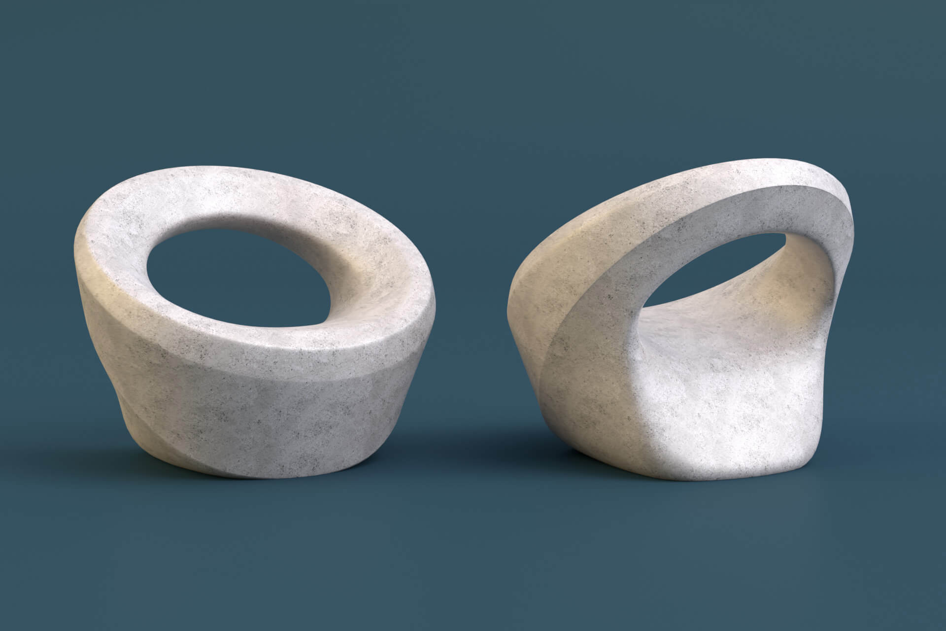 The electrostatic paint finished Alma outdoor furniture range comprises armless benches, tables and chairs made from 100 per cent recycled aluminium, melting construction waste, soda cans and other aluminium by-products. The resulting material is lightweight, with a reduced environmental impact and has a longer life due to its increased resistance to corrosion. Created for the outdoors, Rojo’s off-white Boca chair is anchored to the floor, and is made of high-strength polymeric concrete, in the shape of a swollen, deformed ‘O’.