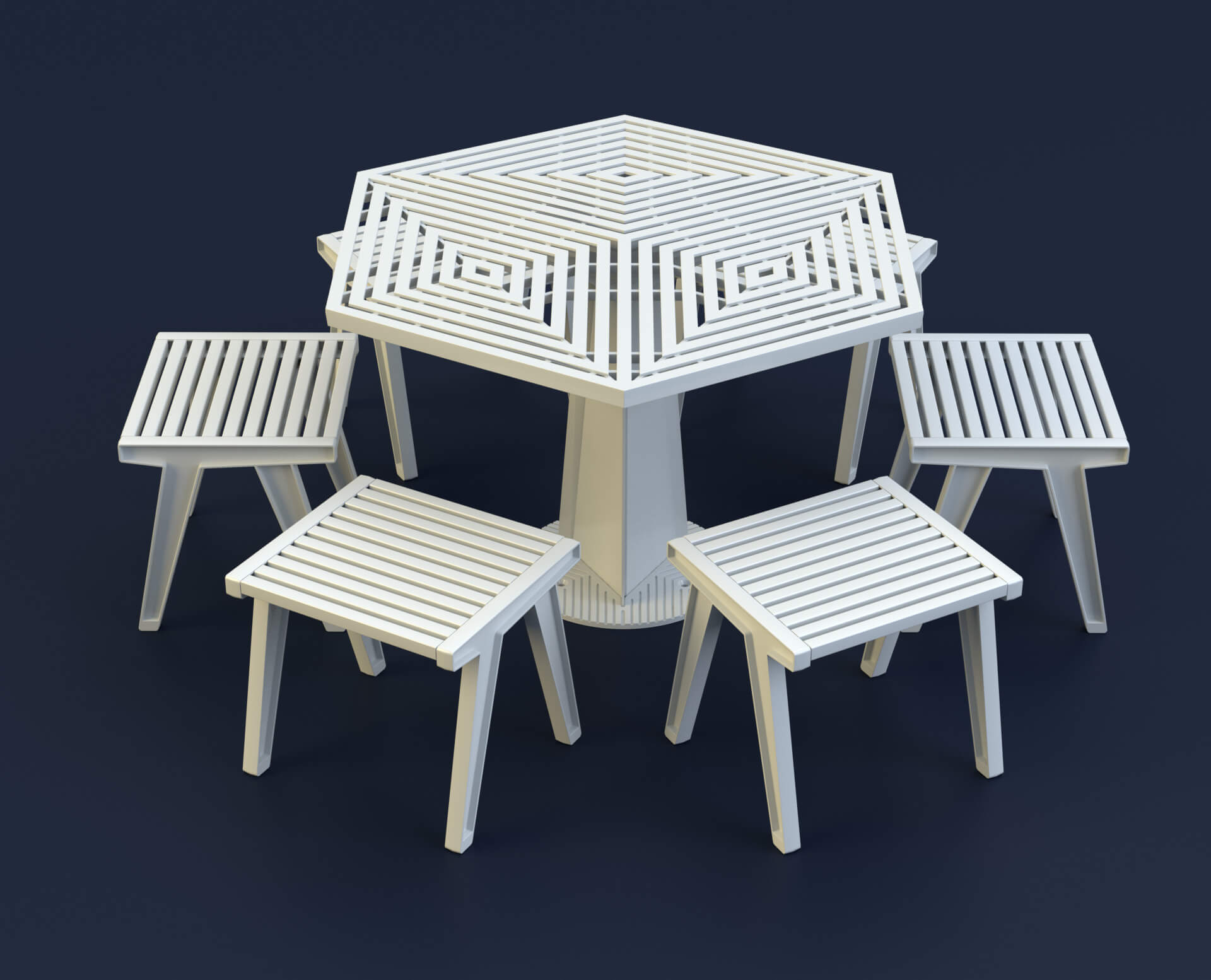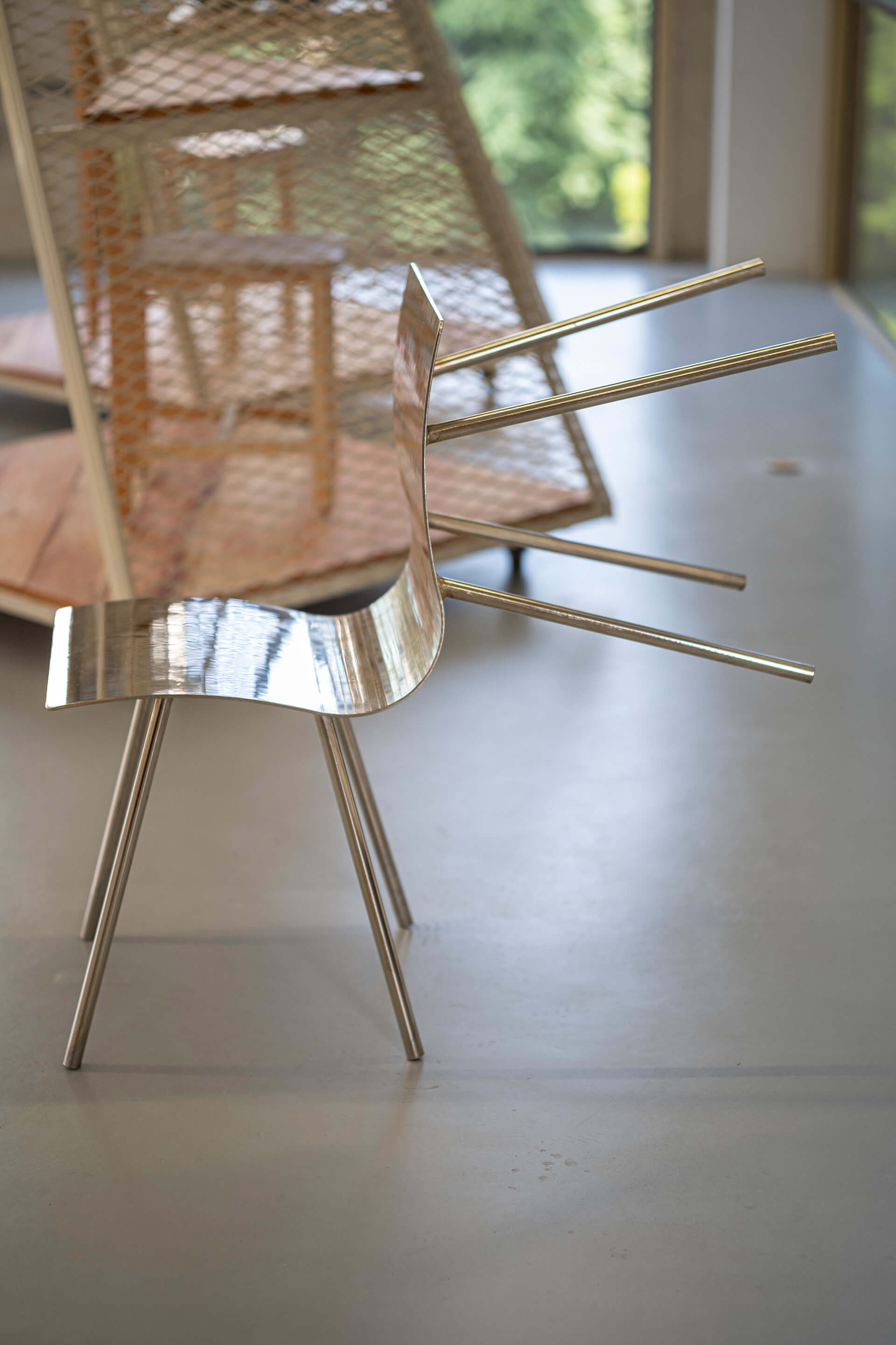 The Lunch at 4 and Rounded 4 Couples table probe the relationship between the table and chair. “The furniture gravitates between the ‘activated-by-the-user’ state where the pieces are separated from each other, and the ‘inert state’ where they fit back as one, solid piece,” they explain. The Symmetrical Chair stands on four legs that sit within the real world and another four that fit into the ‘Upside Down’ (ala Stranger Things). Its shape subverts the logic of a chair, allowing it to be used in three surprisingly different ways.