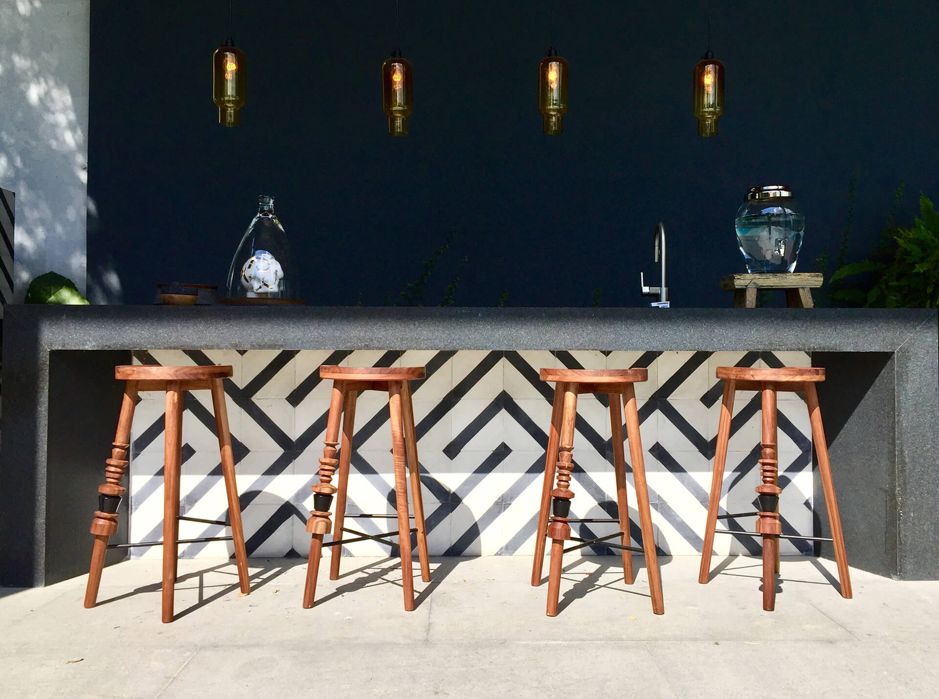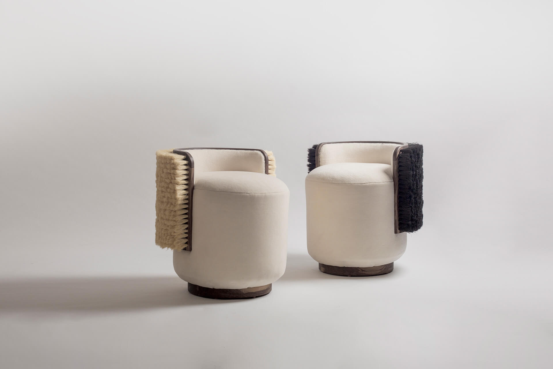 Their Roots Collection draws from the wealth of Mesoamerican culture – the clothing and accessories of warriors, like animal skin shrugs, shells and colourful plumes. These pieces seek to bring Mexico’s pre-hispanic past into the contemporary present in the form of subdued wooden, plumed furniture using endemic Mexican fibres such as zacatón, lechugilla and ixtle, and combining them with raw iron sheets, steel, walnut hardwood and clay. The Rodarte High Stools are fashioned out of one solid piece of wood and then carefully hand-carved, inspired by the age old techniques of traditional Mexican handcrafted toys.