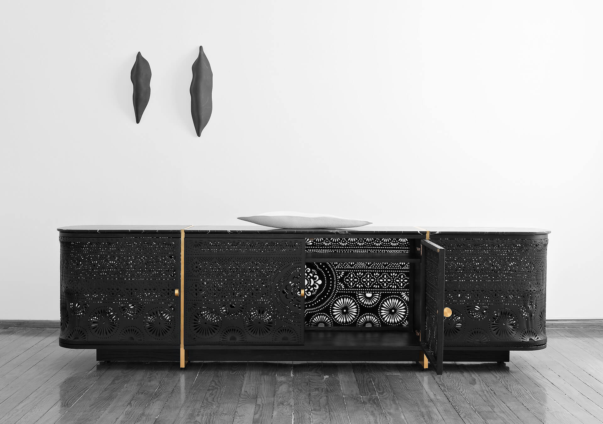 The theatrical Bodega series, composed of a credenza, a dresser and a cabinet, carries shadows created with marquetry of thin sheets of wood in different shades, layered over each other, as if they were in constant, sluggish movement. The pieces draw from chiaroscuro, or cellar art, a contrast technique of light and shadow used by Caravaggio, one of the most renowned Italian painters in history.