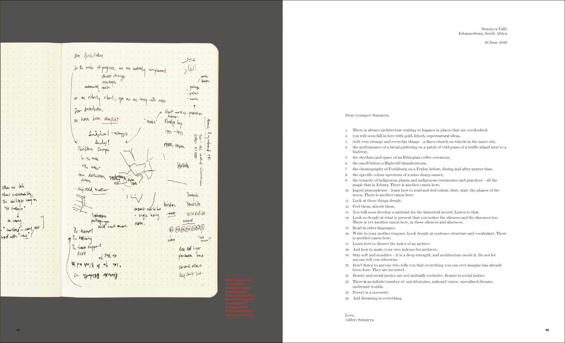 Sumayya: I'm sure it will change given the current challenges that I'm experiencing. What prompted the letter was a request by the Architectural Review; they had an issue that consisted of letters to younger architects. I had this burst of energy and thought to write to my younger self, because as I was reflecting and thinking about the idea - often being a younger person or being a student - I felt for the most part quite misunderstood, partly because of the struggle to articulate the issues and these instincts that I mentioned that I was just drawn to. But also, I think those things were inarticulable because the profession and the canon weren't open to them. The realm of architecture is more open to engaging with subject matter that's on the fringe, but that subject matter has to state explicitly. It is about identity politics. Broad stroke statements dumb the project down and they do not allow nuances to enter the conversation. They become entirely about this kind of reductive checkbox. Those things mentioned in the letter are affirmations towards a younger person who is instinctively drawn to looking at things in a different way or from a different place.