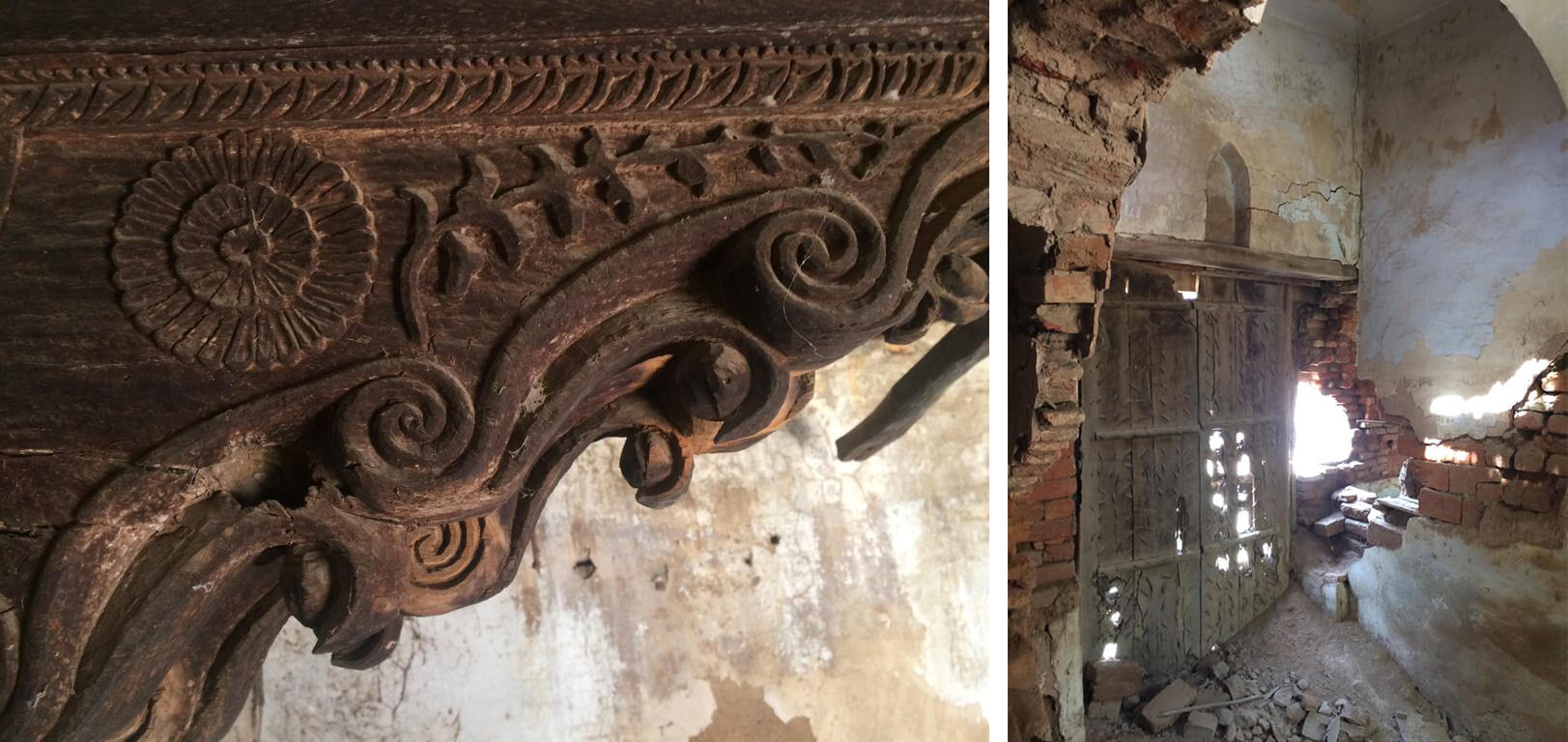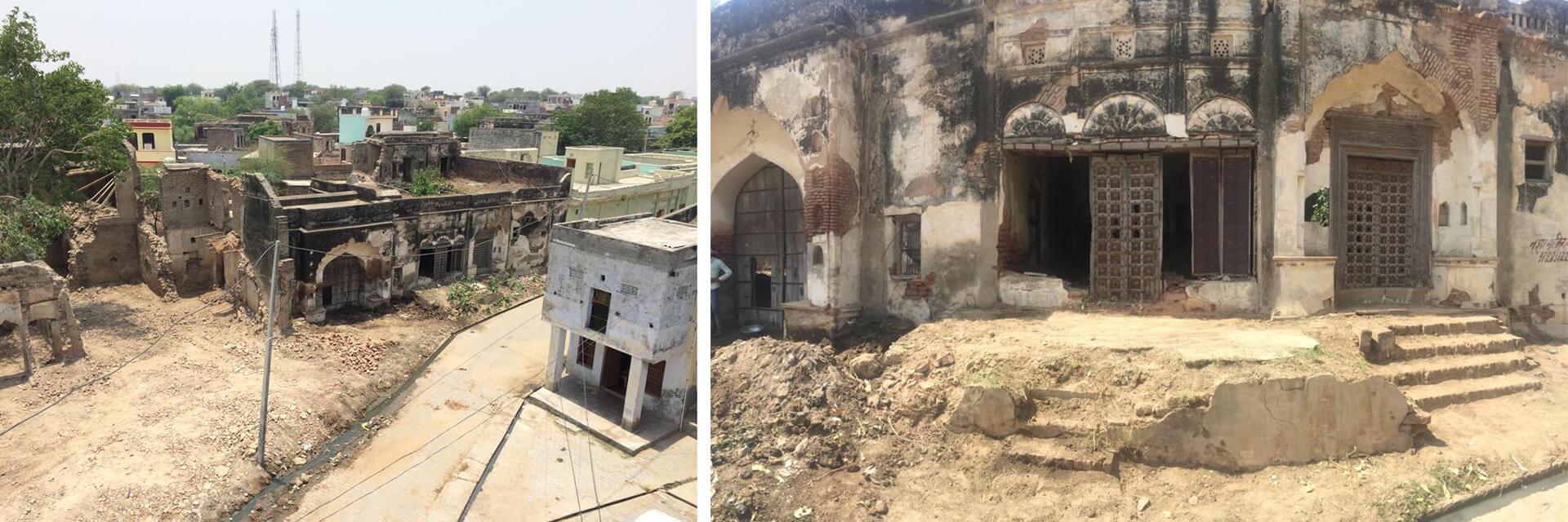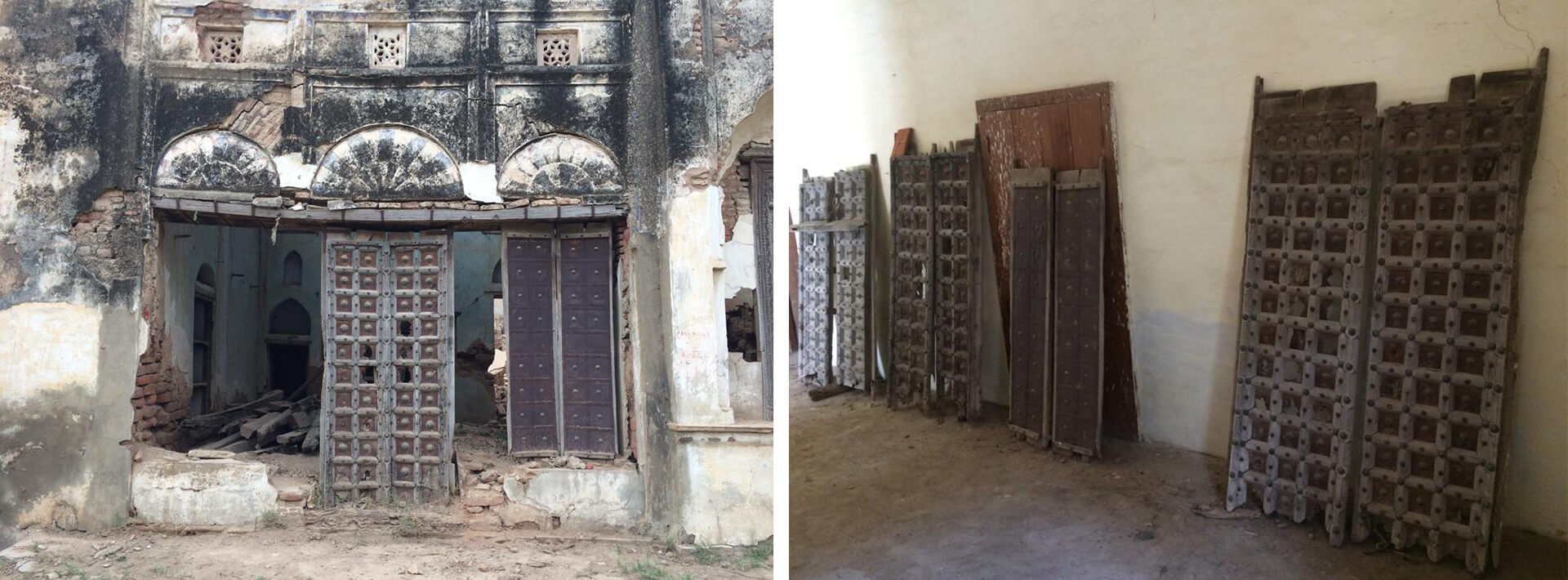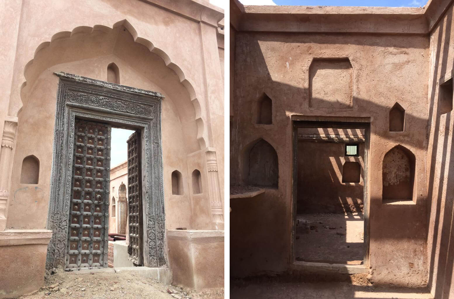 On our way to Nalwa, Feenstra pointed out different buildings on the sides of the road—mostly abandoned and in ruins—adorned with elements of Jat architecture. Arches inspired by Mughal architecture, large ornate doors, protruded seating on the front facade, courtyards, alcoves for diyas and built-in hooks for lanterns, were some elements that characterised the architectural style.