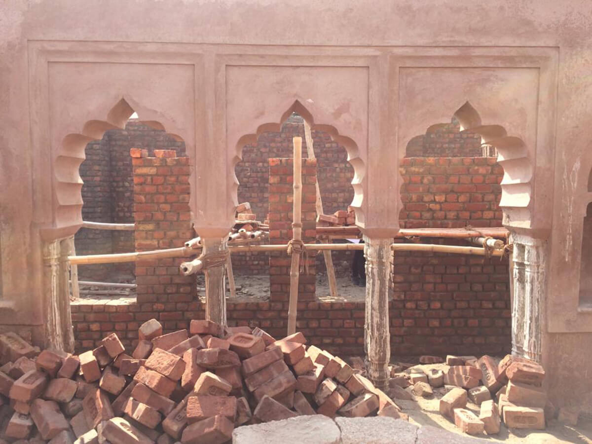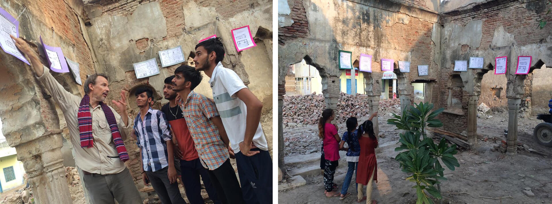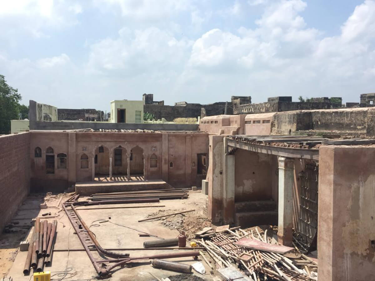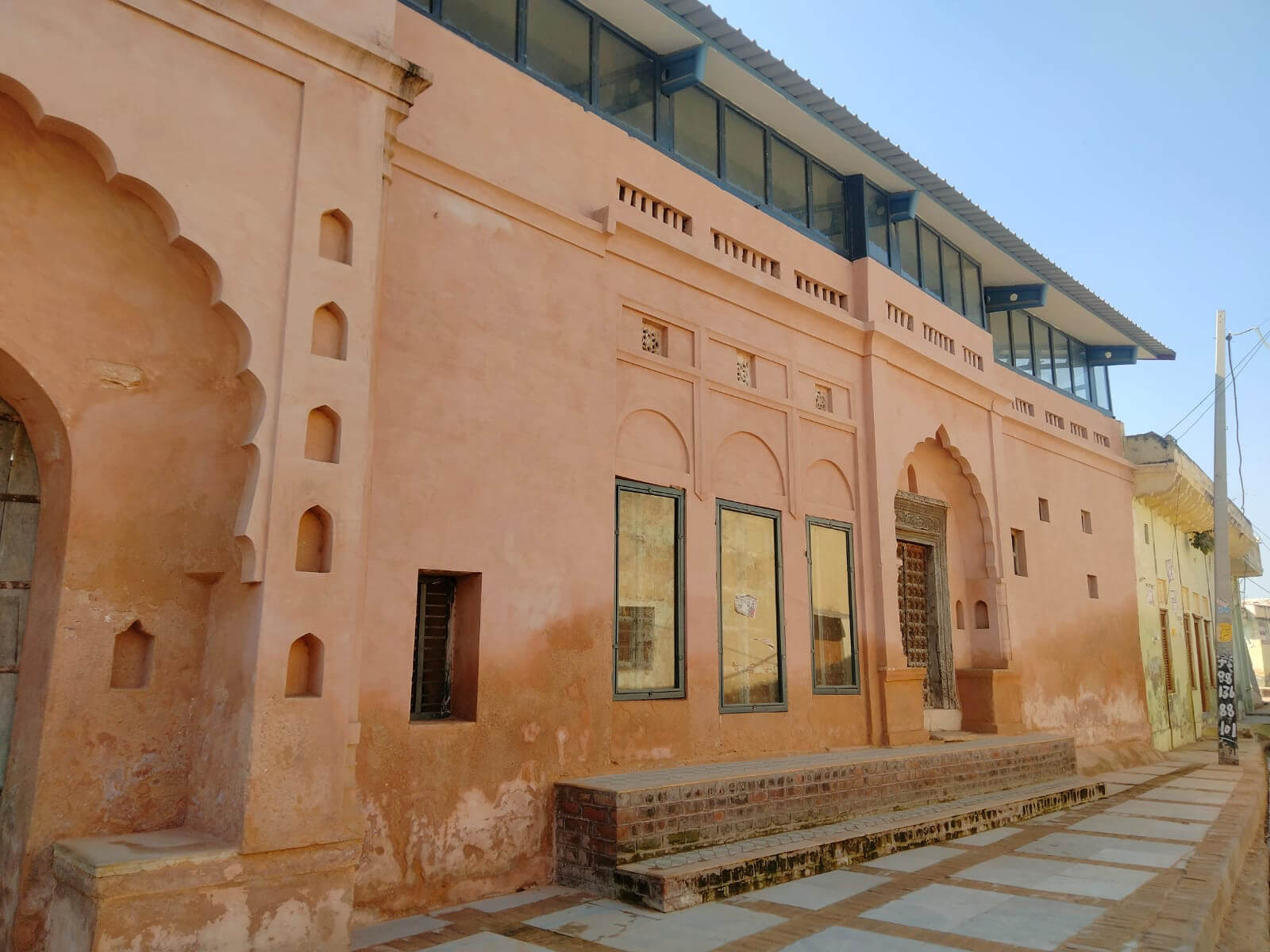 Nalwa is similar to most rural villages of North India; it has narrow roads that diverge to narrower alleyways, small uncovered shallow drains running on the sides of the road, bull carts filled with heaps of grass parked on the sides, old men dressed in white khadi kurtas, dhotis and turbans inspecting everyone who passes by, and women with their faces concealed behind their saree pallus. It was evident that everyone there recognised Feenstra, a kind of familiarity that only comes on meeting a person multiple times, over the years. We slowly started walking towards the centre, with Feenstra pointing out the roof of the building, visible from a little distance. After a curve, I first saw the entirety of the building.