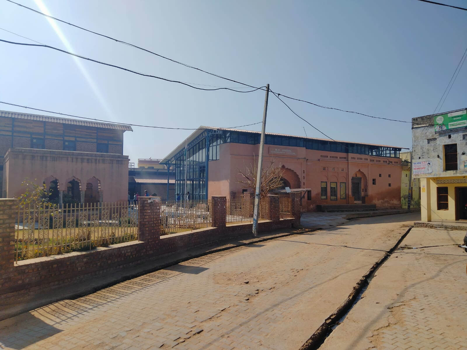 In our extended conversation of Jats, Indian architecture, and how buildings contribute to history, I noticed the board—written in Hindi—'Welcome to Nalwa.' The roads started to narrow and occasionally we saw a brick kiln among the mustard fields, justifying why a lot of the buildings in the area had brick architecture. The worn-out roads, dry winter winds spreading heaps of sand around, and the curious looks of old people sitting in shop verandahs, invited us to the village. We parked the car a little far from the building and walked to a small shop nearby. Feenstra wanted us to greet one of his acquaintances before we made our way to the community centre.