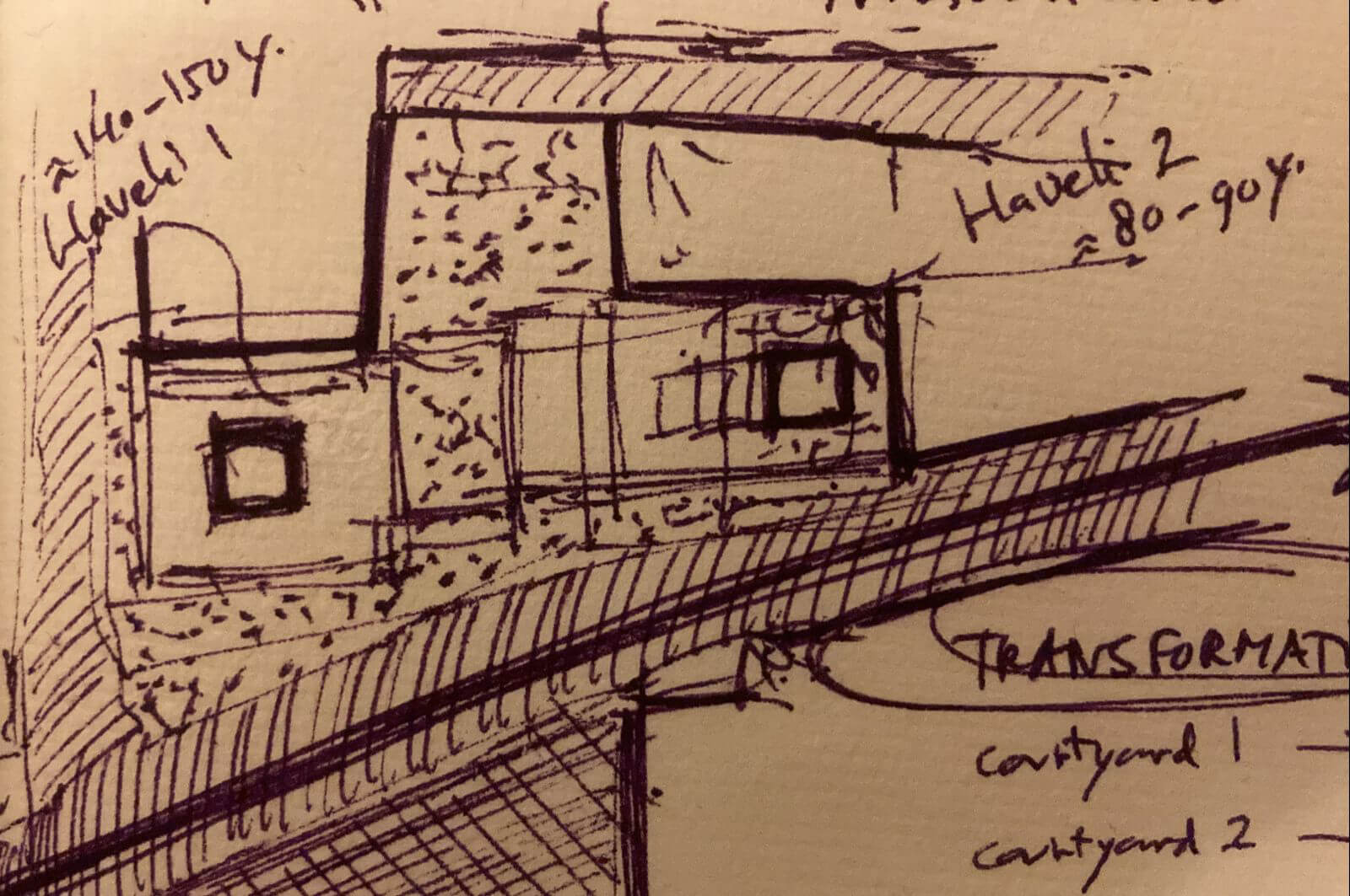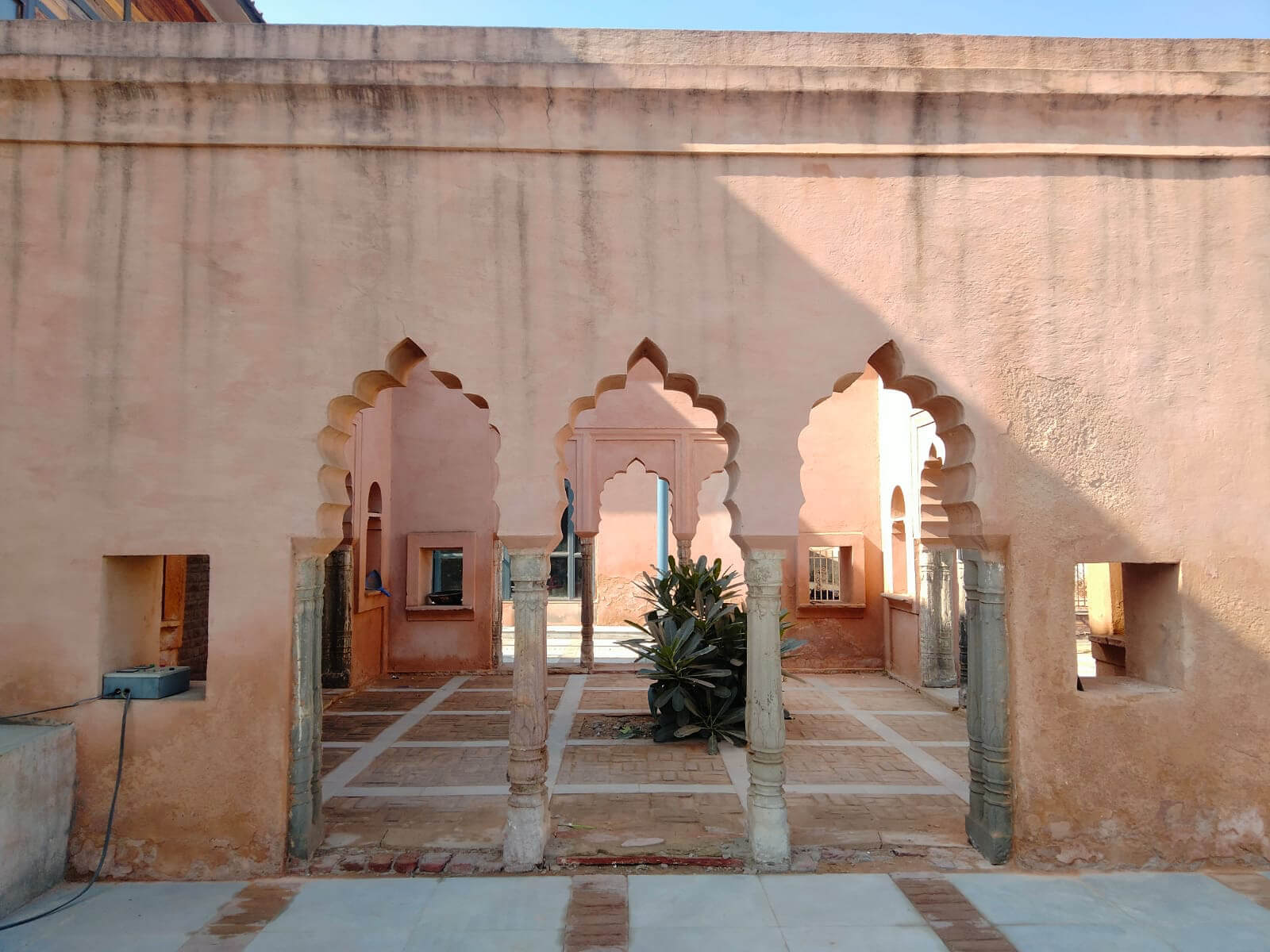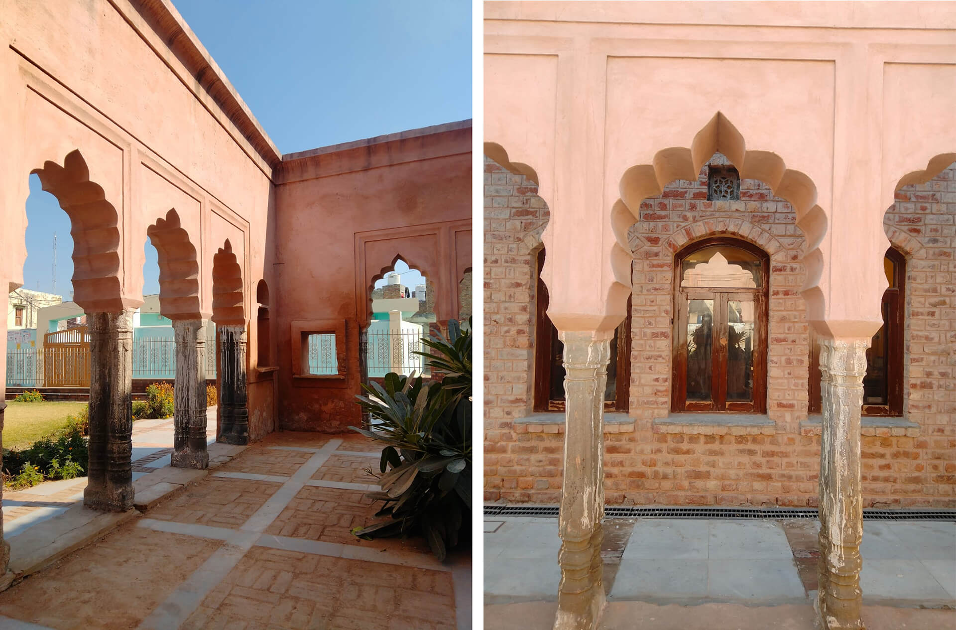 At the entrance of the site stood a small tree with fallen leaves owing to the harsh weather; my mind immediately went to the Mulberry plant that Feenstra and his team had planted before construction. Later, Feenstra confirmed this, after which we moved to the large front yard with the garden. There, towards the east, was the restored courtyard, now acting as a pavilion, of the first haveli. Raised on a platform, each side of the courtyard wall had three arches supported by stone columns. In the centre of the courtyard was the Champa tree, planted four years ago. The thick walls of the courtyard, along with the arches, had alcoves for storage and diyas, and small cutouts for placing other objects. Standing in the courtyard, which was a part of the old structure, it was easier to picture Feenstra’s stories of Jindal spending his childhood here. Within the courtyard architecture of the pavilion, this place does feel like a home.