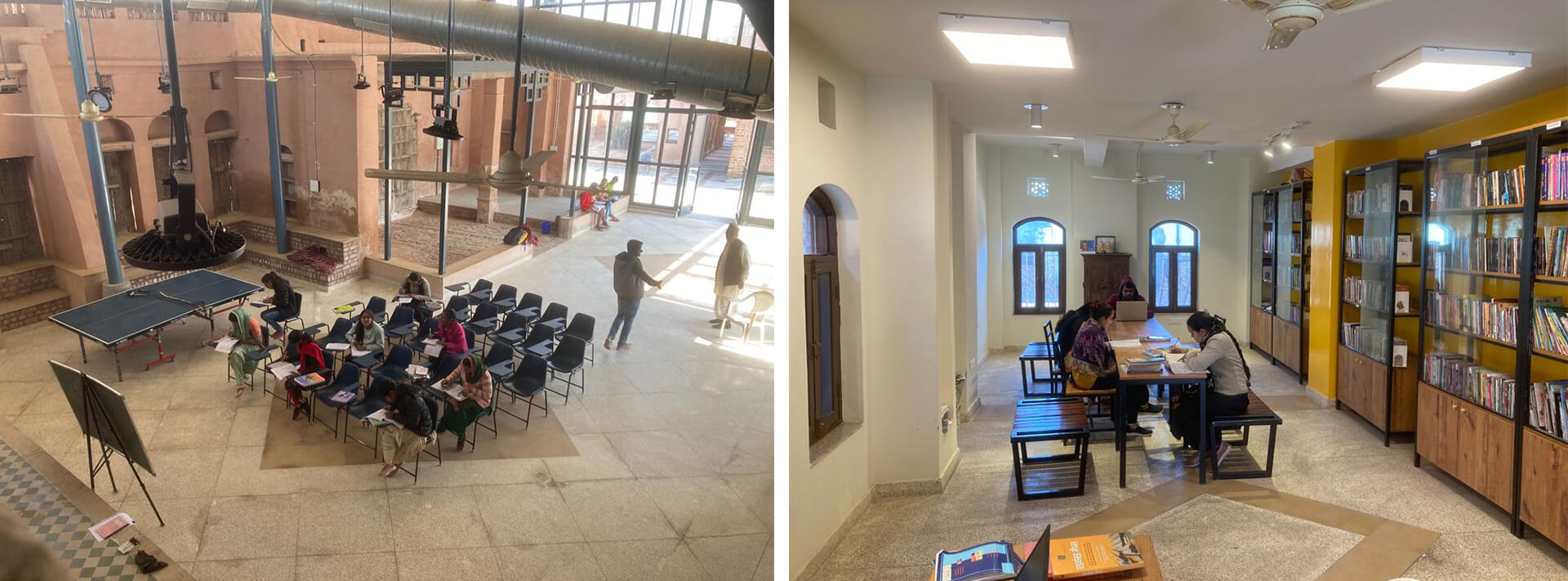 The design of the two-storeyed library was mostly conventional. On the ground floor was a linear library, with Jindal’s ancestral iron safe exhibited on a pedestal towards the end. The first floor had rooms and bathrooms for refreshment and for those using the halls for events. Towards the southwest of the library building was the community kitchen and toilet block. This block sits at a small yard across the library and community hall. Here, kids play, soak in sunlight and interact with other users of the centre.