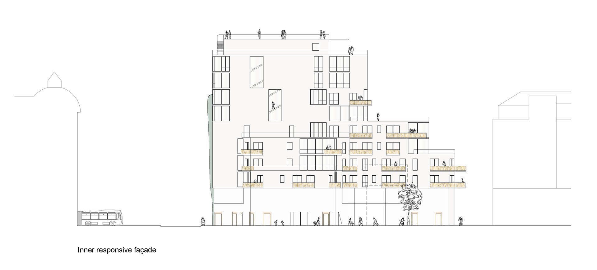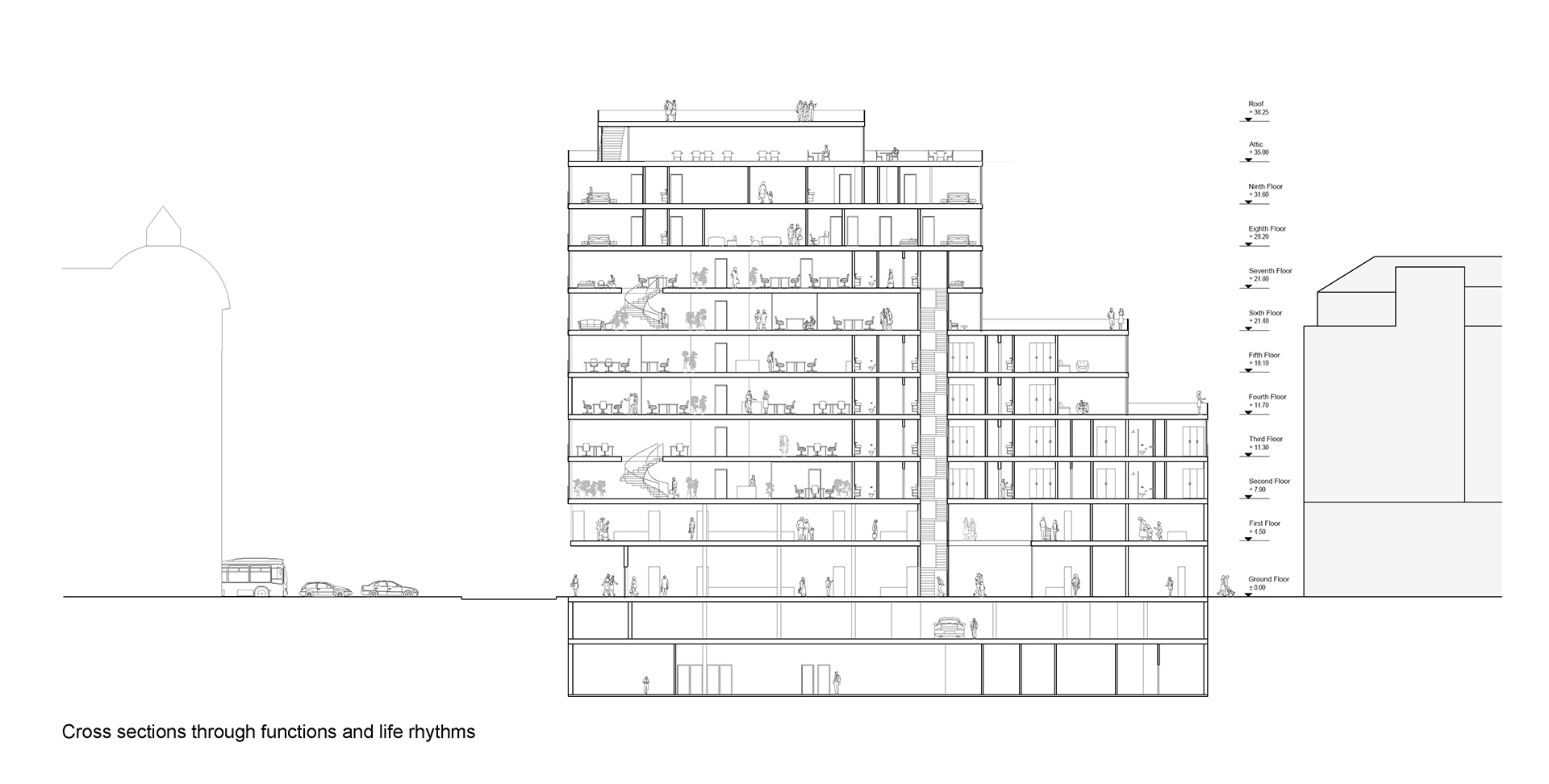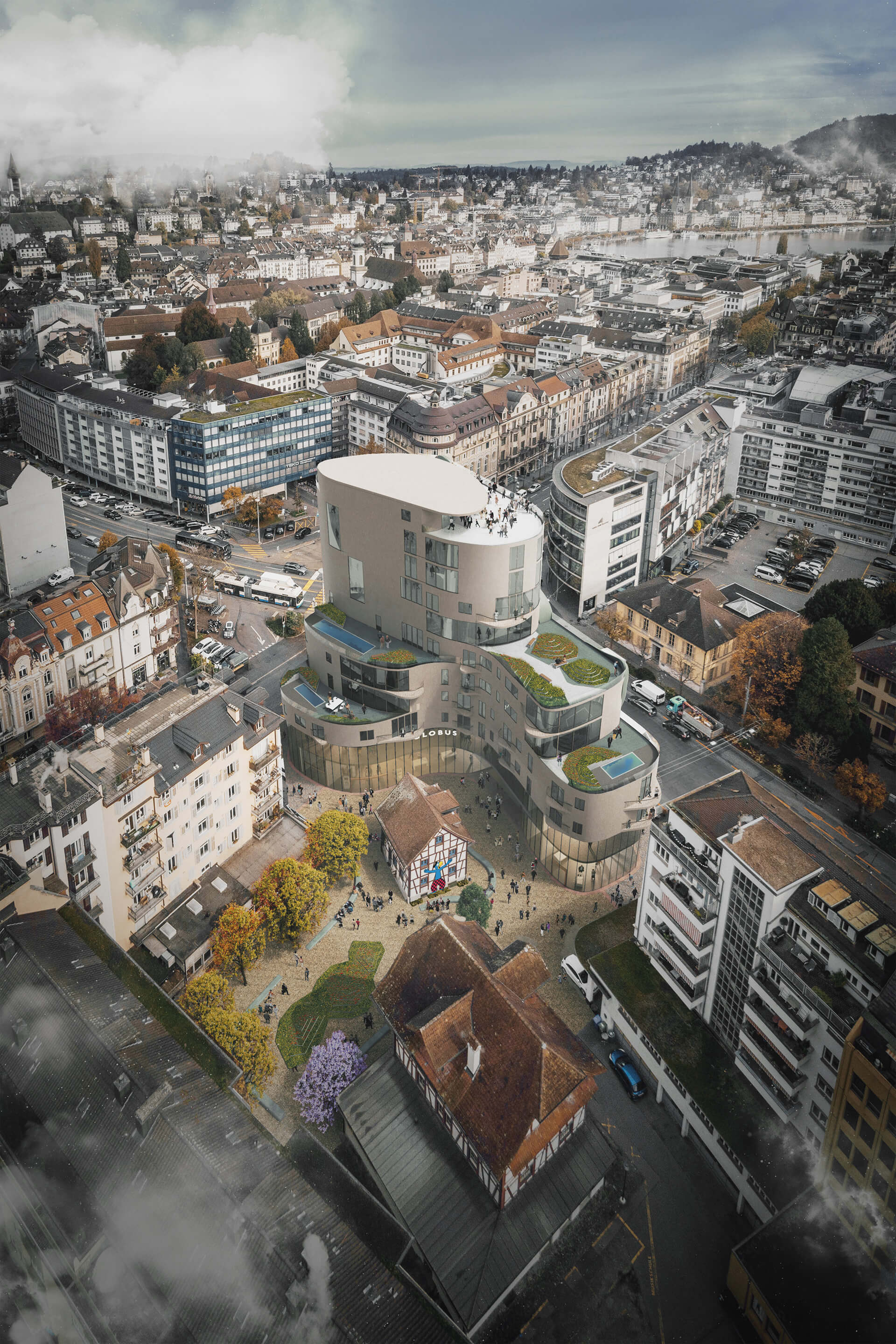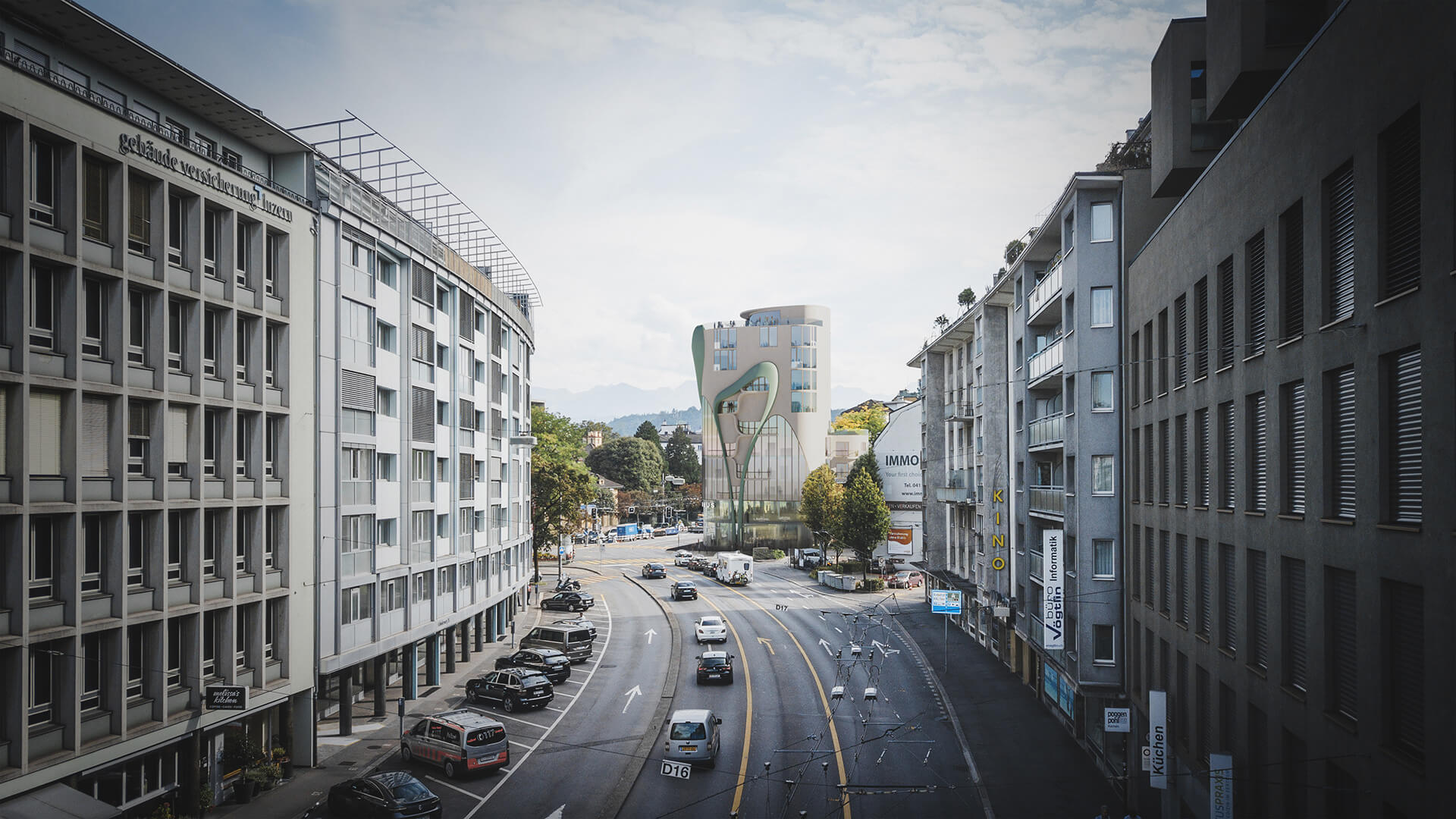 According to the designers at SLA, the continuity and congruence of the natural form of their muse, the eponymous Alpen-Akelei petal lent itself conveniently, and organically, to create mathematical computations that were both “related and continuous”. The natural inspiration doubles up not only in form but also in envisioning the building itself as a hybrid, composite, complex functioning organism, in interaction with its environment, and informed by its “skin”, its material. The brief for the project was to create an attractive commercial and residential building on the Pilatusplatz, offering long-term usage options in terms of economic sustainability to its occupants, intending to take account of the prominence of the location and value of the project as a beacon of urban identity and value-driven investment.