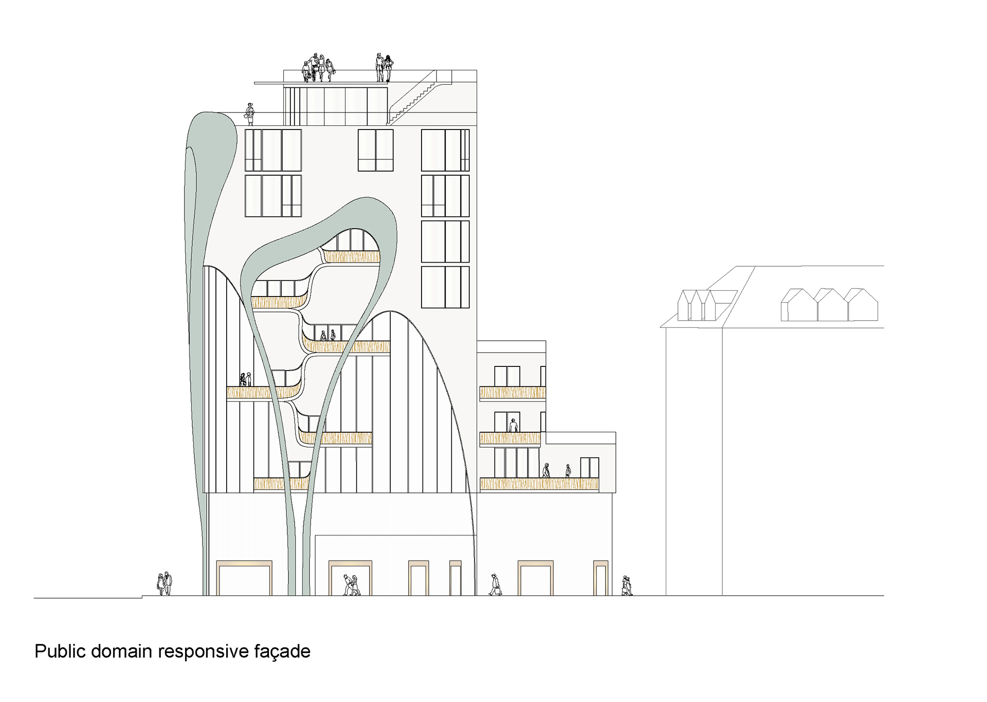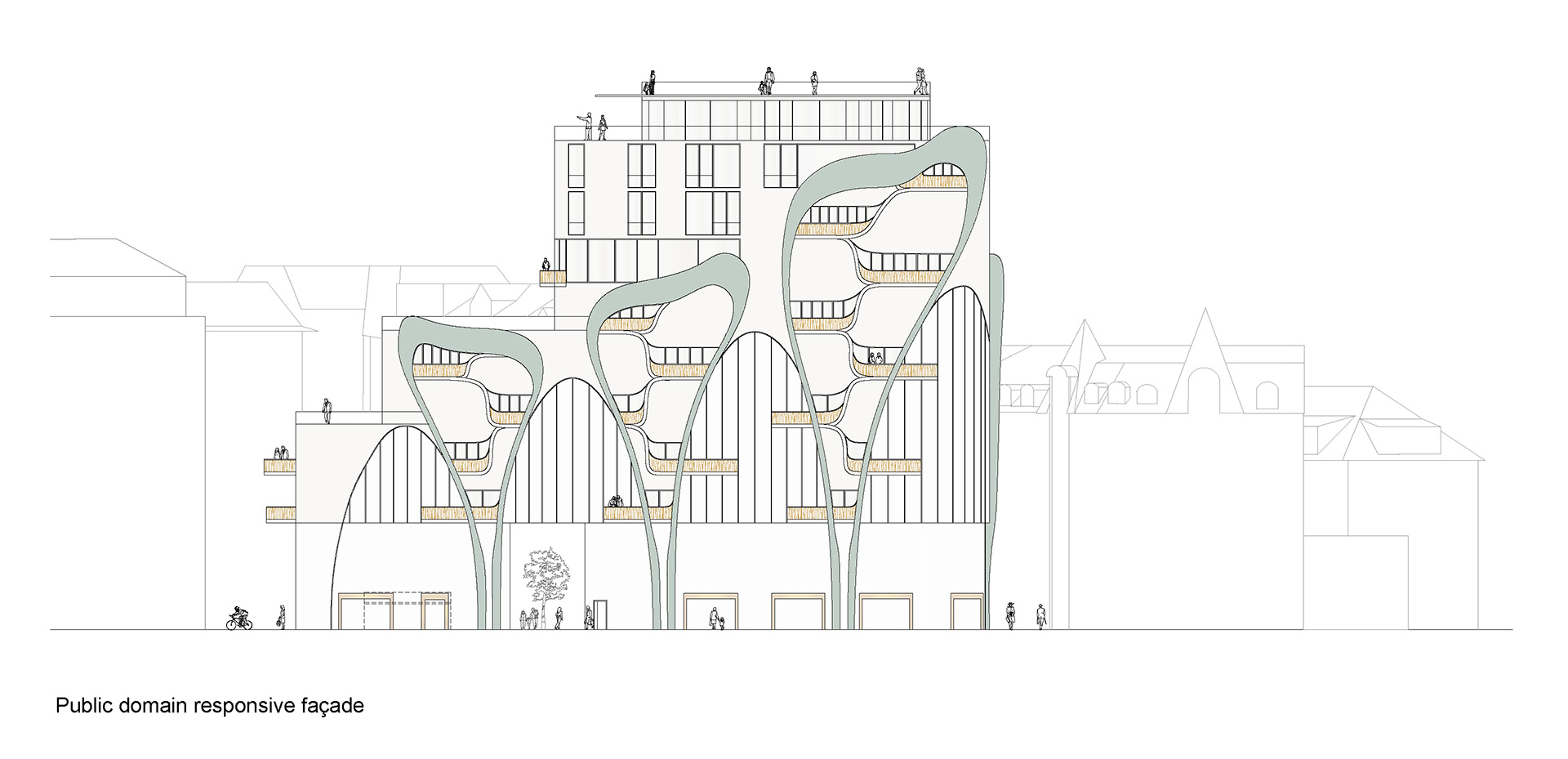 Submitted as a proposal to enliven the Pilatus Square in the city of Lucerne, Switzerland, as part of a public competition held by the Lucerne Municipality and commissioned by TC Holding AG, the Alpen-Akelei Haus designed by SIAMAK Living Architecture (SLA) is evocative of a binding relationship between man and nature. As the Zurich-based firm’s working ideology itself, the building too aspires to a method and belief of healthy living through architecture that looks to the future, but is rooted in and seeks inspiration from the natural world. In this particular case: a petal of the Alpen-Akelei, or Alpine Granny’s Bonnet. Literal inspiration is sought from a delicate, primary form of a flower petal and manifested in the structure and elevation of the proposed mixed-use building through what can only be stated to be a dichotomous relationship: using advanced software and state-of-the-art data driven computations and algorithms.