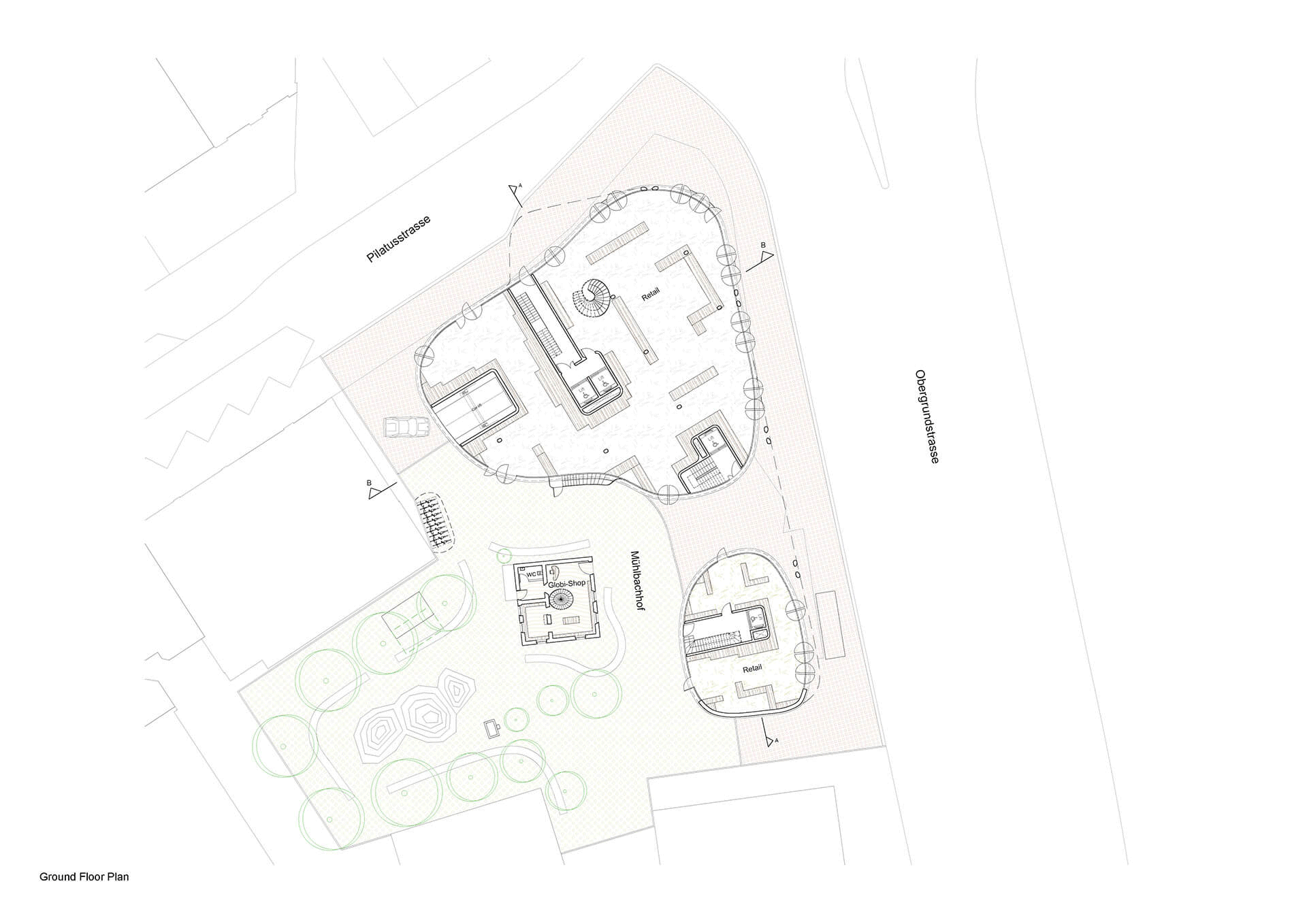 The architectural concept of the building, that of the Alpen-Akelei petal, is able to comprehensively and inclusively lend itself to three distinct, important building elements: the structure, and the façade in its organisational as well as ornamental form, the latter being reminiscent and evocative of blooming flowers, crystallised here to also hold the building and its glazed podium front in place. Along with forming a vertical, visual link between the lower levels and the residences above, the V-shaped gates along the façade are an integral part of the building structure. The building aptly avoids the monolithic qualities frequently associated with high rise blocks, with the façade of the Alpen-Akelei being broken up by means of variations in texture, depth, the placement of balconies, and the recumbent rhythm of its curved vertical frames. In contrast to the apparent solidity of the residential blocks above, the nearly fully glazed retail units below coupled with the vertical V frames seek to create the illusion of “carrying the building, as if the whole block has the potential to float”.