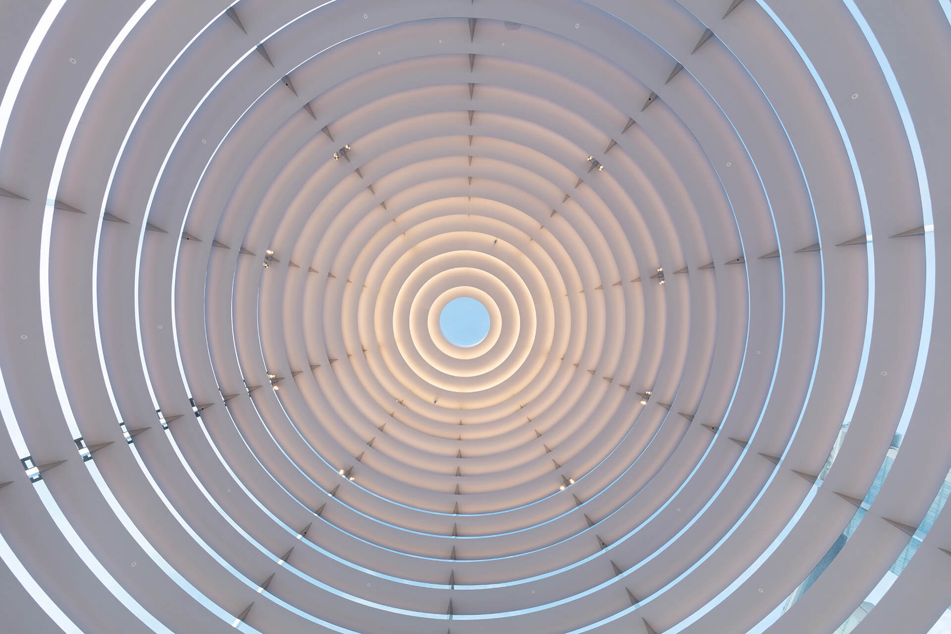 The structure mirrors the colours of the surrounding water and sky during the day, while in the evening the calm interior lighting provides a soft glow, heightening the magnificent experience of the city’s panoramic skyline. Reminiscent of the Pantheon in Rome, the 30-metre-diameter dome features a semi-opaque oculus that floods the store with an impressive streak of light.