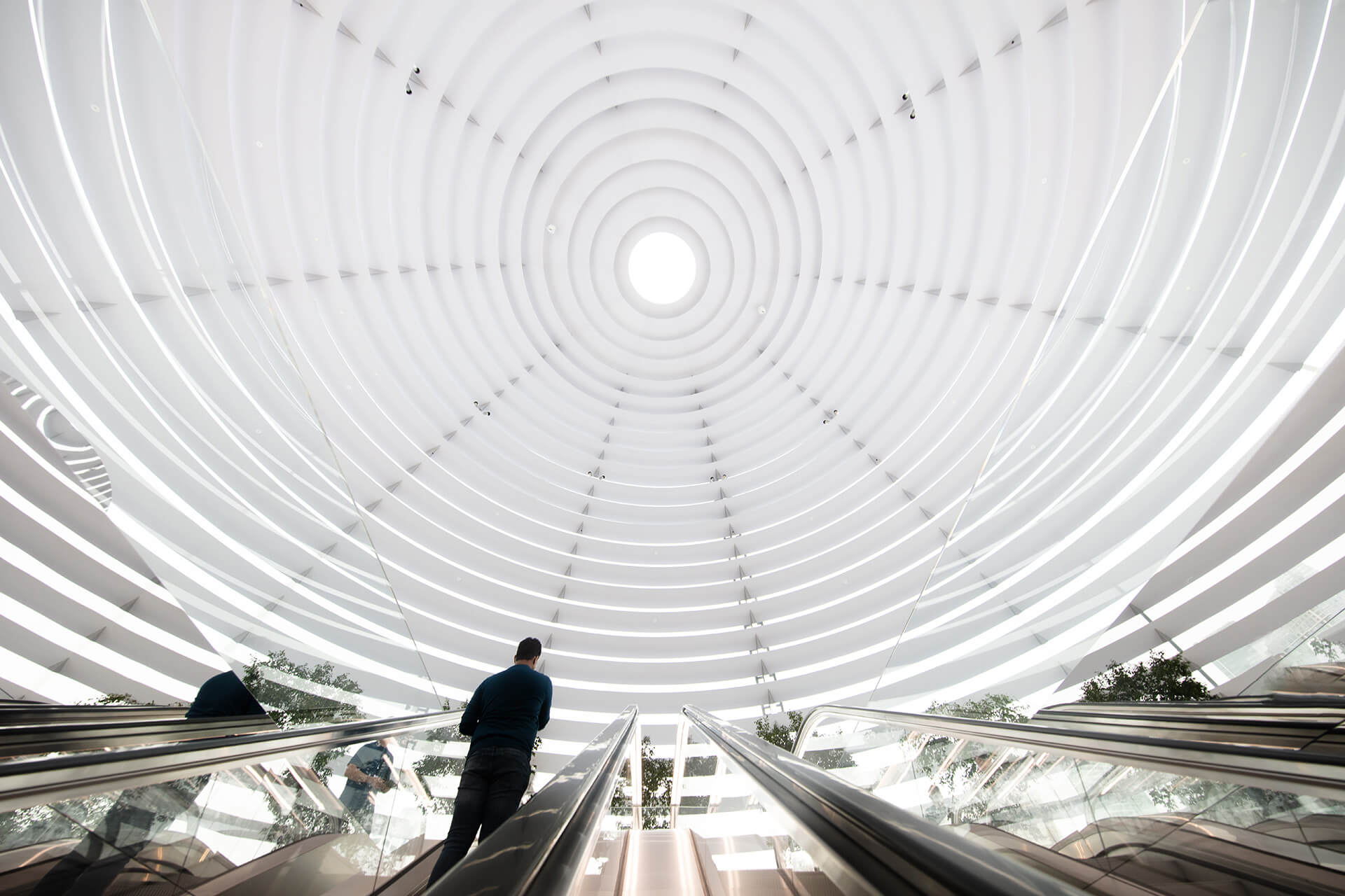 A rounded stone entrance flanked by Apple’s signature Avenue display greets visitors into the store, leading them to a set of dramatic escalators that take visitors on a “kaleidoscopic” journey to the heart of the domed space.