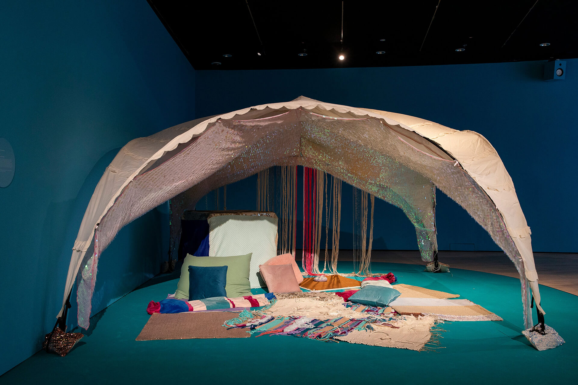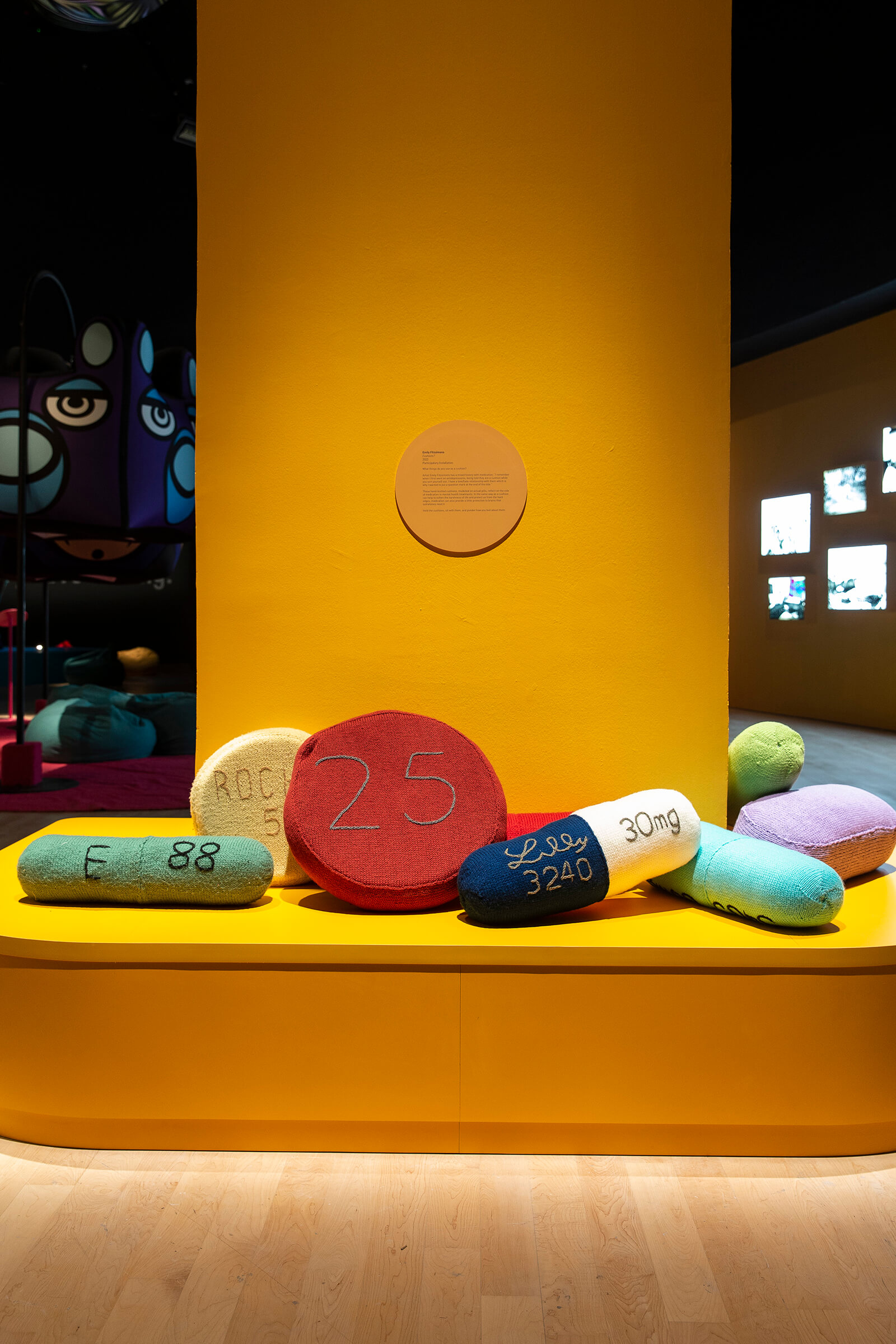 While the ‘Wheel” involves physical activity, Emily Fitzsimon’s Cushions? is a sensorial exhibit, consisting of cushions that are shaped like enlarged pills. The softness of the cushion is a metaphor for the cushioning that medication provides to the brain. Stemming from her personal history with medication, the question mark in the title is a symbol of the conflicting relationship between the artist and her anti-depressants.