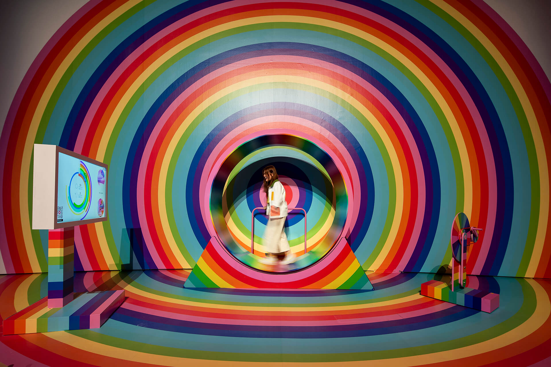 The ‘Wheel’ - co-conceptualised by artist Hiromi Tango and neuroscientist Emma Burrows - explores the effect of exercise on human temperament. Working on the hypothesis that exercise is “mood medicine” for the human body, the vibrantly coloured installation is modelled to collect data to determine the effect of voluntary physical activity against memory loss, depression and anxiety.