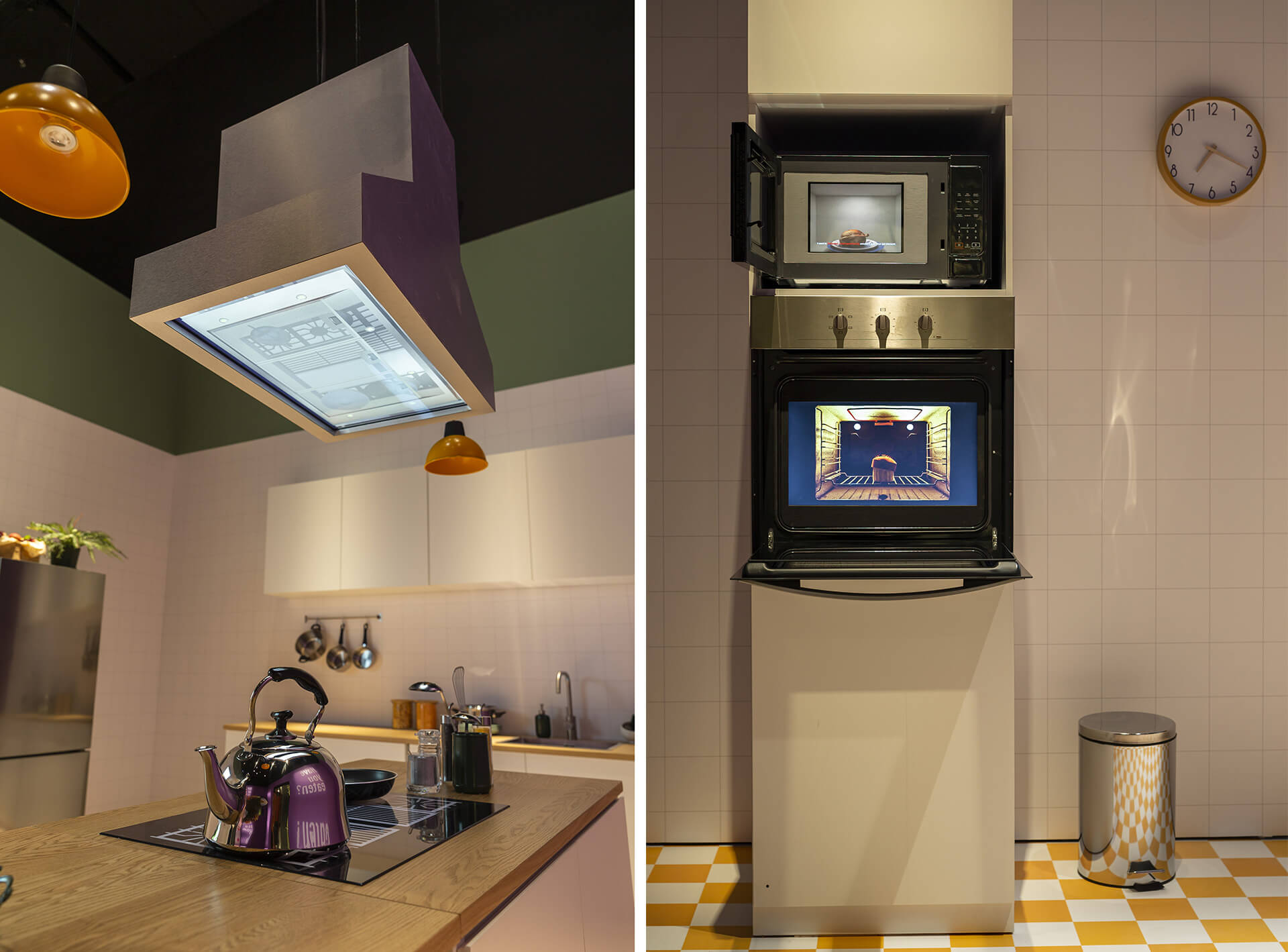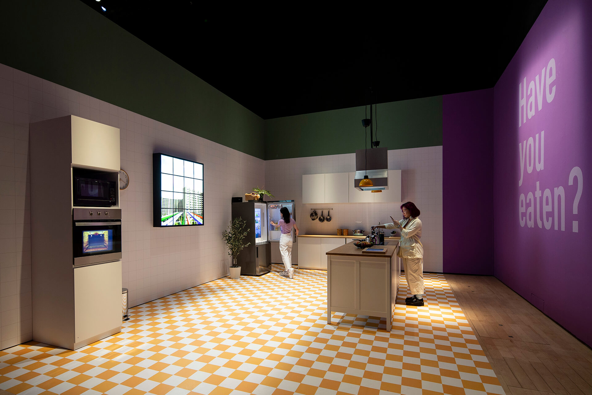Singapore-based artist Divaagar’s Model: Kitchen is a multimedia installation that throws light on the significance of care. Combining the format of the kitchen showroom and digital renders, the artist creates a kitchen space, to draw out the symbolic context between the spectator and the work of art. This scenography of kitchen spaces, complete with counters, appliances as well as a screen projecting an exterior scene (alluding to a window), has dedicated one wall to the question, “Did you eat today?”.