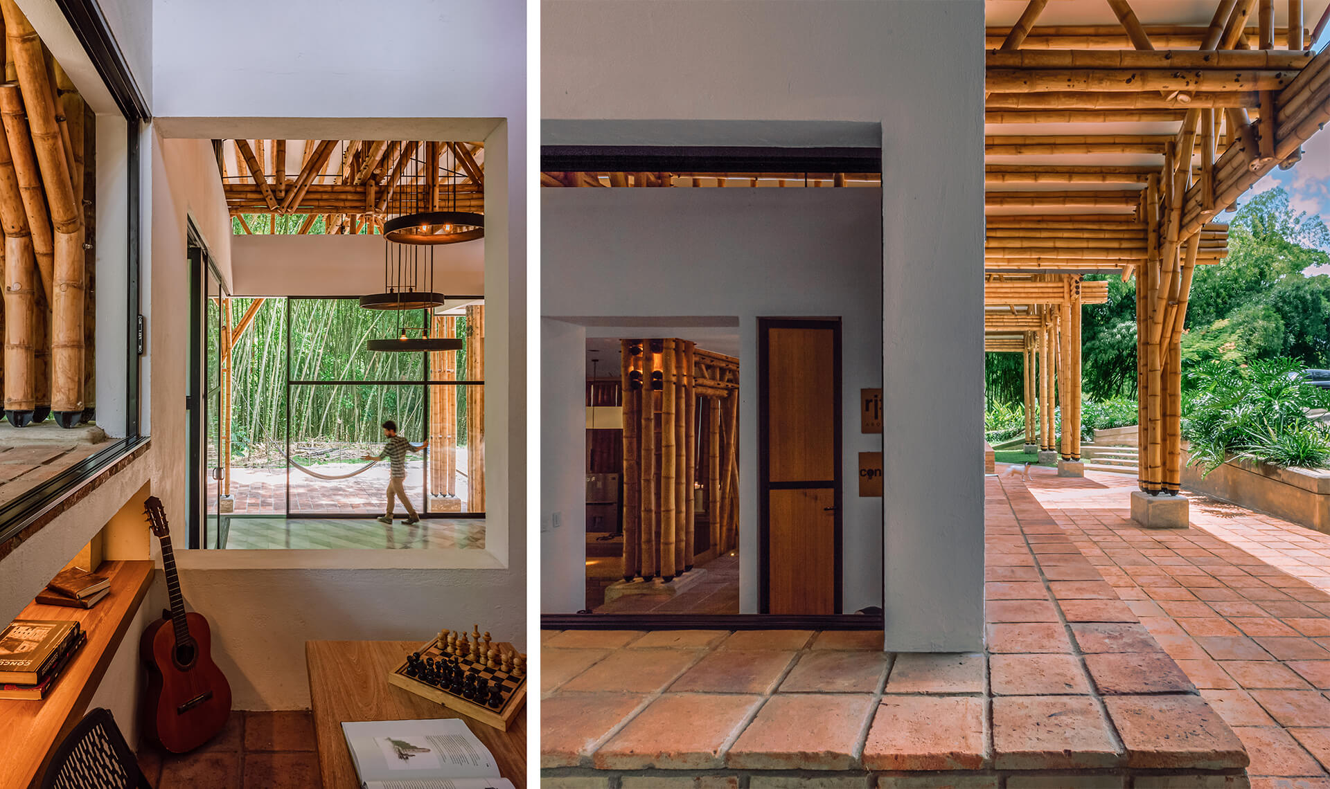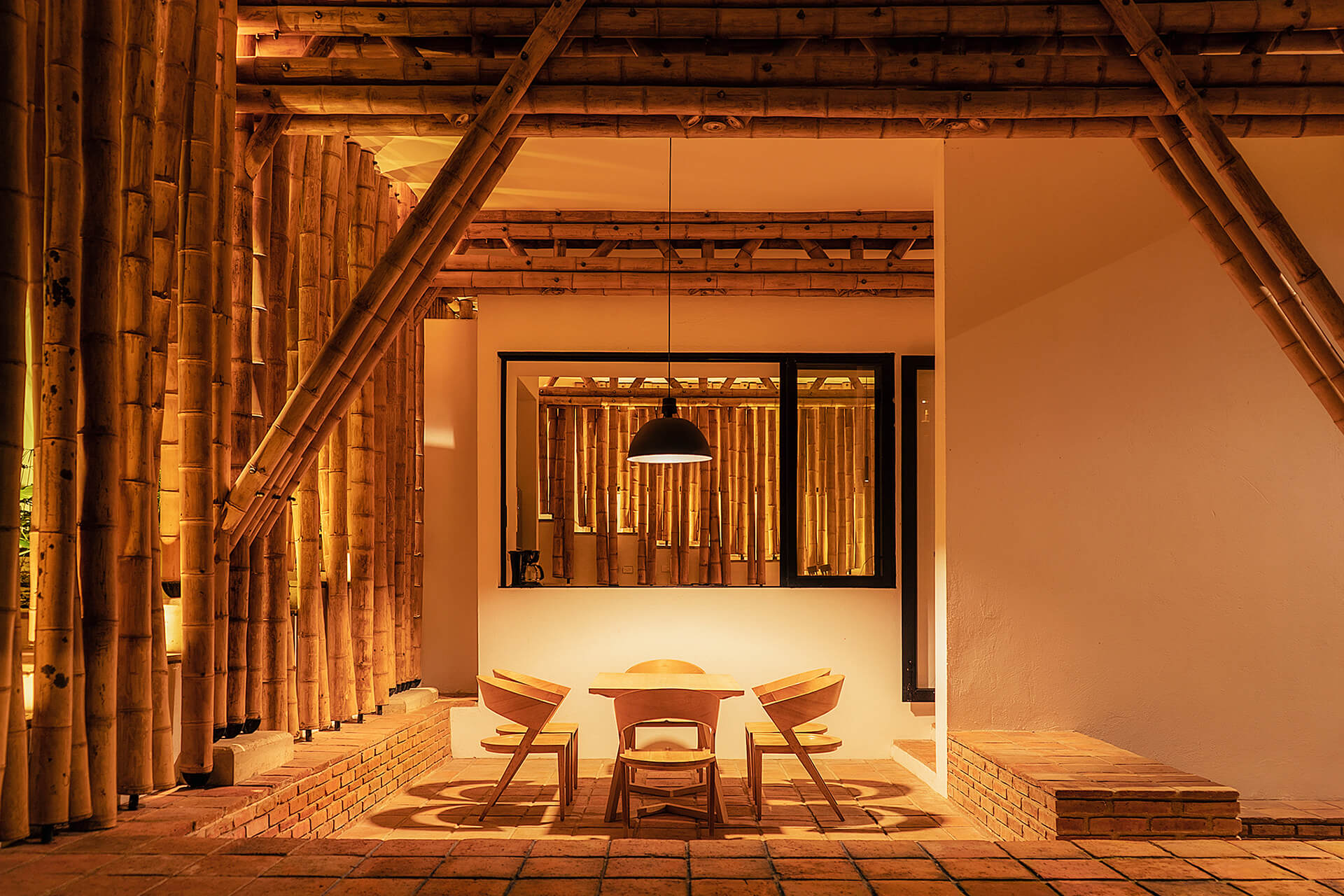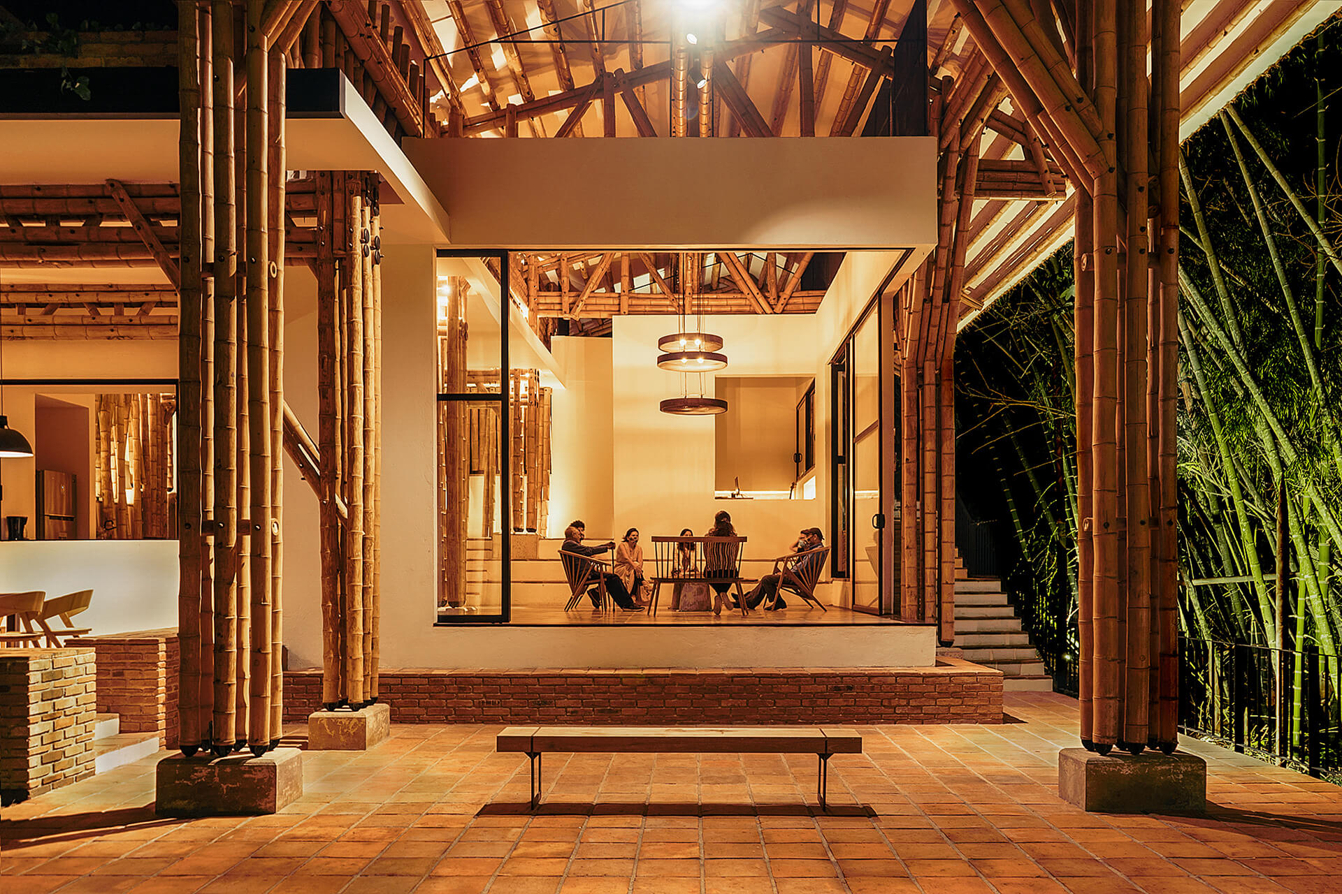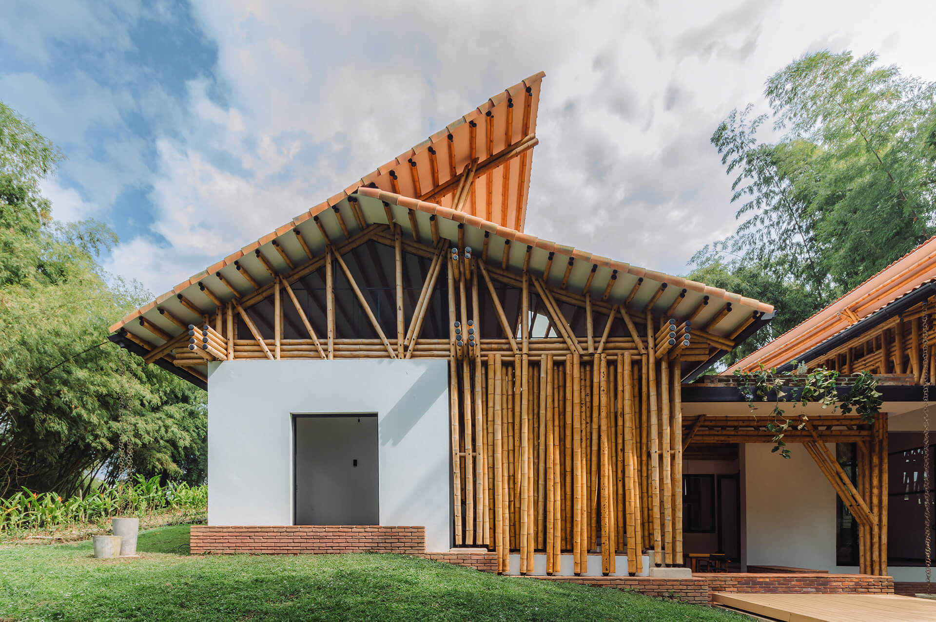 The Colombian architects integrate the principle of assigning specific areas for different activities, famously formulated by Hungarian architect Marcel Breuer. The bamboo architecture is thus, divided into two cores—a leisure wing and a gathering wing. The formal structure housing the leisure areas is enclosed by a gable roof dressed in clay tiles, portioned into three units. In gentle contrast, the gathering area is sheltered by both, a continuous gable roof and a habitable rooftop inspired by the modernist movement.