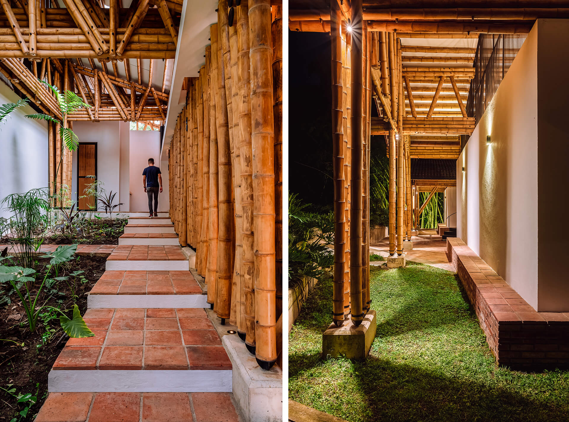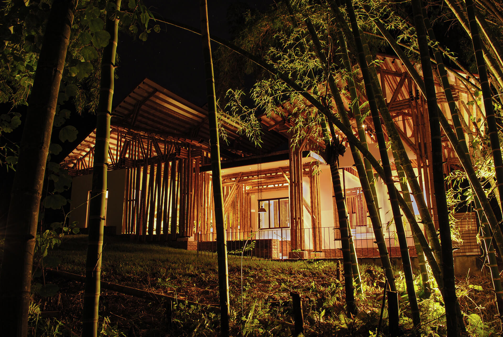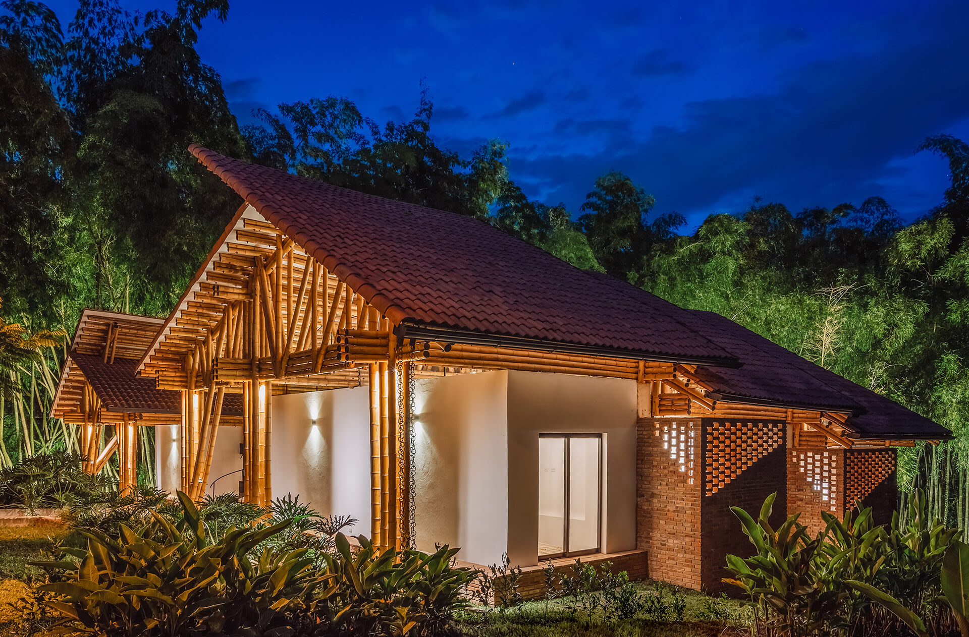 The Colombian architects integrate the principle of assigning specific areas for different activities, famously formulated by Hungarian architect Marcel Breuer. The bamboo architecture is thus, divided into two cores—a leisure wing and a gathering wing. The formal structure housing the leisure areas is enclosed by a gable roof dressed in clay tiles, portioned into three units. In gentle contrast, the gathering area is sheltered by both, a continuous gable roof and a habitable rooftop inspired by the modernist movement.