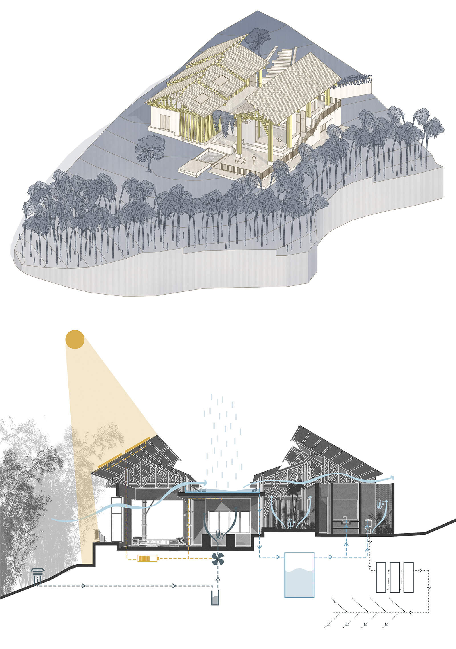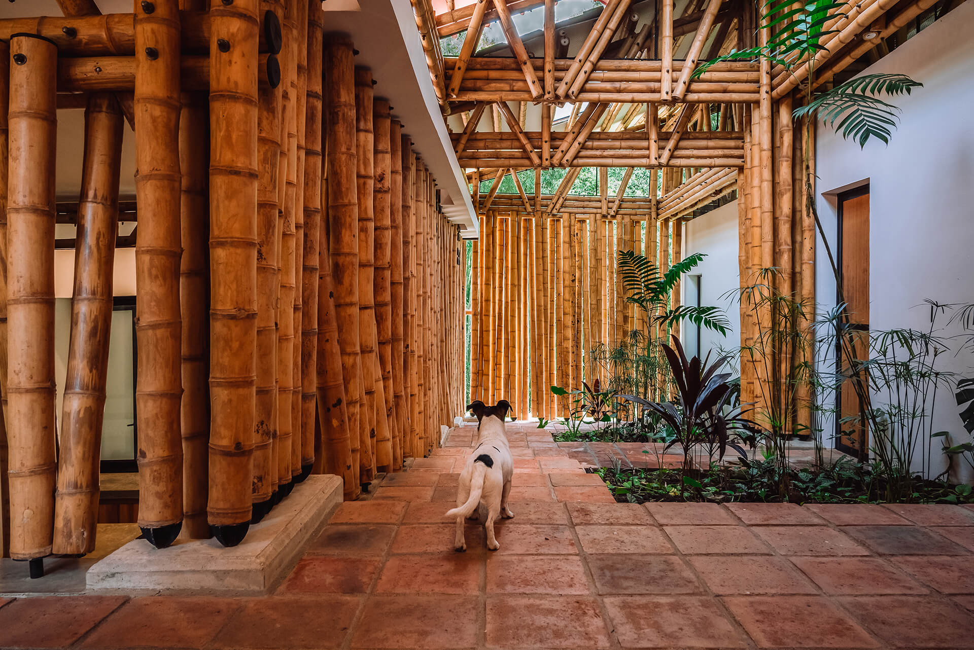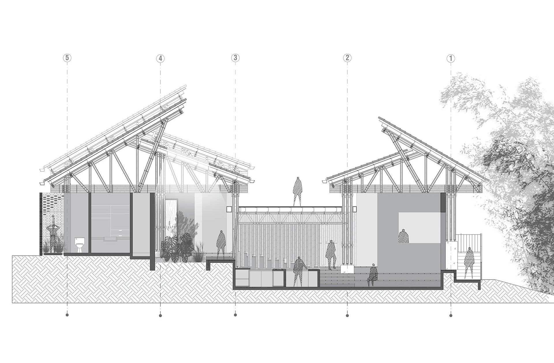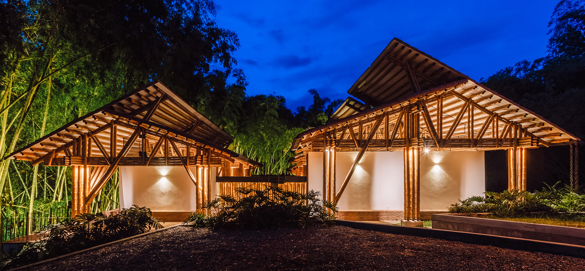The Colombian architects integrate the principle of assigning specific areas for different activities, famously formulated by Hungarian architect Marcel Breuer. The bamboo architecture is thus, divided into two cores—a leisure wing and a gathering wing. The formal structure housing the leisure areas is enclosed by a gable roof dressed in clay tiles, portioned into three units. In gentle contrast, the gathering area is sheltered by both, a continuous gable roof and a habitable rooftop inspired by the modernist movement.