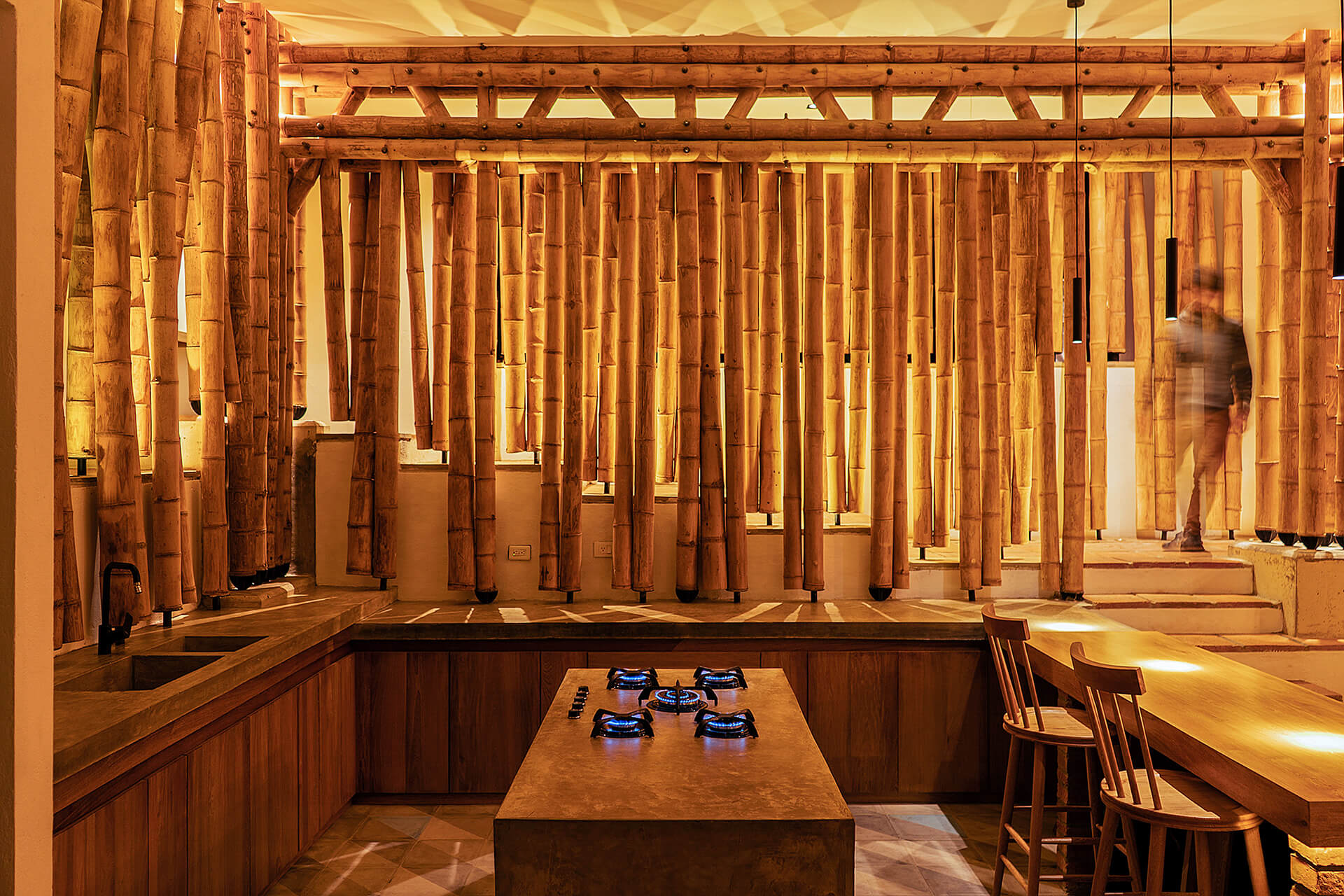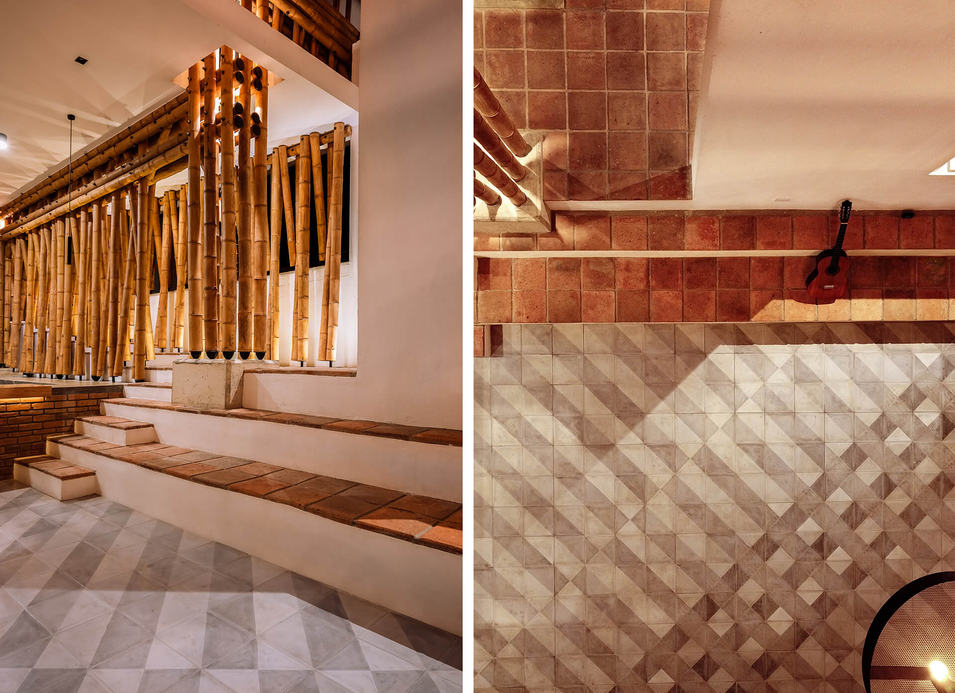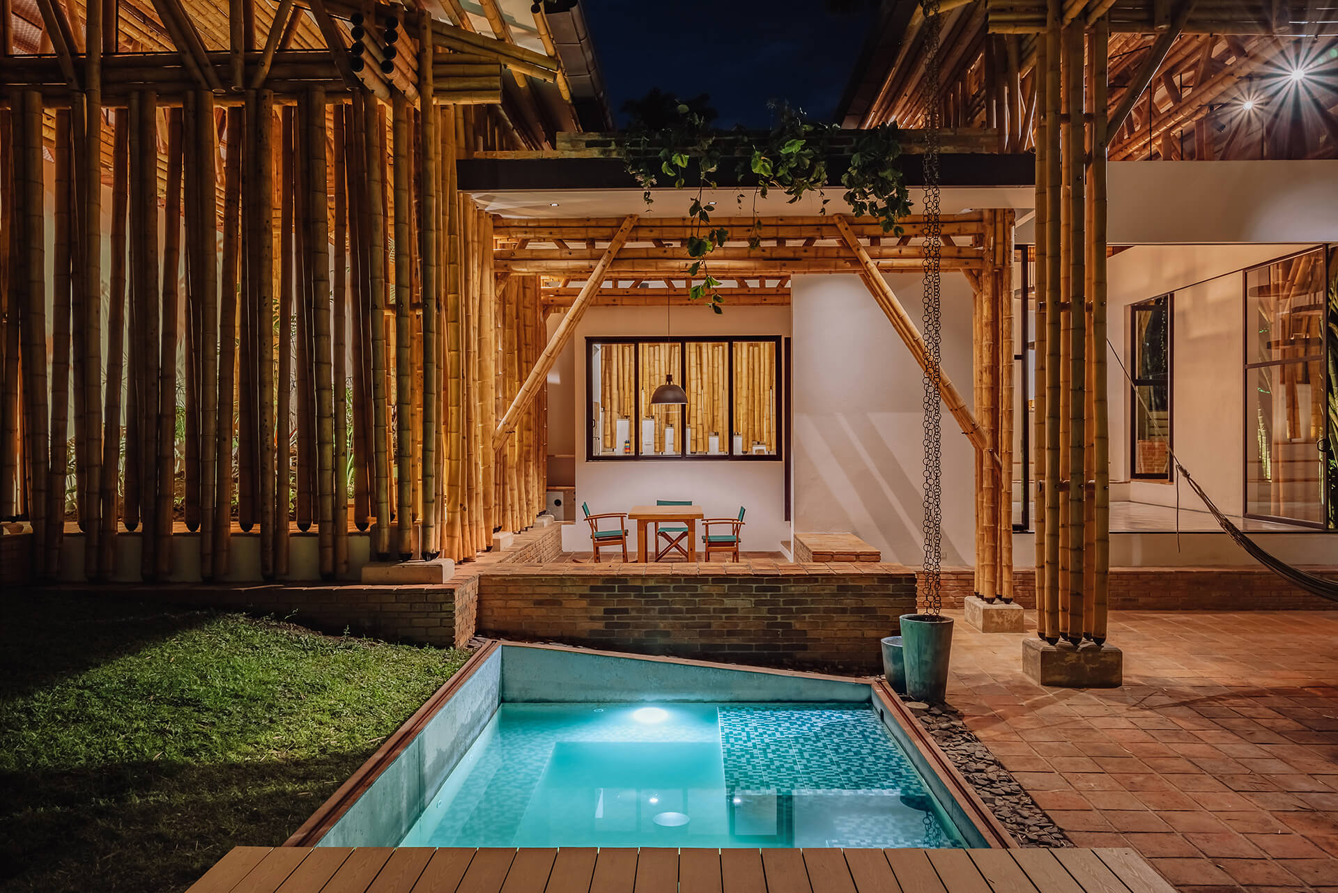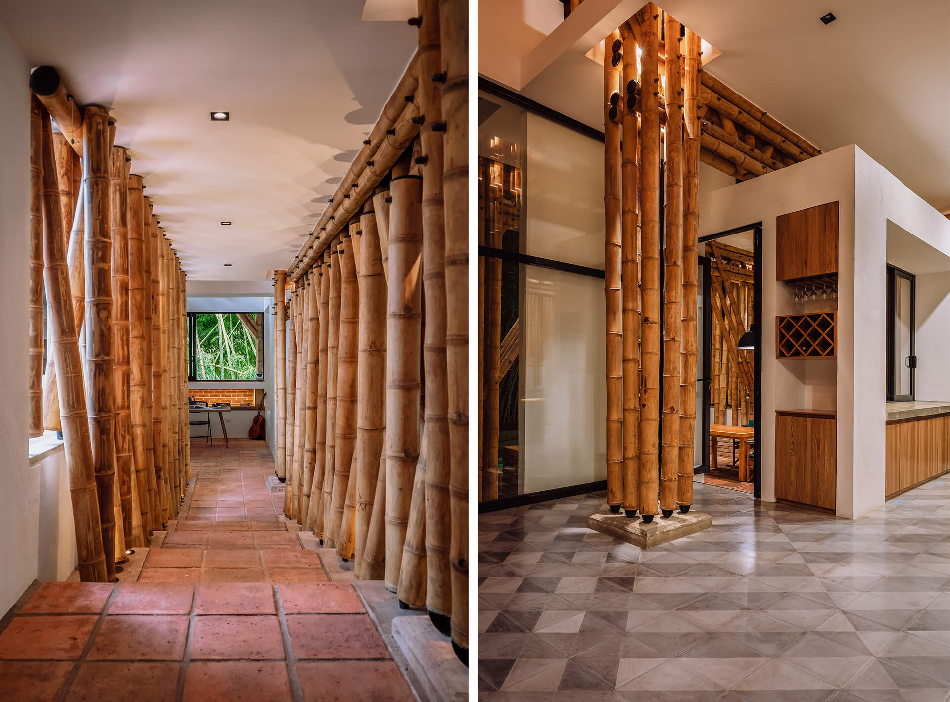 In this way, the leisure and gathering spaces remain in interaction, although irregularly, through a distinct guadua screen. This curtain-like segmentation shapes the façade design, while folding inwards to sew in the vertical guadua into the home. This creates an august entryway descending into the social area, injecting a subtle grandeur to the spatial and architectural character, in tandem with reinforcing the blurred connection between both cores of the private residence.
