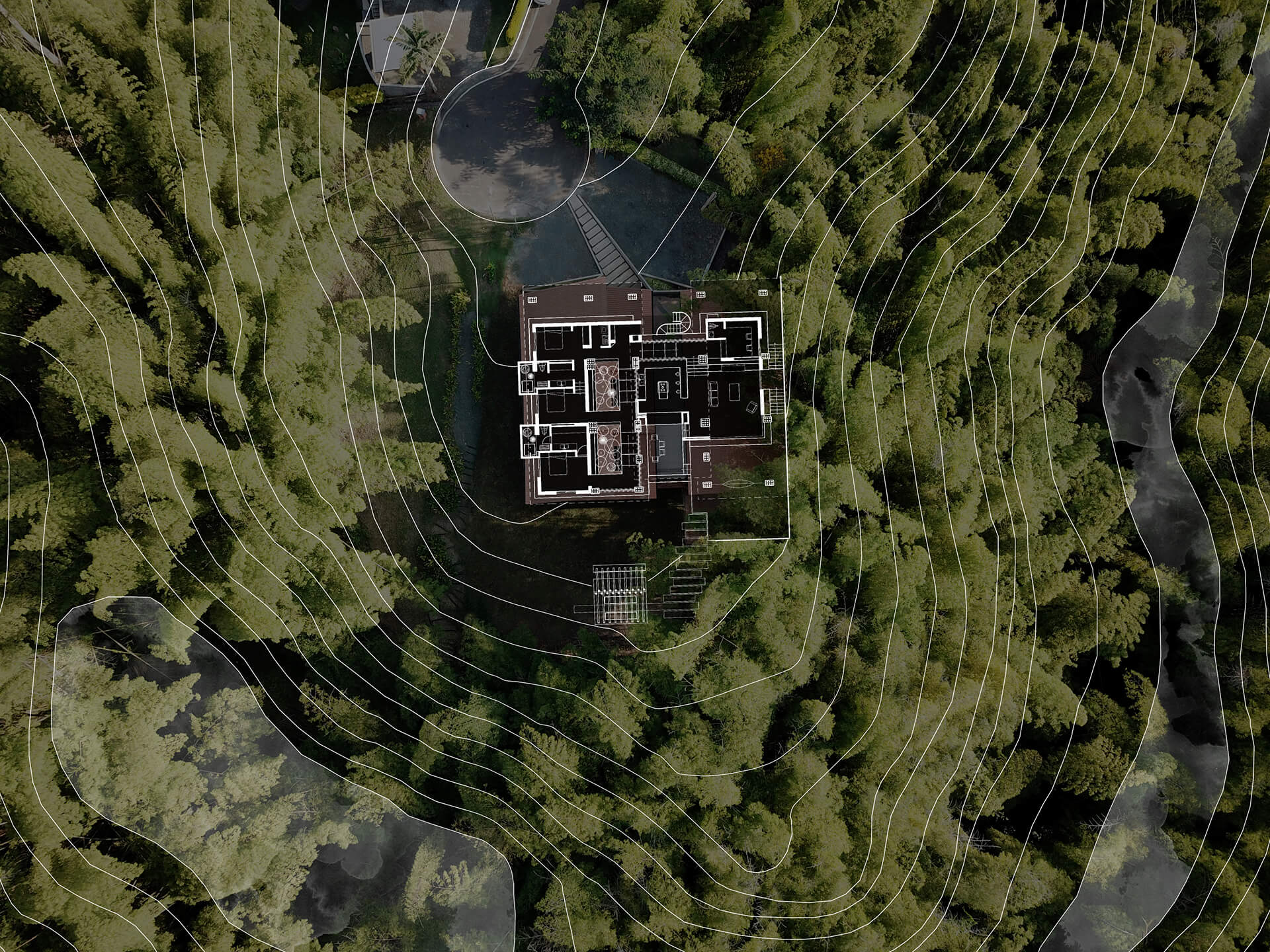 This displacement is mimicked by the arrangement seen in the layered descent adhering to the terrain, where rooms articulating the warm, beige-infested interior design as well as outside areas, are laid out downwards, forming peaceful pockets for lingering and relaxing, with verdant nature for company. Ritmo Arquitectos also convey that the habitable roofing acts as a canal for rainwater harvesting, lying between the traditional clay gable roof which draws a frame enclosing the forest. "This plate, as well as the sculptural folded staircase that leads to it, give off a breath of modernity among traditional archetypes," they add.