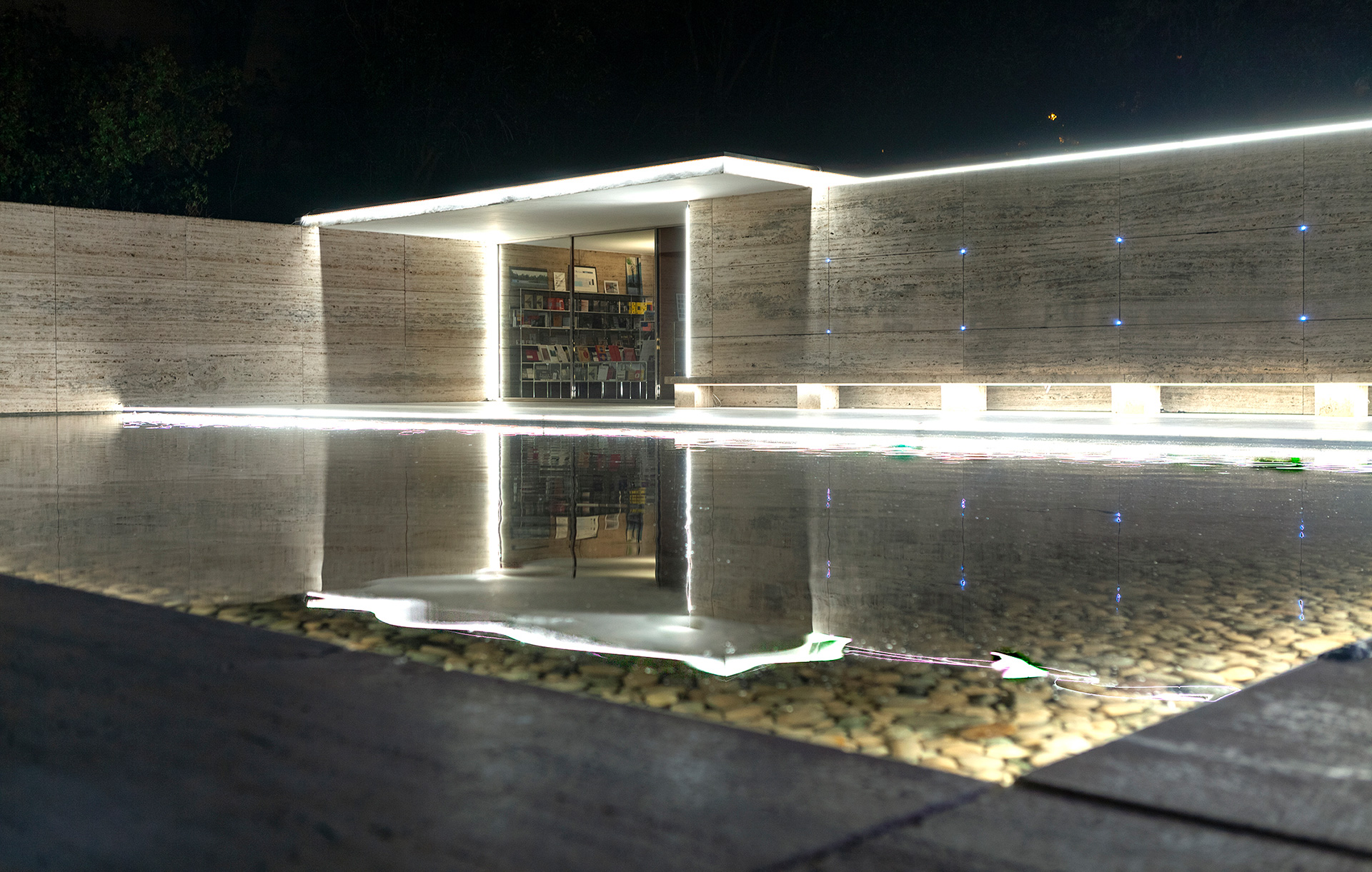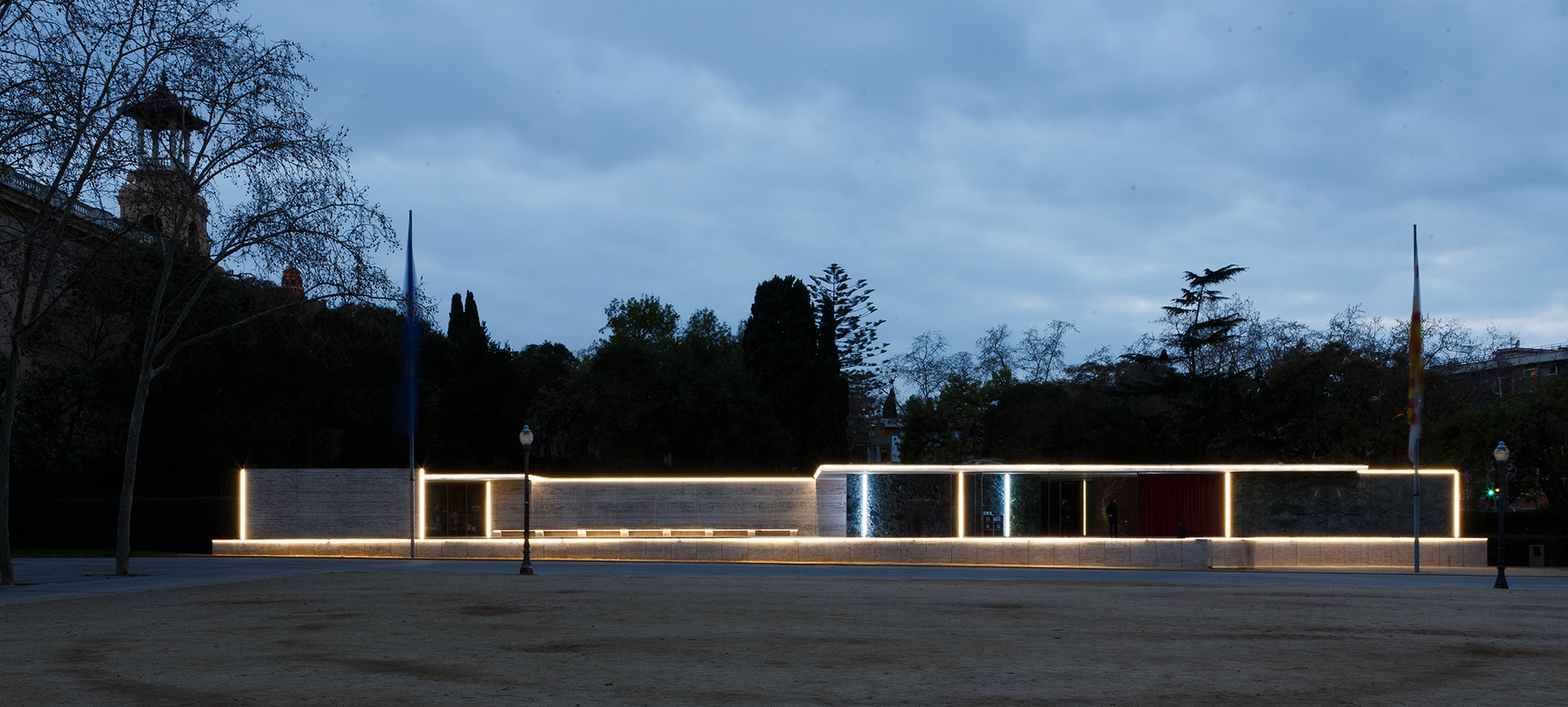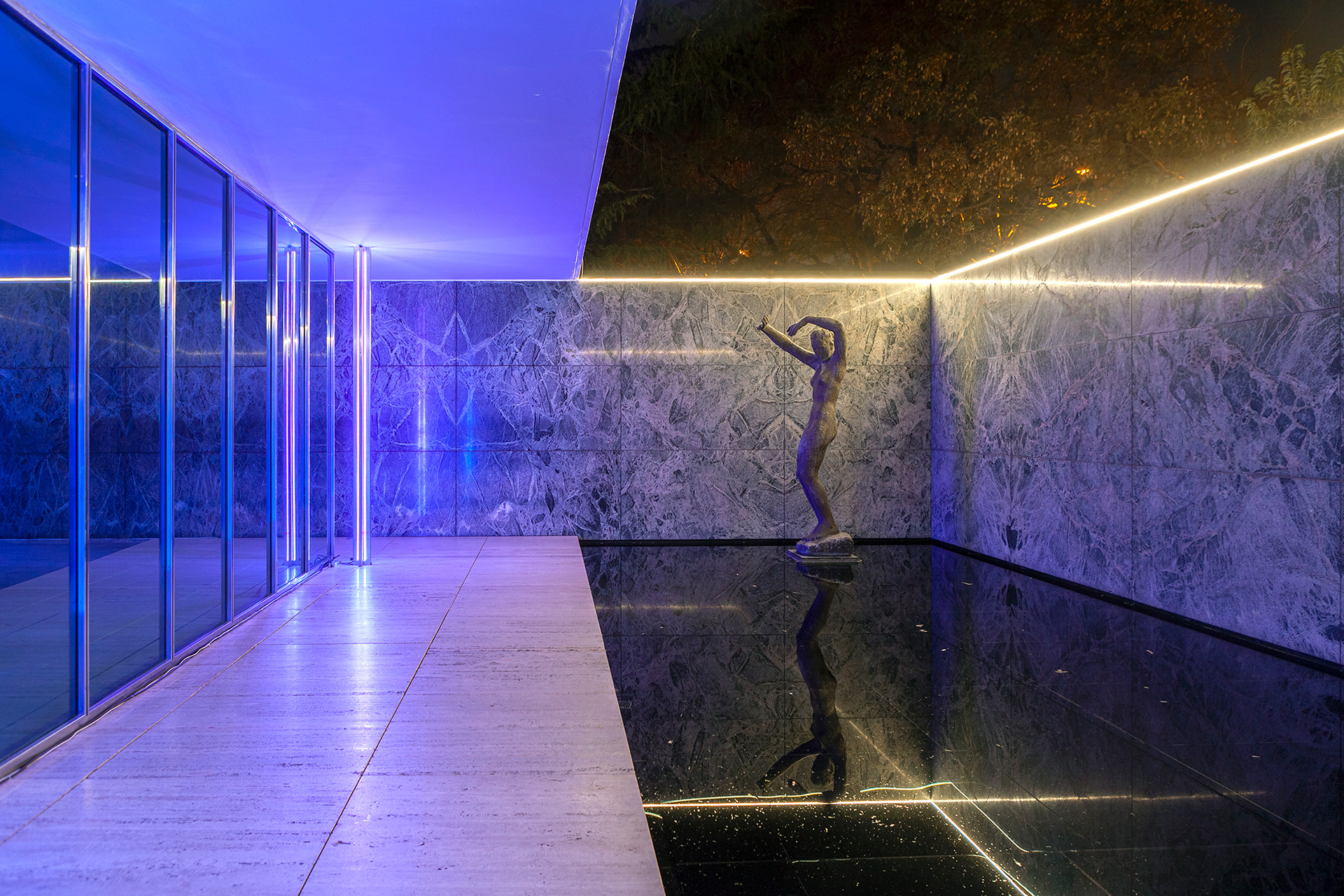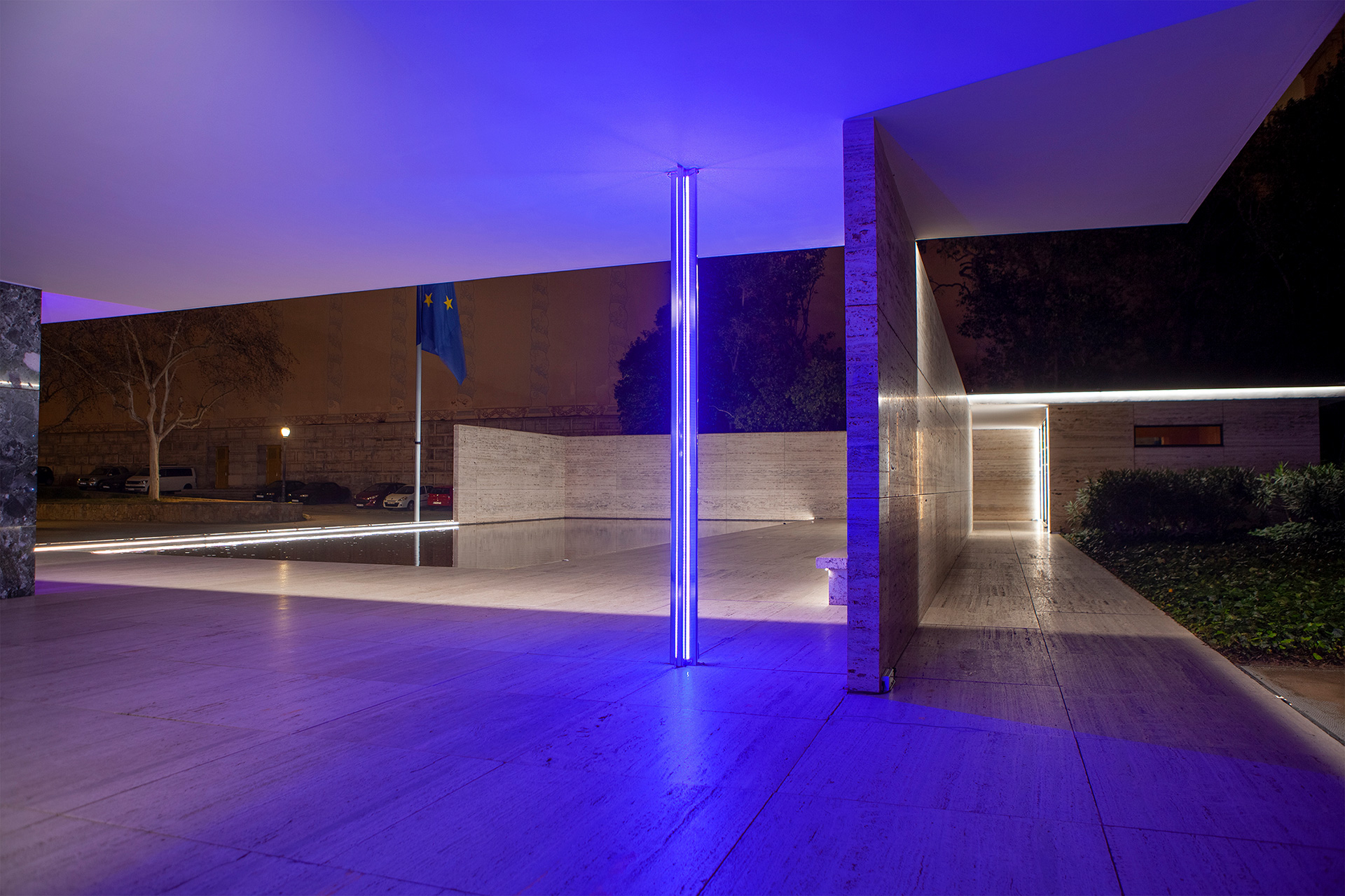 The projection of light and colour accentuates the pavilion’s horizontal horizon from the front esplanade and change the perception of its radical plastic beauty. – Fundació Mies van der Rohe